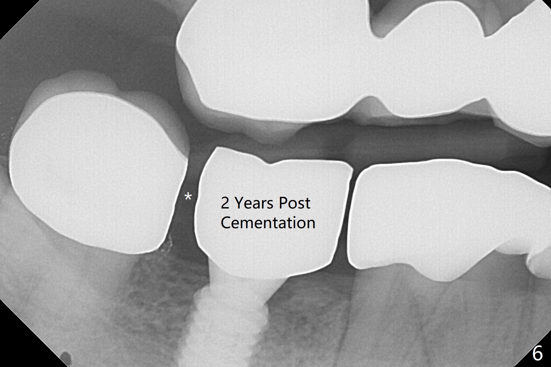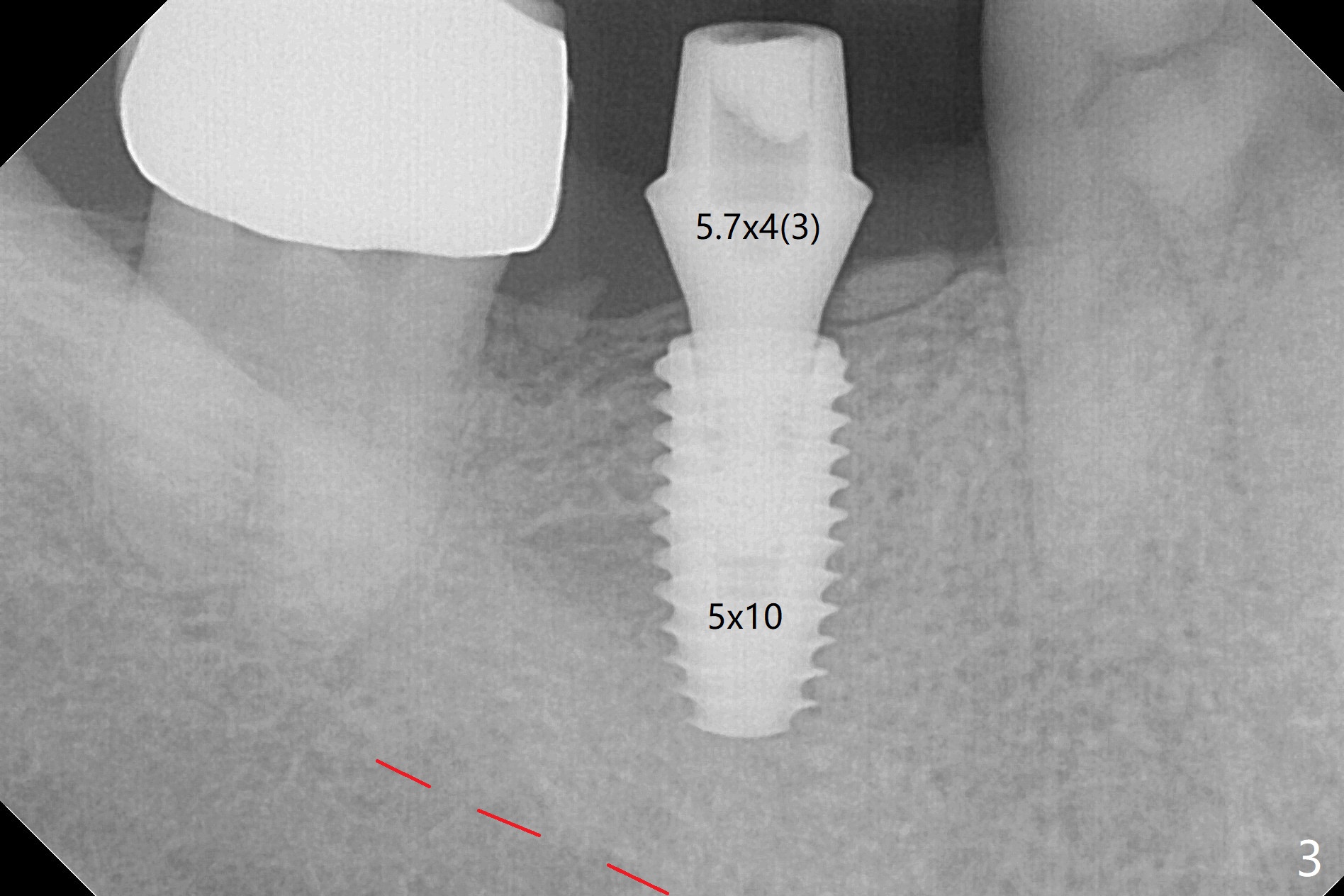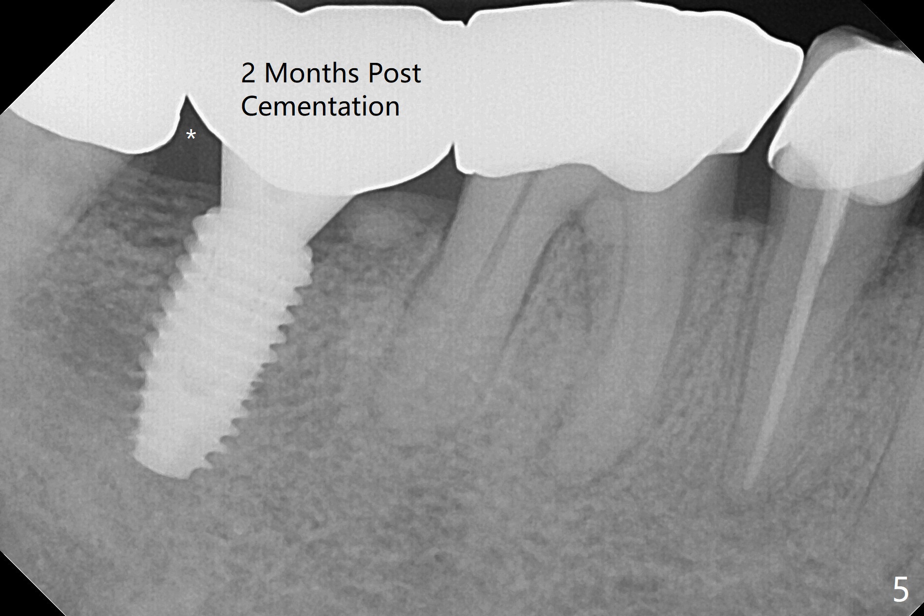 The edentulous ridge at #31 is anesthetized with one carpule of Lidocaine in an infiltration manner for guided surgery (Fig.1,2). In comparison, two or 3 carpules of Lidocaine are required for anesthesia for delayed implant placement without guide. It suggests that guided surgery is associated with less pain. Besides, the implant placed with guide has good trajectory and depth in a timely manner (Fig.3). Since the patient is a heavy bruxer with dislodgement of #30 provisional and #19 abutment screw loosening, a 5.7x4(3) mm cementation abutment is placed immediately so that a splinted provisional is fabricated for #30 and 31 for better retention. However, the gingiva around the implant at #31 is unhealthy 3 months postop (Fig.4). After impression, the provisional at #31 is sectioned without recementation for better oral hygiene. The distal gingival embrasure is large, associated with food impaction (Fig.5). Two years post cementation, the proximal contacts are trimmed (Fig.6 *) for pick up impression for crown repair. The implant and abutment contact is clearly shown with change in X-ray projection (Fig.7). When the new crown with flattened proximal contacts is being seated, it is tight mainly distal. After distal proximal contact adjustment, the crown is recemented without taking out crown/abutment for residual cement removal, because they may be unable to be completely seated because of the flattened larger proximal contacts (hand torque before impression).