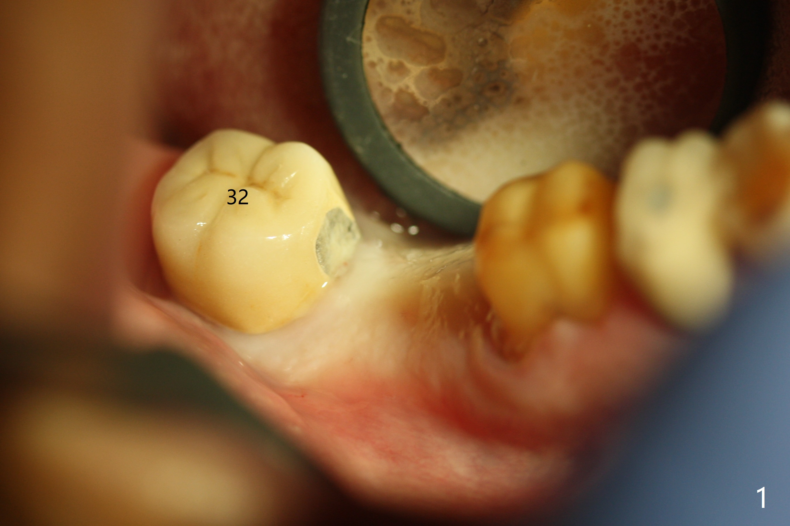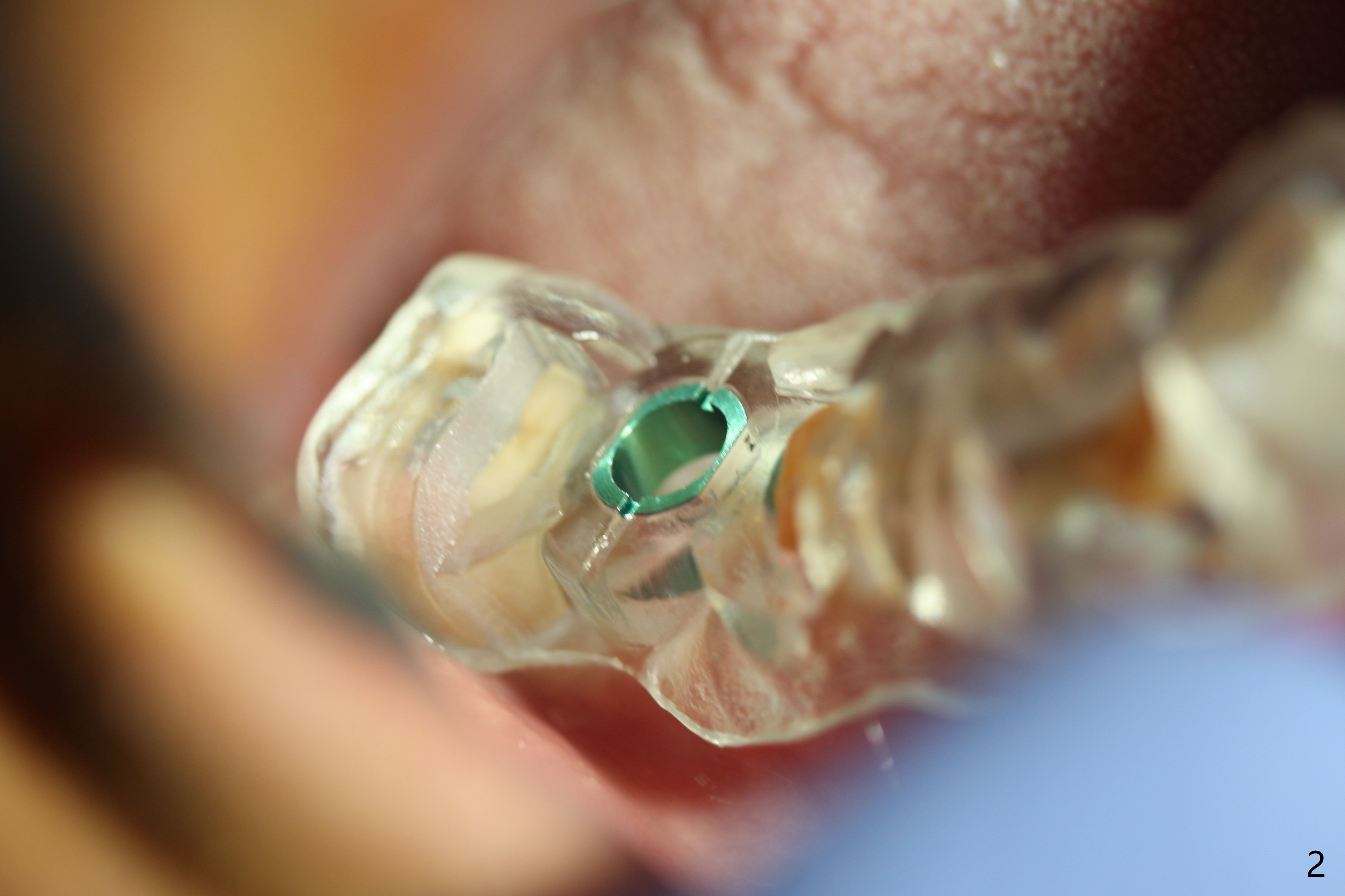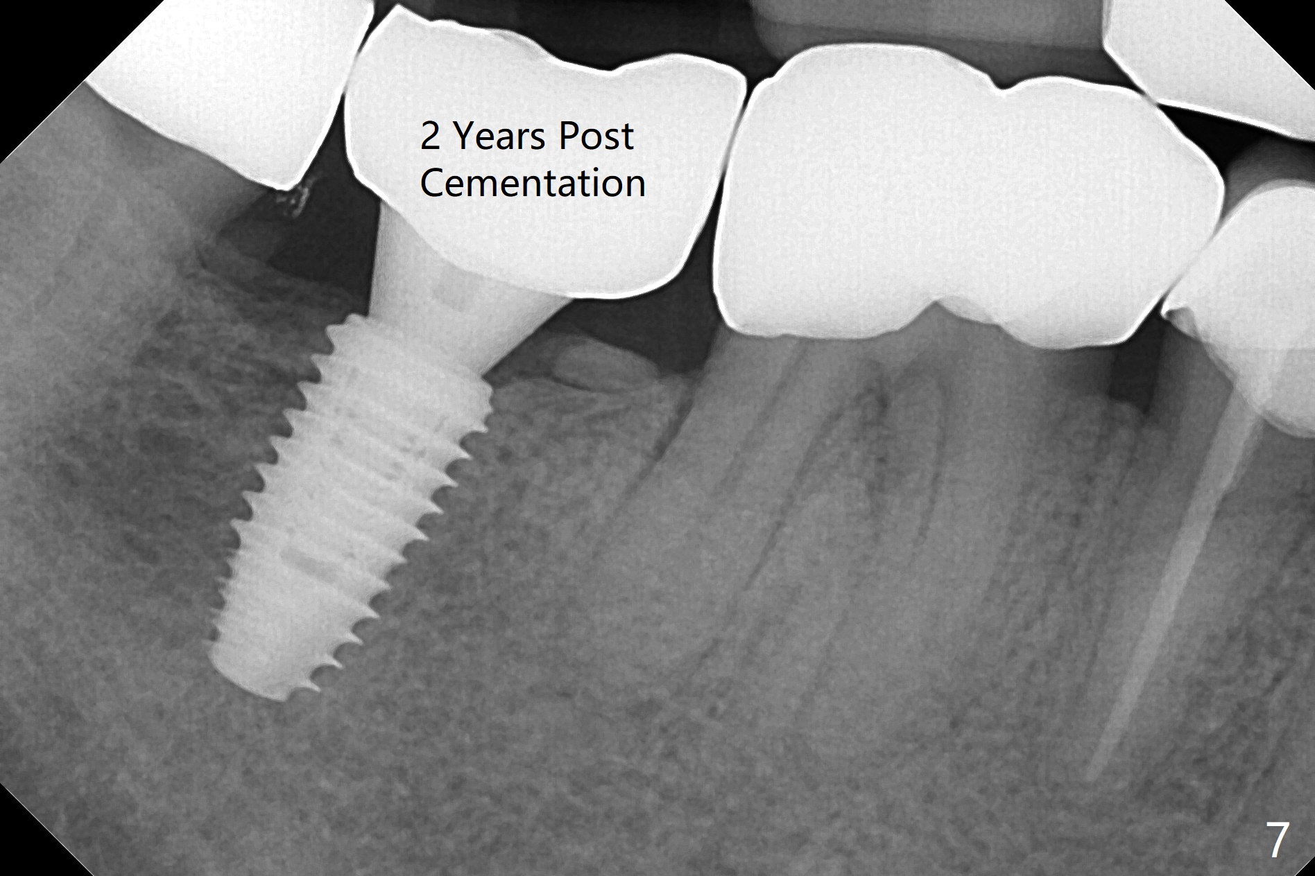 The edentulous ridge at #31 is anesthetized with one carpule of Lidocaine in an infiltration manner for guided surgery (Fig.1,2). In comparison, two or 3 carpules of Lidocaine are required for anesthesia for delayed implant placement without guide. It suggests that guided surgery is associated with less pain. Besides, the implant placed with guide has good trajectory and depth in a timely manner (Fig.3). Since the patient is a heavy bruxer with dislodgement of #30 provisional and #19 abutment screw loosening, a 5.7x4(3) mm cementation abutment is placed immediately so that a splinted provisional is fabricated for #30 and 31 for better retention. However, the gingiva around the implant at #31 is unhealthy 3 months postop (Fig.4). After impression, the provisional at #31 is sectioned without recementation for better oral hygiene. The distal gingival embrasure is large, associated with food impaction (Fig.5). Two years post cementation, the proximal contacts are trimmed (Fig.6 *) for pick up impression for crown repair. The implant and abutment contact is clearly shown with change in X-ray projection (Fig.7). When the new crown with flattened proximal contacts is being seated, it is tight mainly distal. After distal proximal contact adjustment, the crown is recemented without taking out crown/abutment for residual cement removal, because they may be unable to be completely seated because of the flattened larger proximal contacts (hand torque before impression).