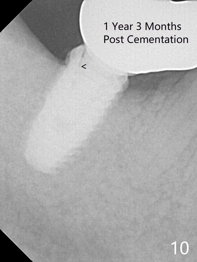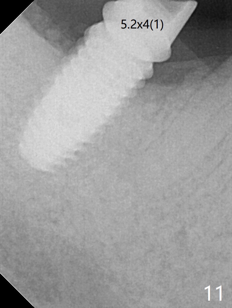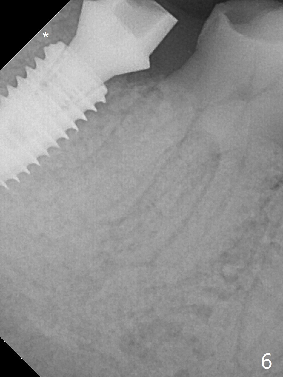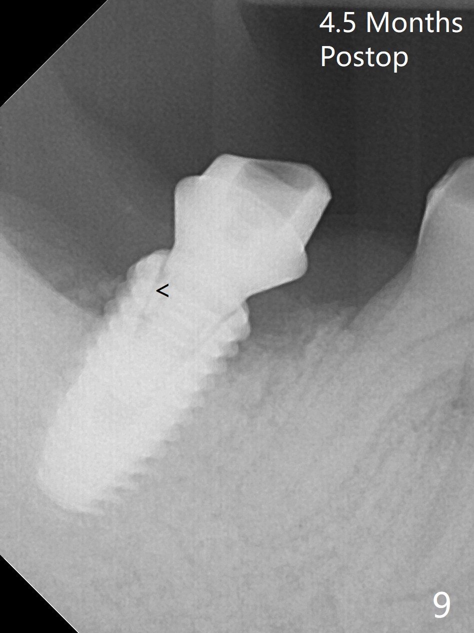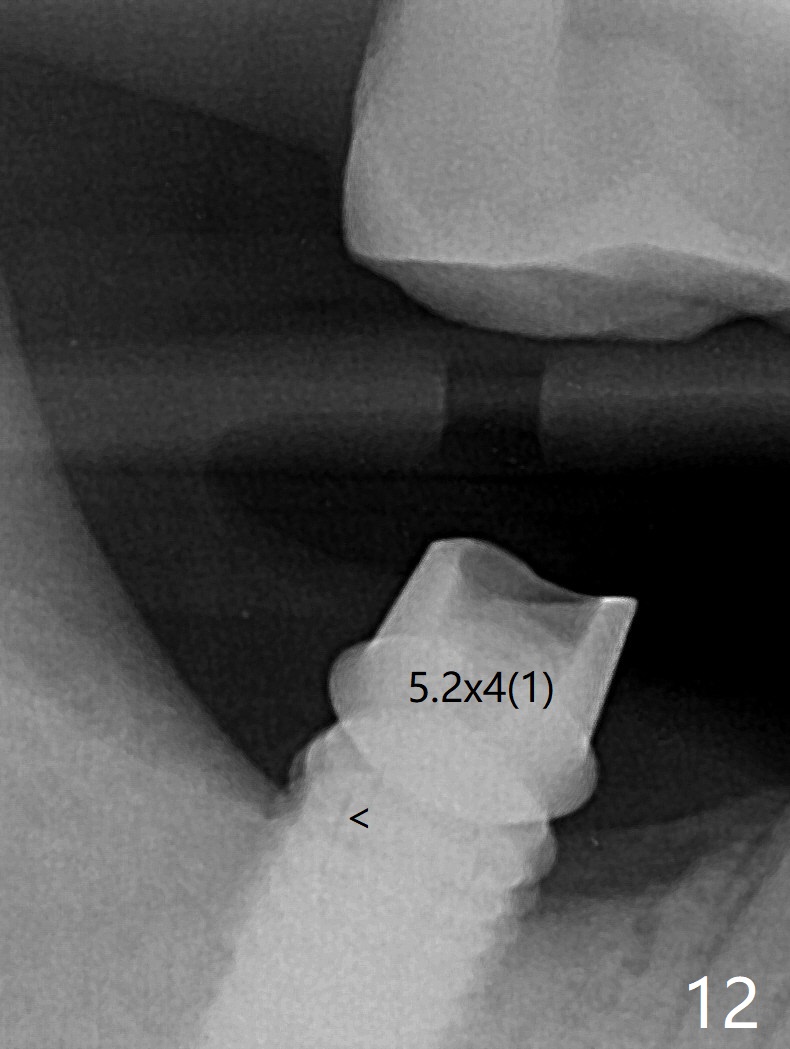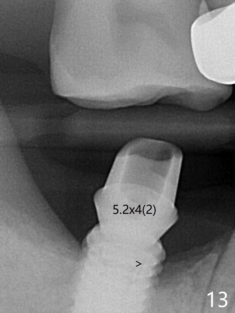 The residual roots of the tooth #31 are lower buccal (Fig.1 B), which in fact is molded and worn by the supraerupted tooth #2. When the tooth is extracted (Fig.2) and an implant, abutment (Fig.3 gold colored) and allograft (*) are placed, the abutment has to be trimmed. An atypical immediate provisional is fabricated by spreading setting acrylic over the abutment and bone graft (Fig.4 P) with occlusal equilibrium. Advantages of the guided surgery are good position (Fig.3 buccolingual), trajectory and depth (Fig.5,6) of the implant. The buccodistally exposed implant threads are packed with allograft in sufficient amount (Fig.3,5,6 *). The atypical immediate provisional breaks down and dislodges 3 weeks postop (Fig.7). In fact the implant plateau is exposed buccally. A monojet is given to the patient for self cleansing. He is instructed to return in 3 weeks. The exposed implant threads are covered 1.5 months postop (Fig.8). Incomplete abutment seating (Fig.9 <) was not noted until 1 year 3 month post cementation when the crown was mobile (Fig.10). A 6x3 mm healing abutment is placed. Three days later, the crown is sectioned and separated from the abutment. The latter returns to place; due to angulation associated with PA, the gap between the implant and abutment is indistinct (Fig.11). Bitewing is taken; the gap exists (Fig.12 <). The abutment seems to be seated deep; there is apparently soft tissue interference. A 5.2x4(2) mm abutment remains incompletely seated (Fig.13 >). A 5.2x4(3) mm one is completely seated (Fig.14 <). Zirconium crown with an access hole is cemented in the mouth. The crown and abutment is then removed for residual cement removal and reseated and torqued (Fig.15). Four months later, the Zirconium crown is fractured (Fig.16). Impression is retaken for high noble metal crown without access hole for strength (Fig.17).