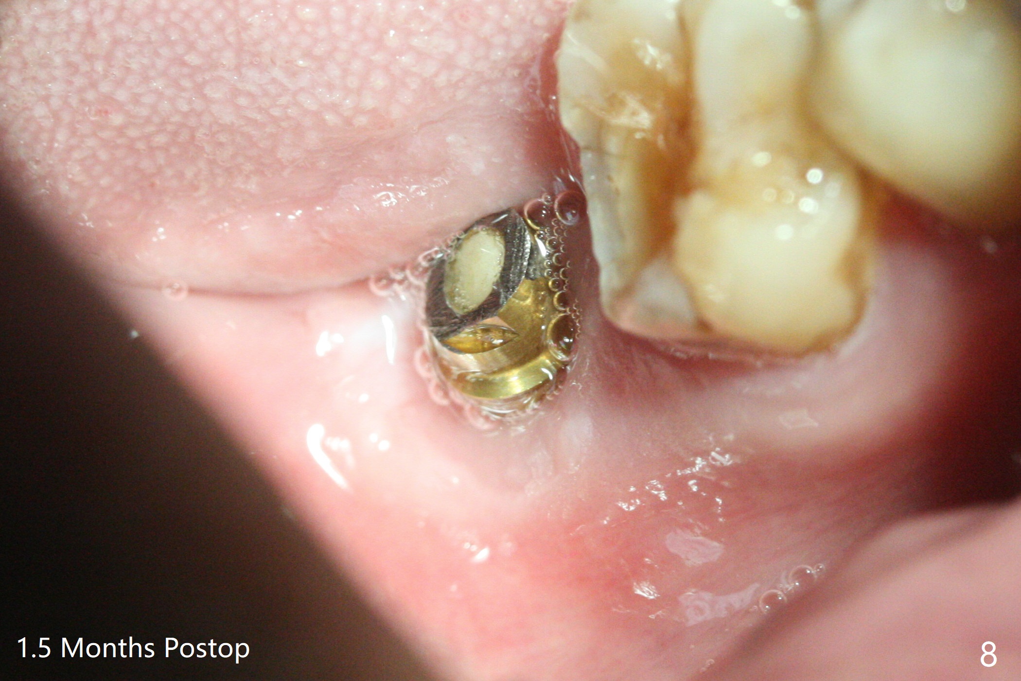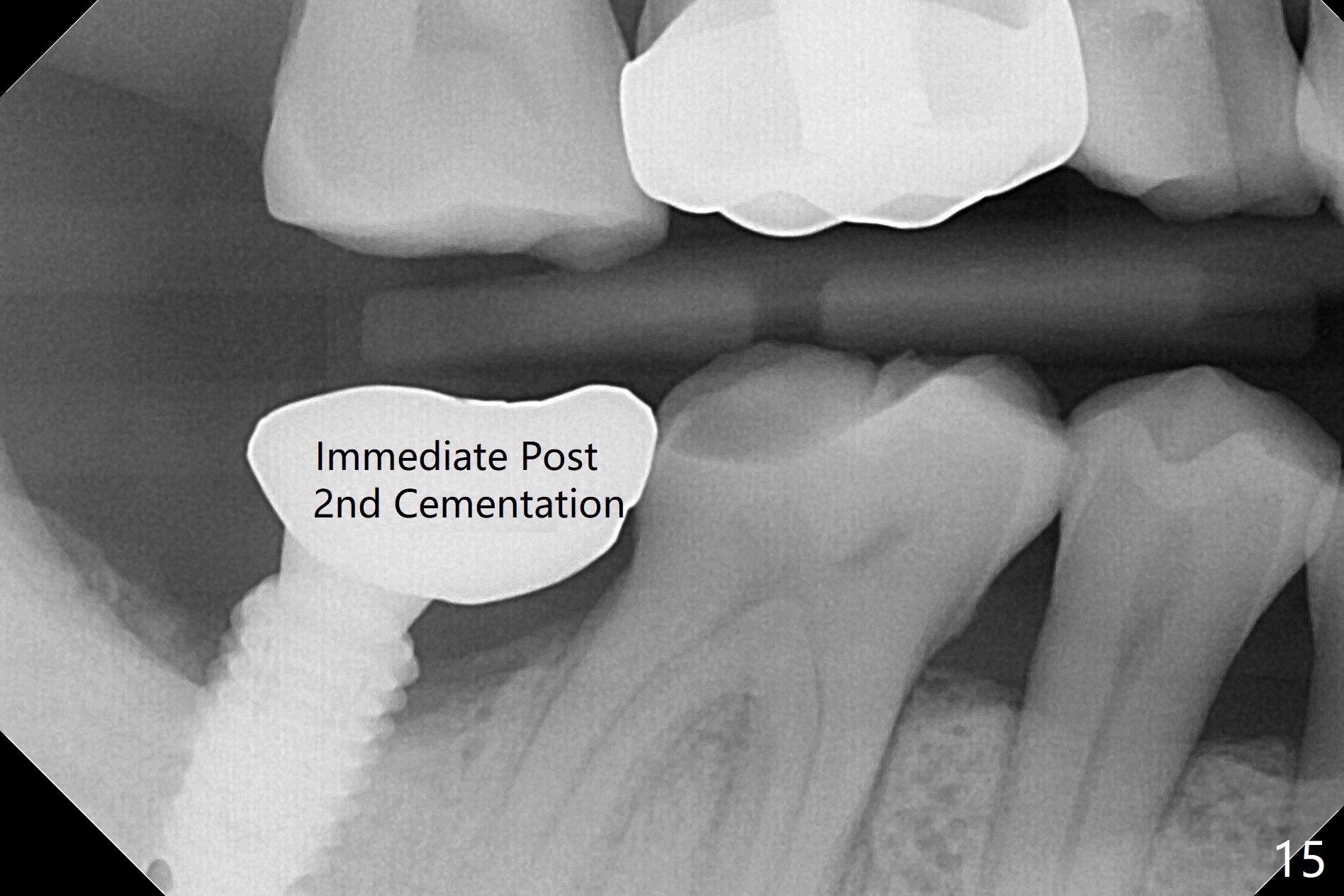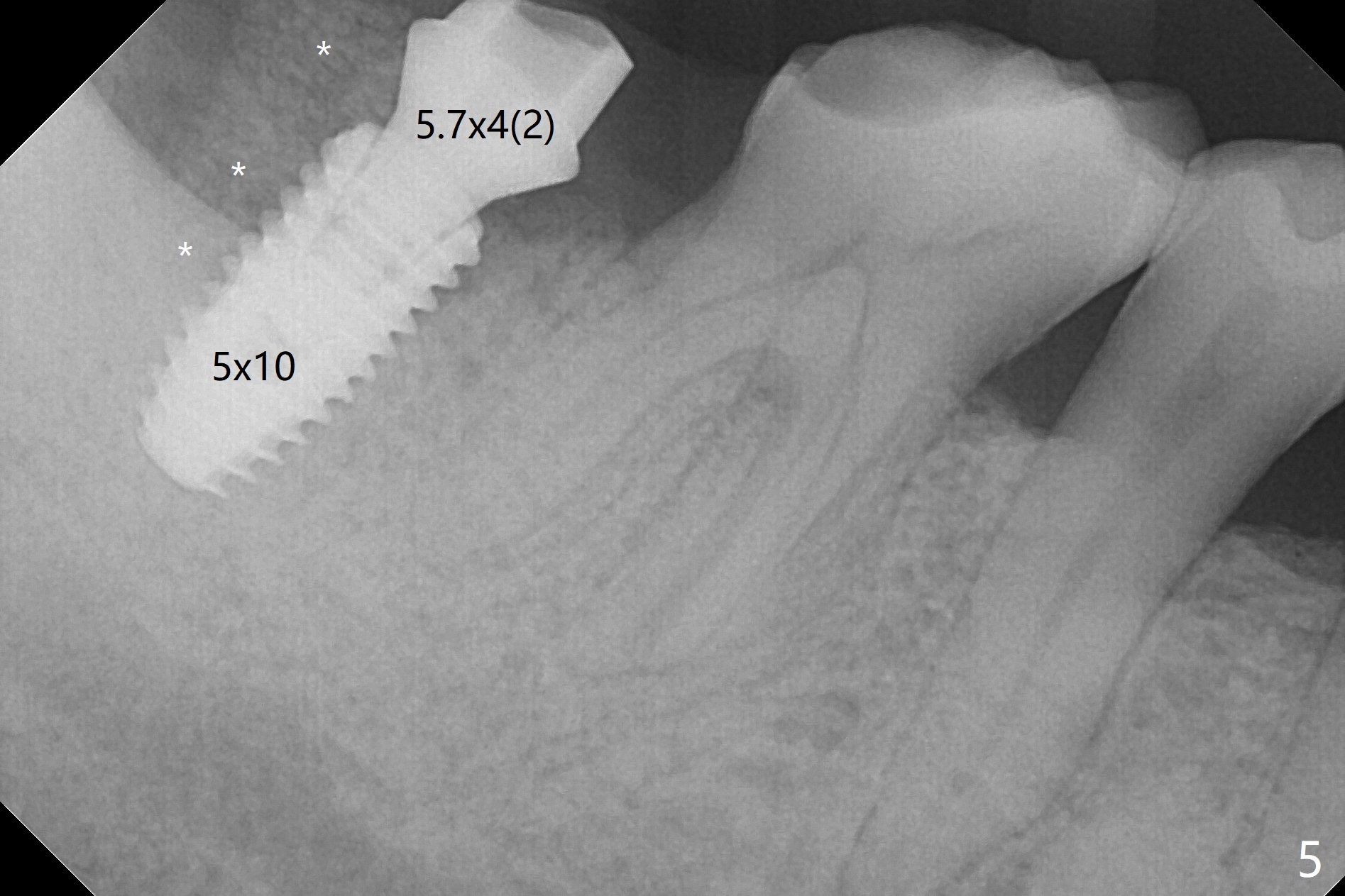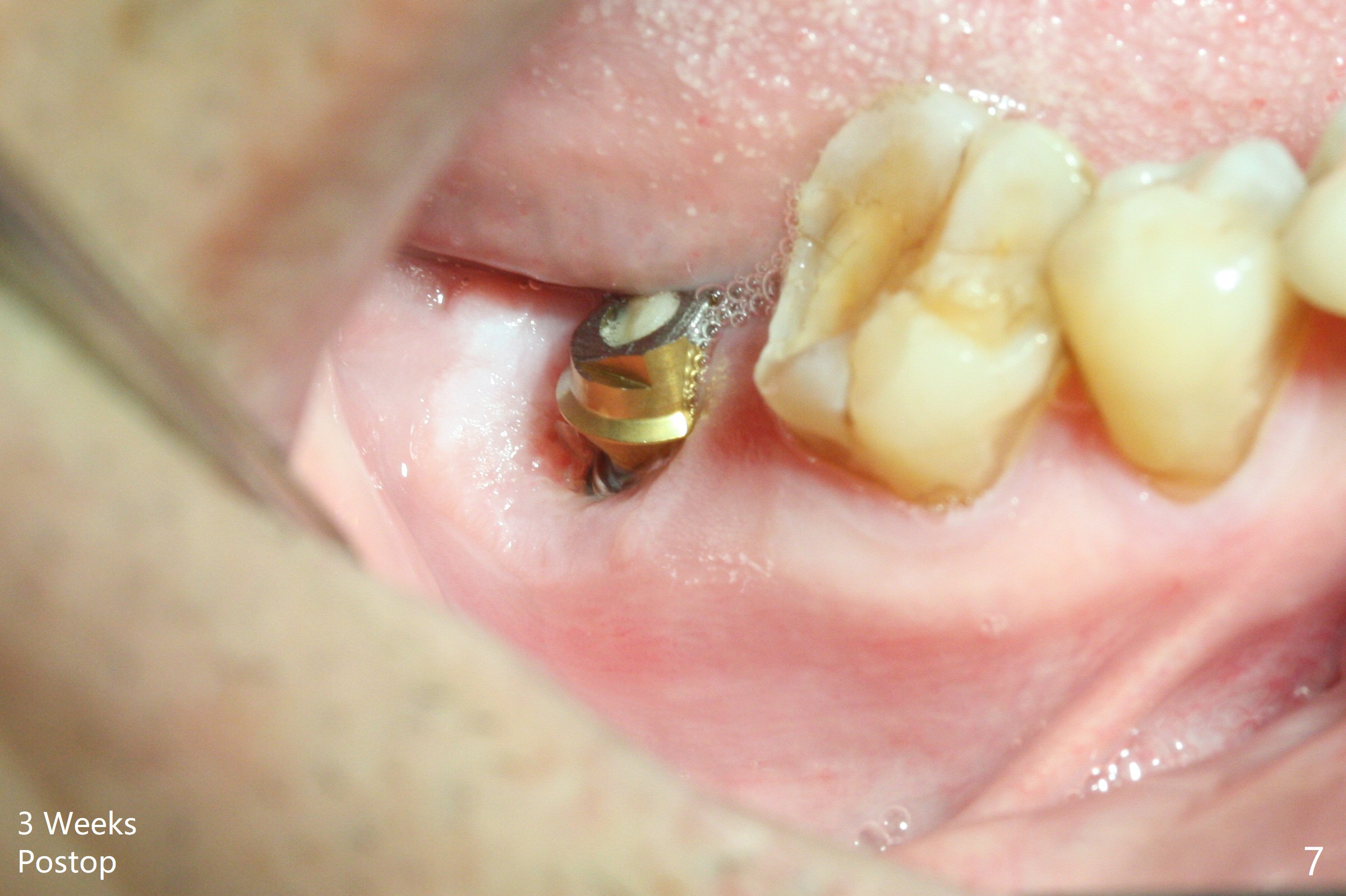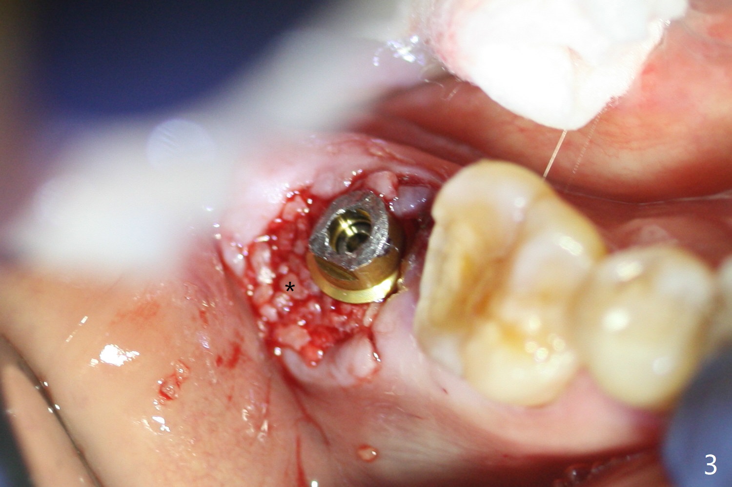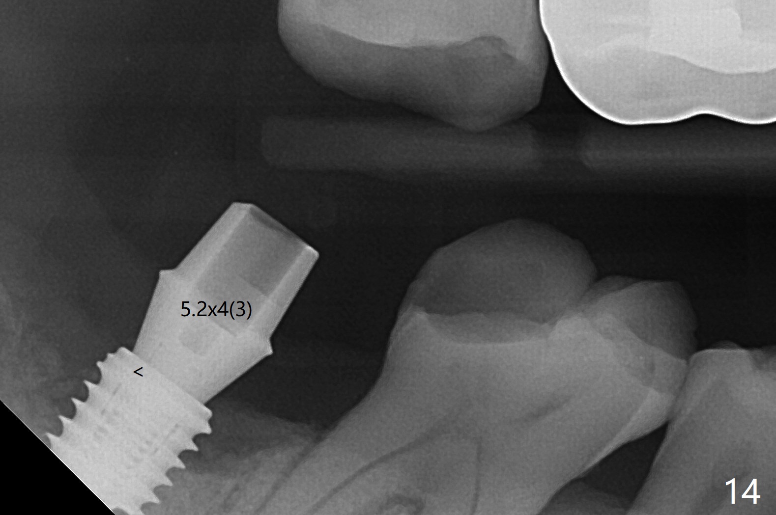 The residual roots of the tooth #31 are lower buccal (Fig.1 B), which in fact is molded and worn by the supraerupted tooth #2. When the tooth is extracted (Fig.2) and an implant, abutment (Fig.3 gold colored) and allograft (*) are placed, the abutment has to be trimmed. An atypical immediate provisional is fabricated by spreading setting acrylic over the abutment and bone graft (Fig.4 P) with occlusal equilibrium. Advantages of the guided surgery are good position (Fig.3 buccolingual), trajectory and depth (Fig.5,6) of the implant. The buccodistally exposed implant threads are packed with allograft in sufficient amount (Fig.3,5,6 *). The atypical immediate provisional breaks down and dislodges 3 weeks postop (Fig.7). In fact the implant plateau is exposed buccally. A monojet is given to the patient for self cleansing. He is instructed to return in 3 weeks. The exposed implant threads are covered 1.5 months postop (Fig.8). Incomplete abutment seating (Fig.9 <) was not noted until 1 year 3 month post cementation when the crown was mobile (Fig.10). A 6x3 mm healing abutment is placed. Three days later, the crown is sectioned and separated from the abutment. The latter returns to place; due to angulation associated with PA, the gap between the implant and abutment is indistinct (Fig.11). Bitewing is taken; the gap exists (Fig.12 <). The abutment seems to be seated deep; there is apparently soft tissue interference. A 5.2x4(2) mm abutment remains incompletely seated (Fig.13 >). A 5.2x4(3) mm one is completely seated (Fig.14 <). Zirconium crown with an access hole is cemented in the mouth. The crown and abutment is then removed for residual cement removal and reseated and torqued (Fig.15). Four months later, the Zirconium crown is fractured (Fig.16). Impression is retaken for high noble metal crown without access hole for strength (Fig.17).
