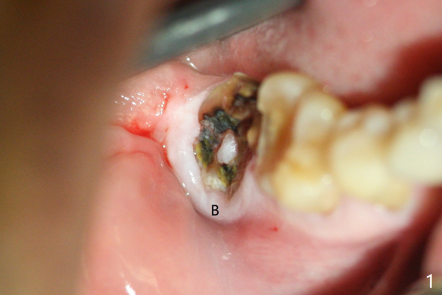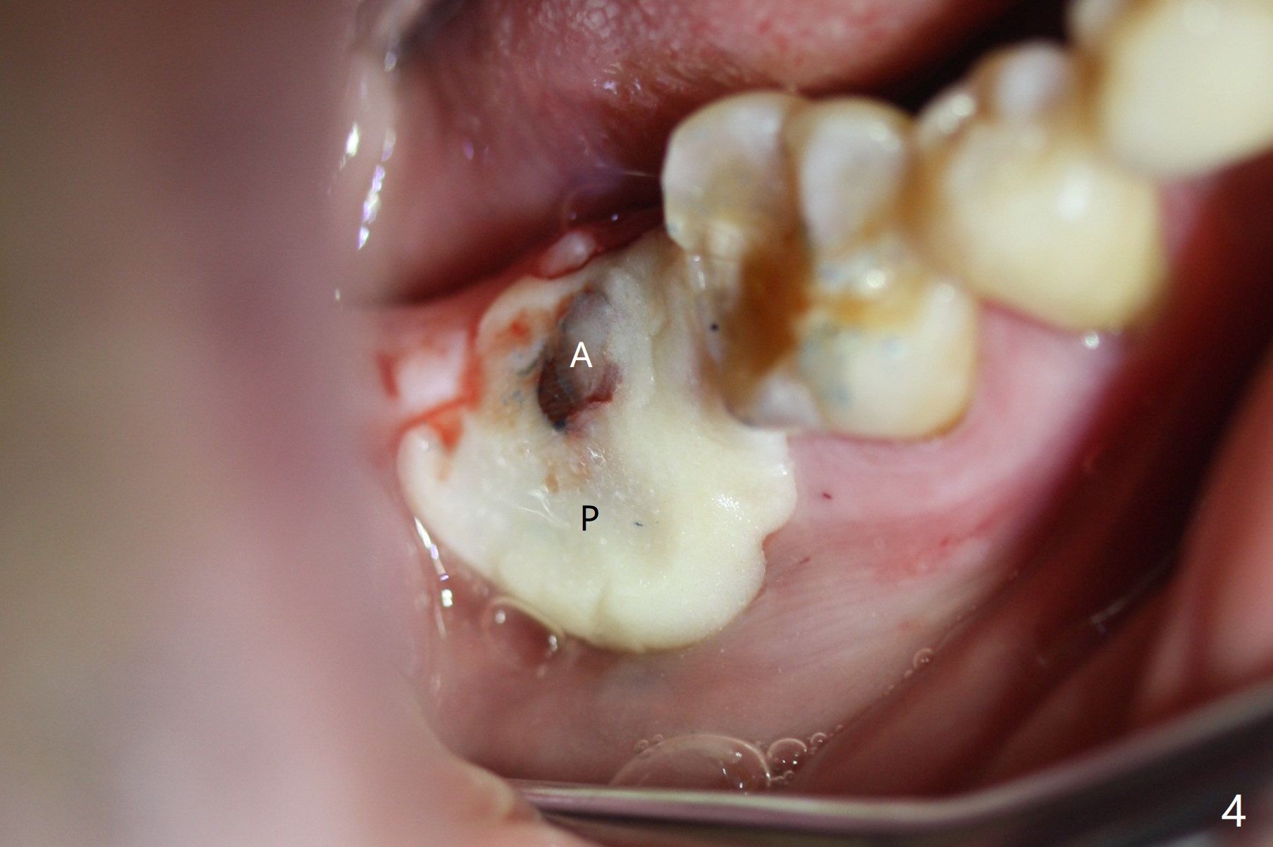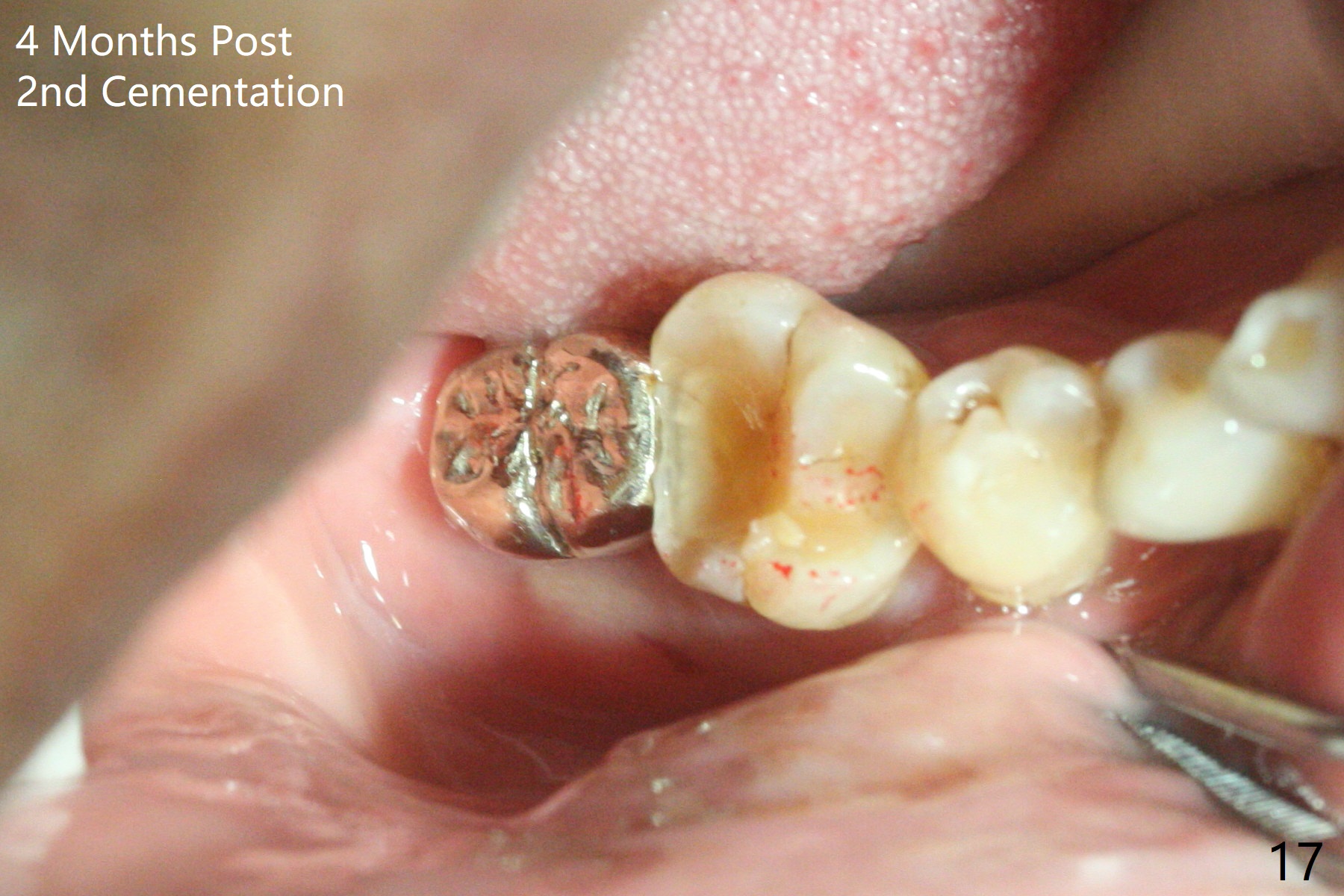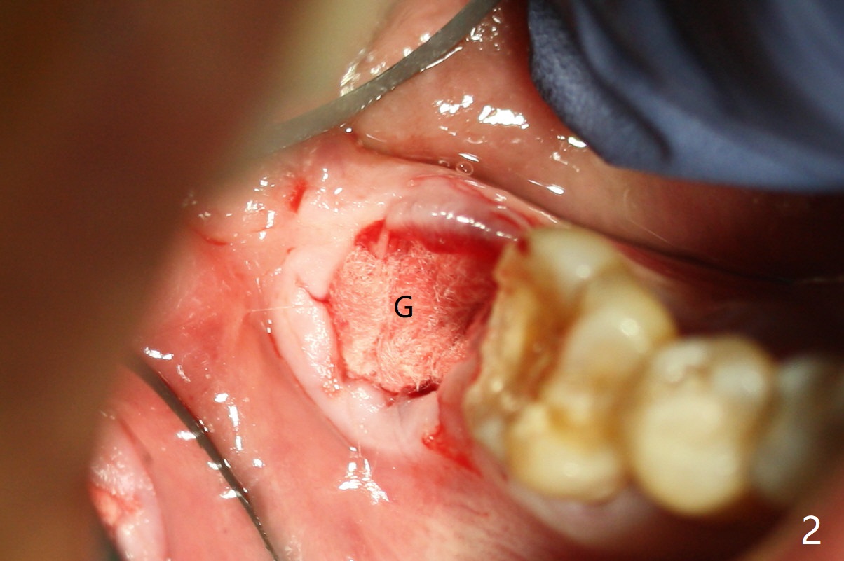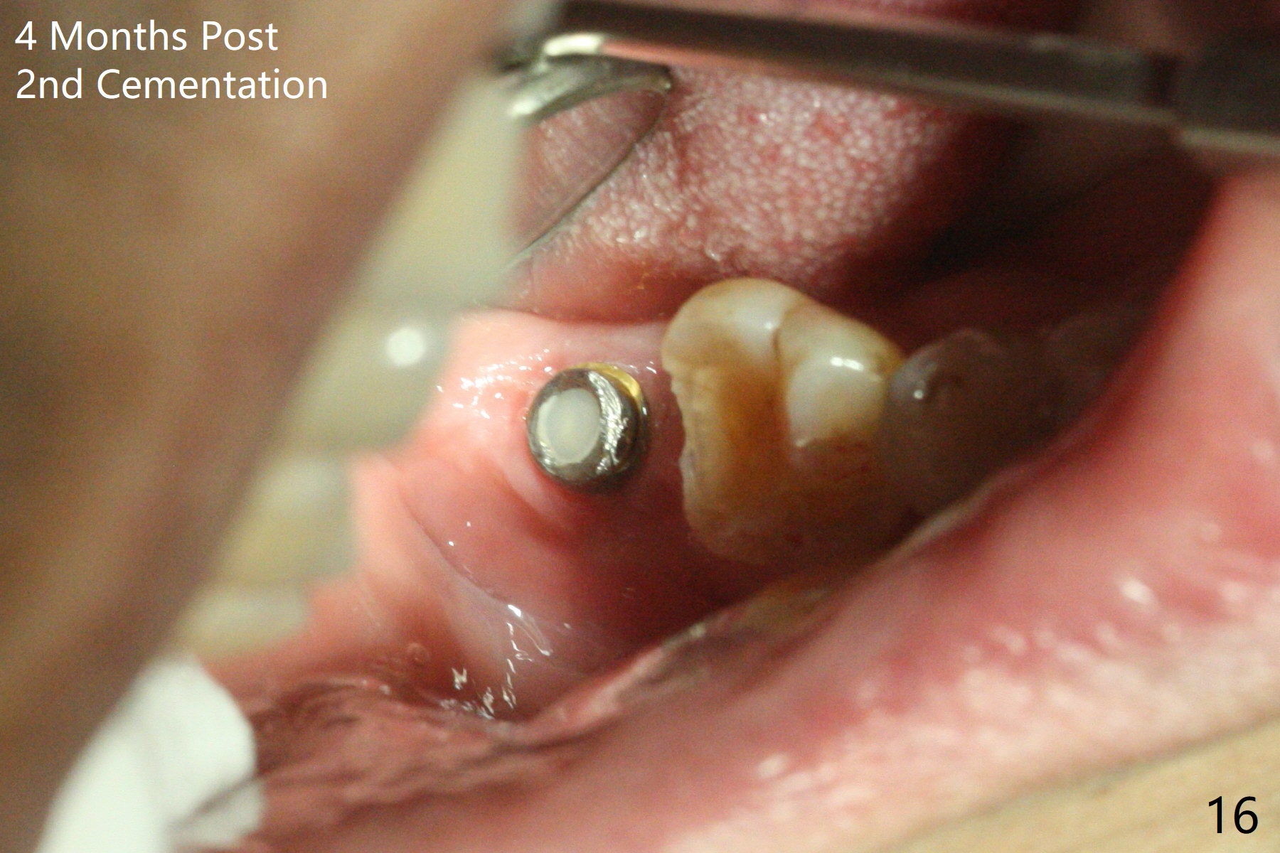 The residual roots of the tooth #31 are lower buccal (Fig.1 B), which in fact is molded and worn by the supraerupted tooth #2. When the tooth is extracted (Fig.2) and an implant, abutment (Fig.3 gold colored) and allograft (*) are placed, the abutment has to be trimmed. An atypical immediate provisional is fabricated by spreading setting acrylic over the abutment and bone graft (Fig.4 P) with occlusal equilibrium. Advantages of the guided surgery are good position (Fig.3 buccolingual), trajectory and depth (Fig.5,6) of the implant. The buccodistally exposed implant threads are packed with allograft in sufficient amount (Fig.3,5,6 *). The atypical immediate provisional breaks down and dislodges 3 weeks postop (Fig.7). In fact the implant plateau is exposed buccally. A monojet is given to the patient for self cleansing. He is instructed to return in 3 weeks. The exposed implant threads are covered 1.5 months postop (Fig.8). Incomplete abutment seating (Fig.9 <) was not noted until 1 year 3 month post cementation when the crown was mobile (Fig.10). A 6x3 mm healing abutment is placed. Three days later, the crown is sectioned and separated from the abutment. The latter returns to place; due to angulation associated with PA, the gap between the implant and abutment is indistinct (Fig.11). Bitewing is taken; the gap exists (Fig.12 <). The abutment seems to be seated deep; there is apparently soft tissue interference. A 5.2x4(2) mm abutment remains incompletely seated (Fig.13 >). A 5.2x4(3) mm one is completely seated (Fig.14 <). Zirconium crown with an access hole is cemented in the mouth. The crown and abutment is then removed for residual cement removal and reseated and torqued (Fig.15). Four months later, the Zirconium crown is fractured (Fig.16). Impression is retaken for high noble metal crown without access hole for strength (Fig.17).
