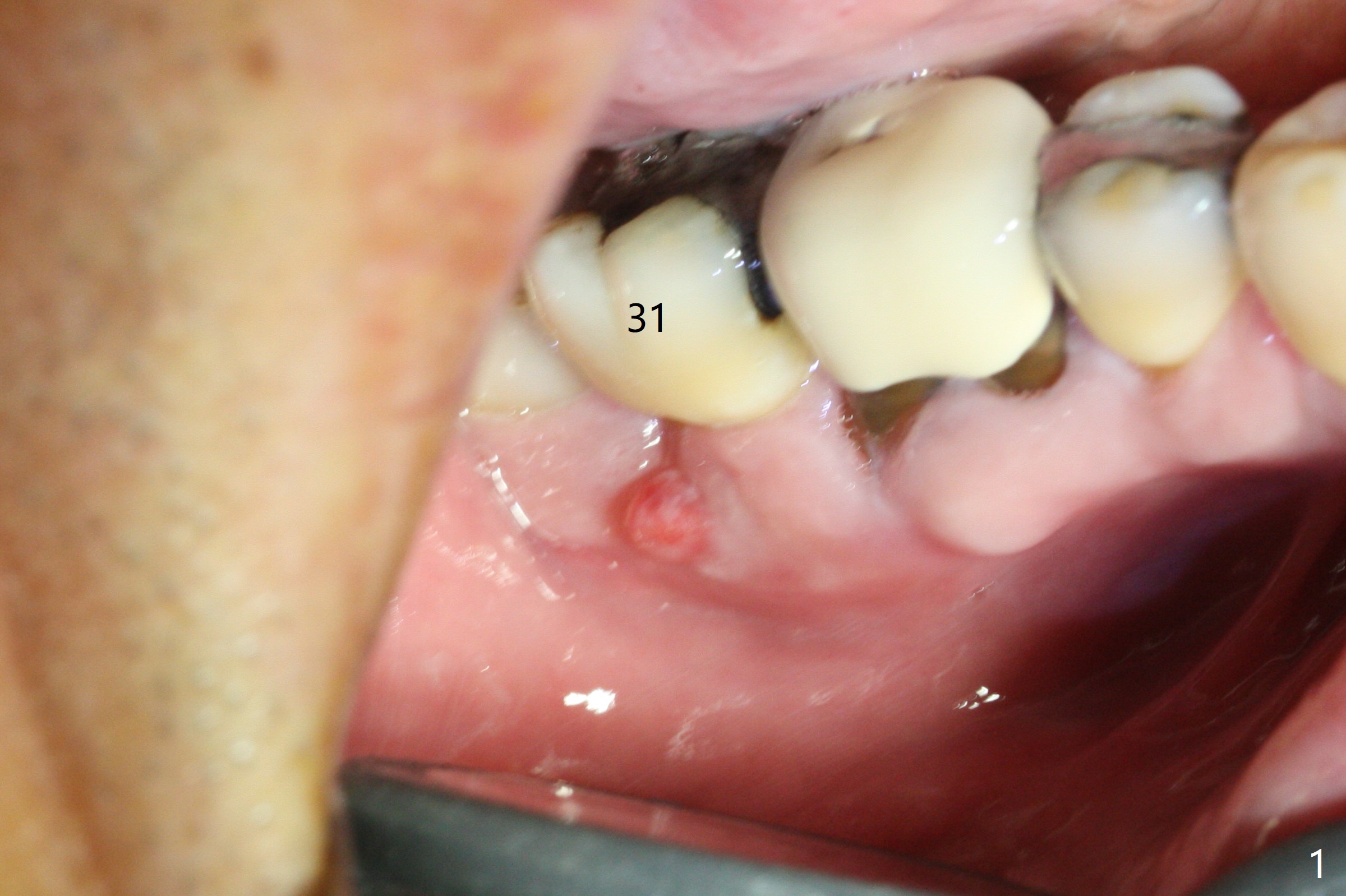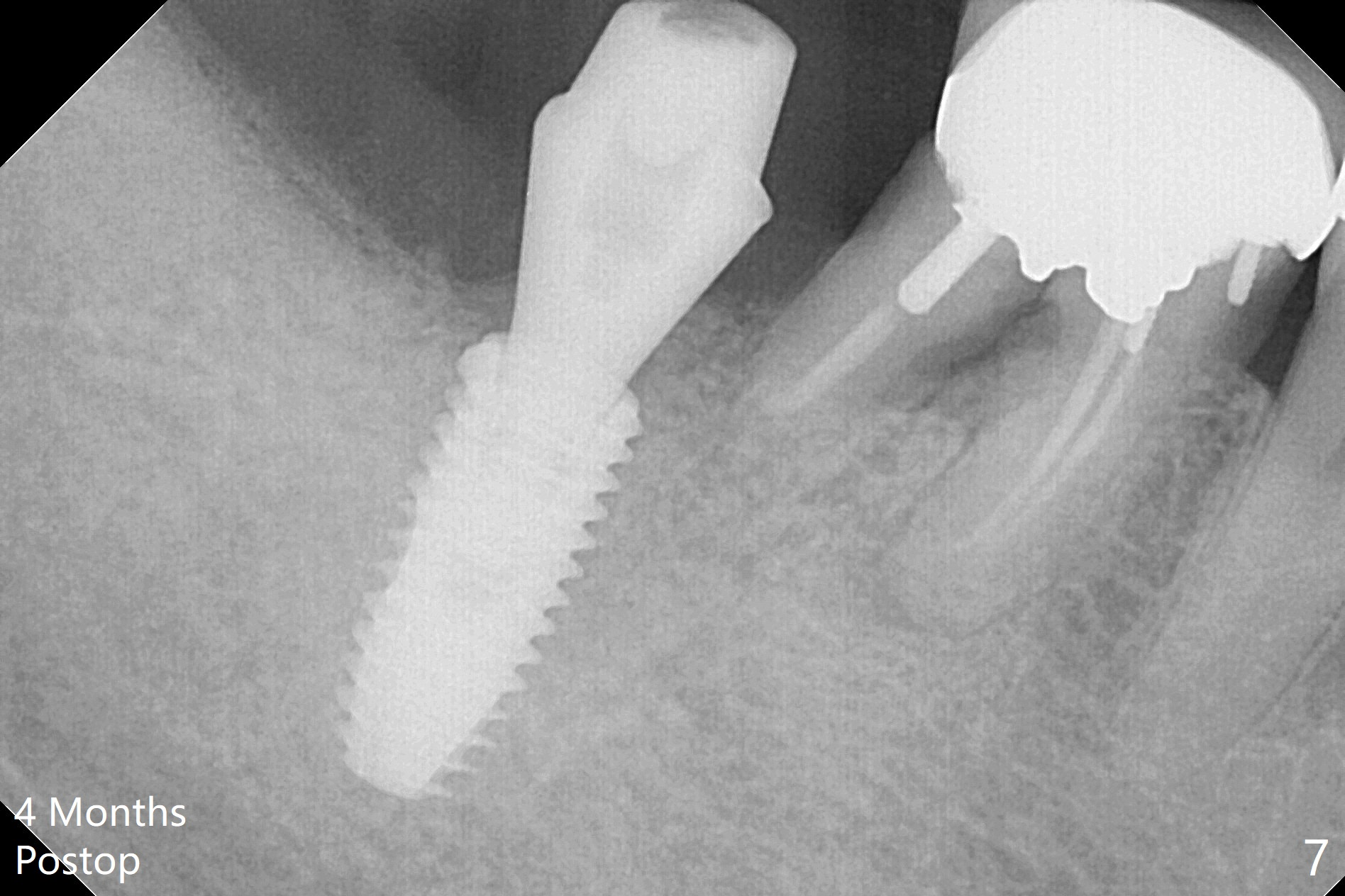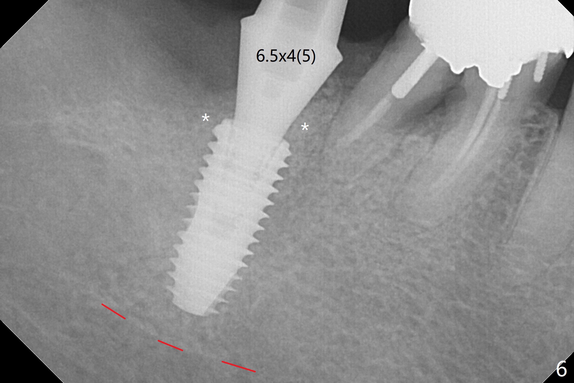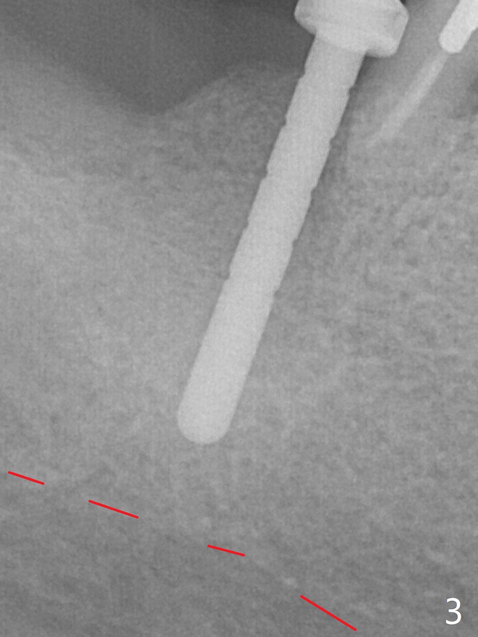After extraction of the 2nd molar with buccal fistula (Fig.1), osteotomy is initiated beyond the socket for 4 mm (Fig.2,3). Following moving the osteotomy distal and sequential osteotomy, a 4.5x11.5 mm dummy implant is placed equicrestal buccally (Fig.4 ^) with stability; the dummy abutment is 6.5x5(4) mm. A 5x11.5 mm (definitive) implant achieves .>20 Ncm insertion torque (Fig.5). With placement of a 6.5x4(5) mm abutment, Vanilla (Fig.6 *) and Osteogen plug over the graft and in the socket of #32, periodontal dressing is applied. The implant at the 2nd molar placed much deeper than the 1st molar seems to be risky in term of the Inferior Alveolar Canal (Fig.3-6 red dashed line). Several carpules of anesthetics have to be administered in an infiltration manner for pain control. Fortunately there is no postop paresthesia. For an un-compliant patient, socket preservation is a better option. The implant seems to have osteointegrated 4 months postop (Fig.7).