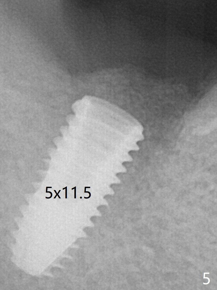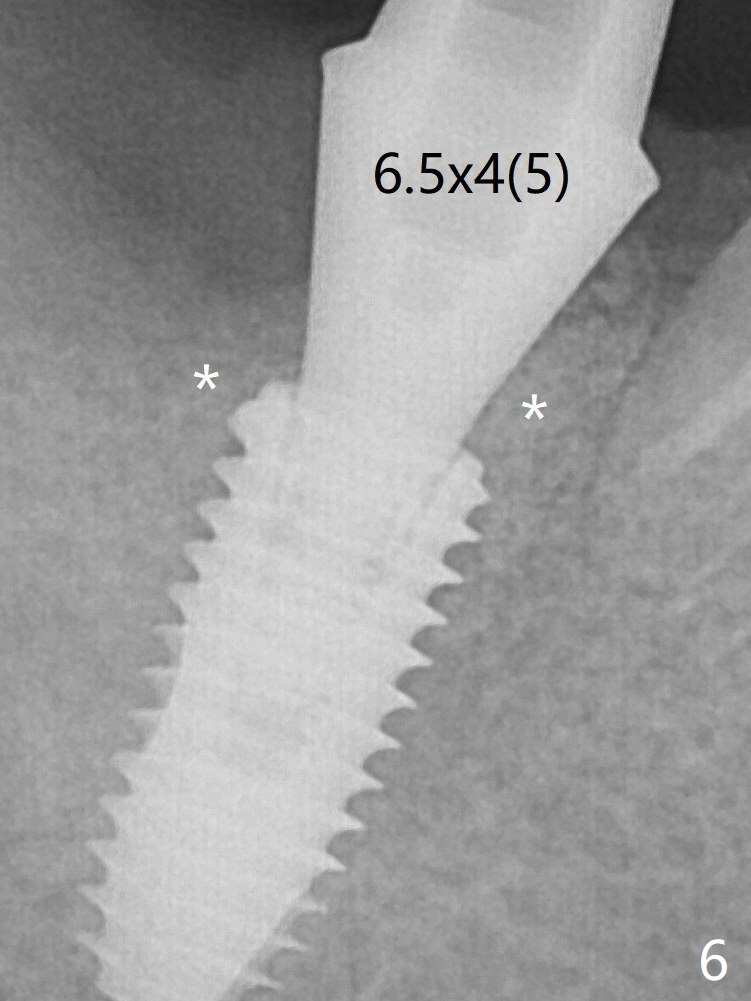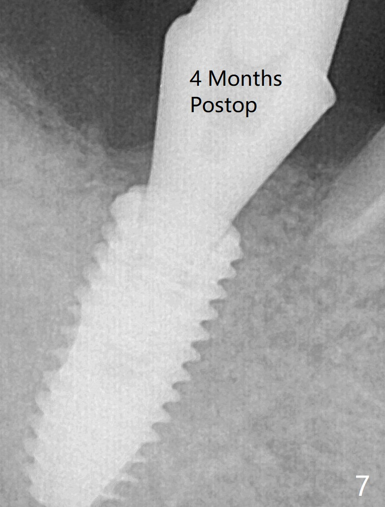 A 5x11.5 mm (definitive) implant achieves >20 Ncm insertion torque (Fig.5). With placement of a 6.5x4(5) mm abutment, Vanilla (Fig.6 *) and Osteogen plug over the graft and in the socket of #32, periodontal dressing is applied. The implant seems to have osteointegrated 4 months postop (Fig.7).