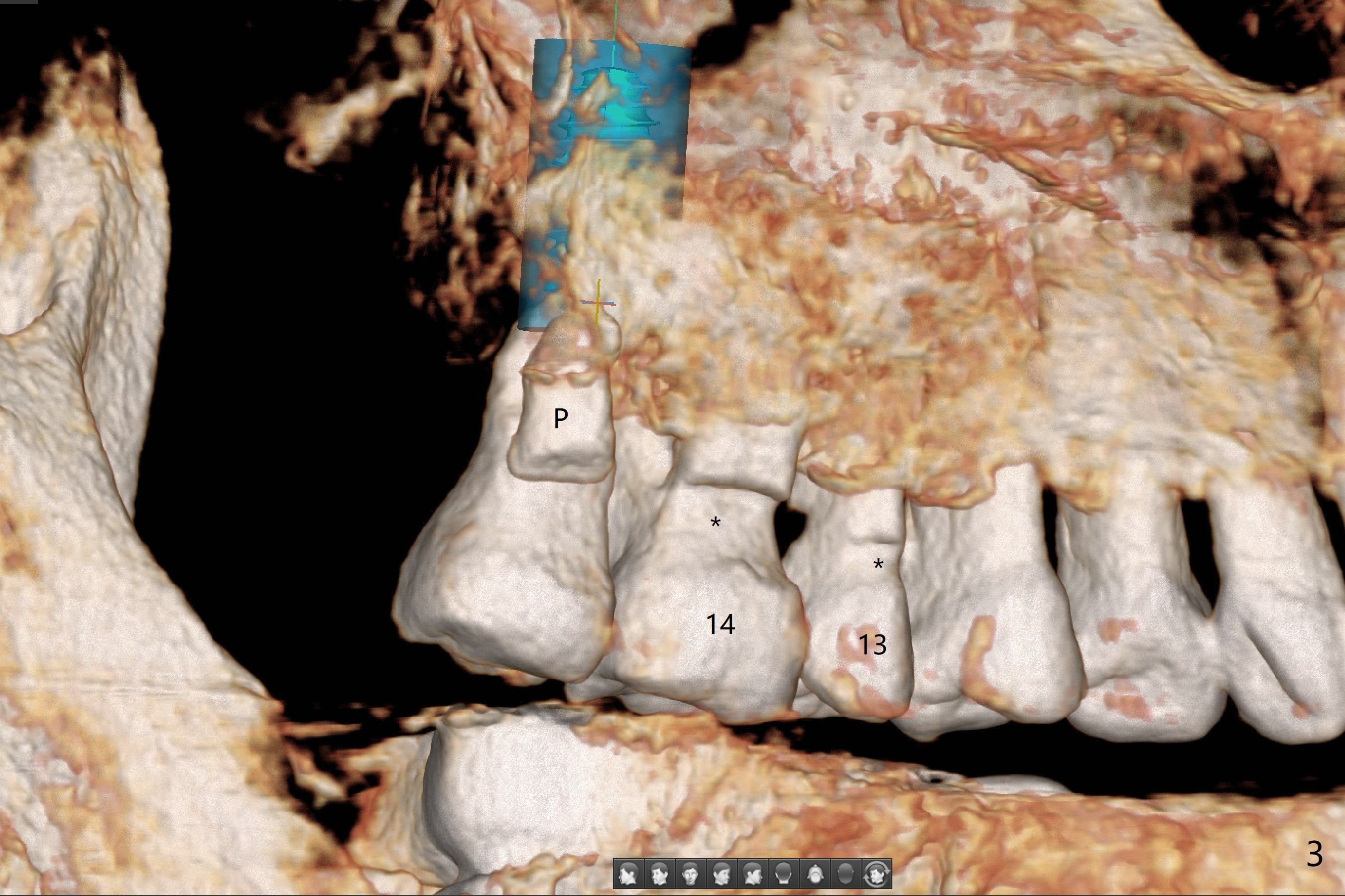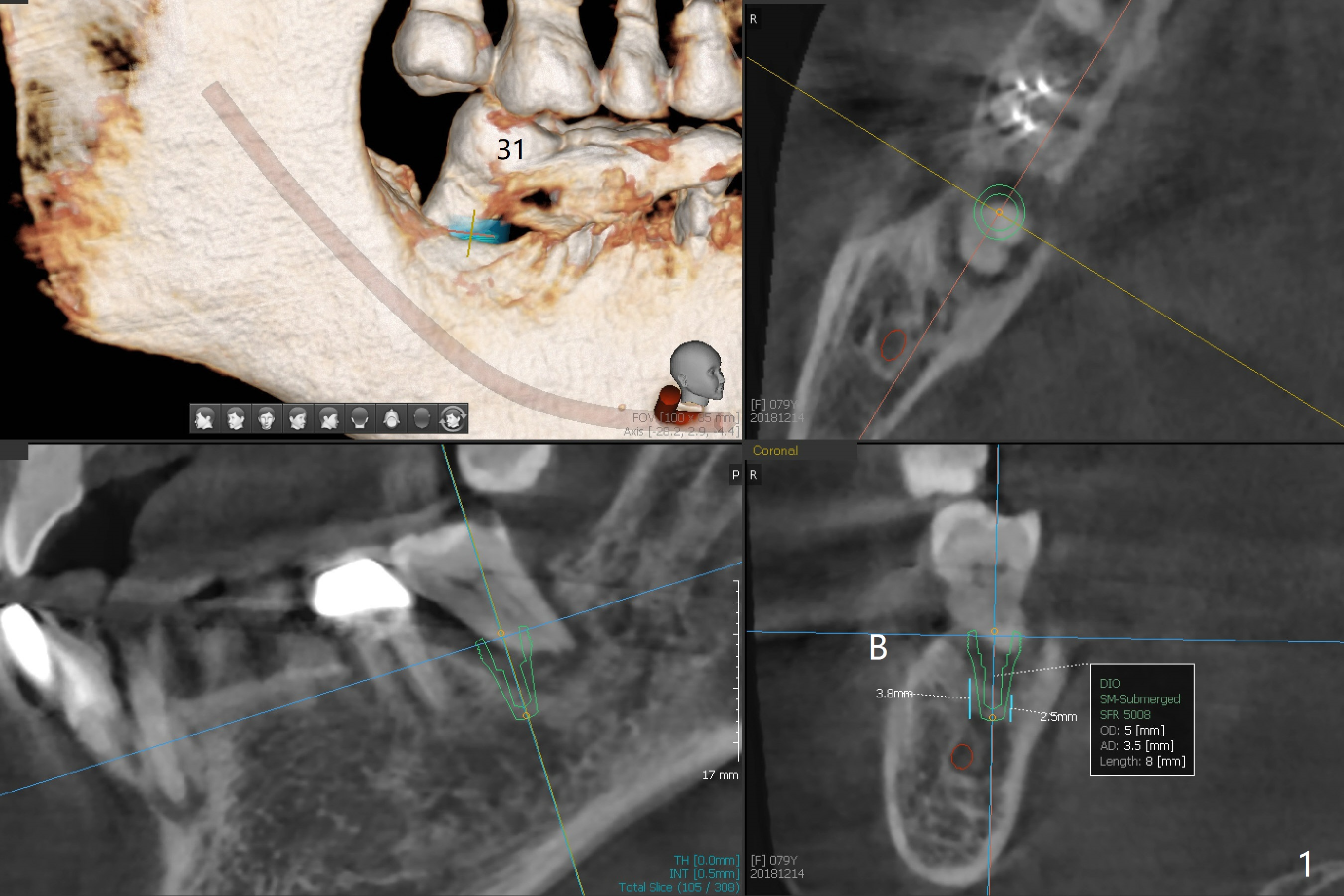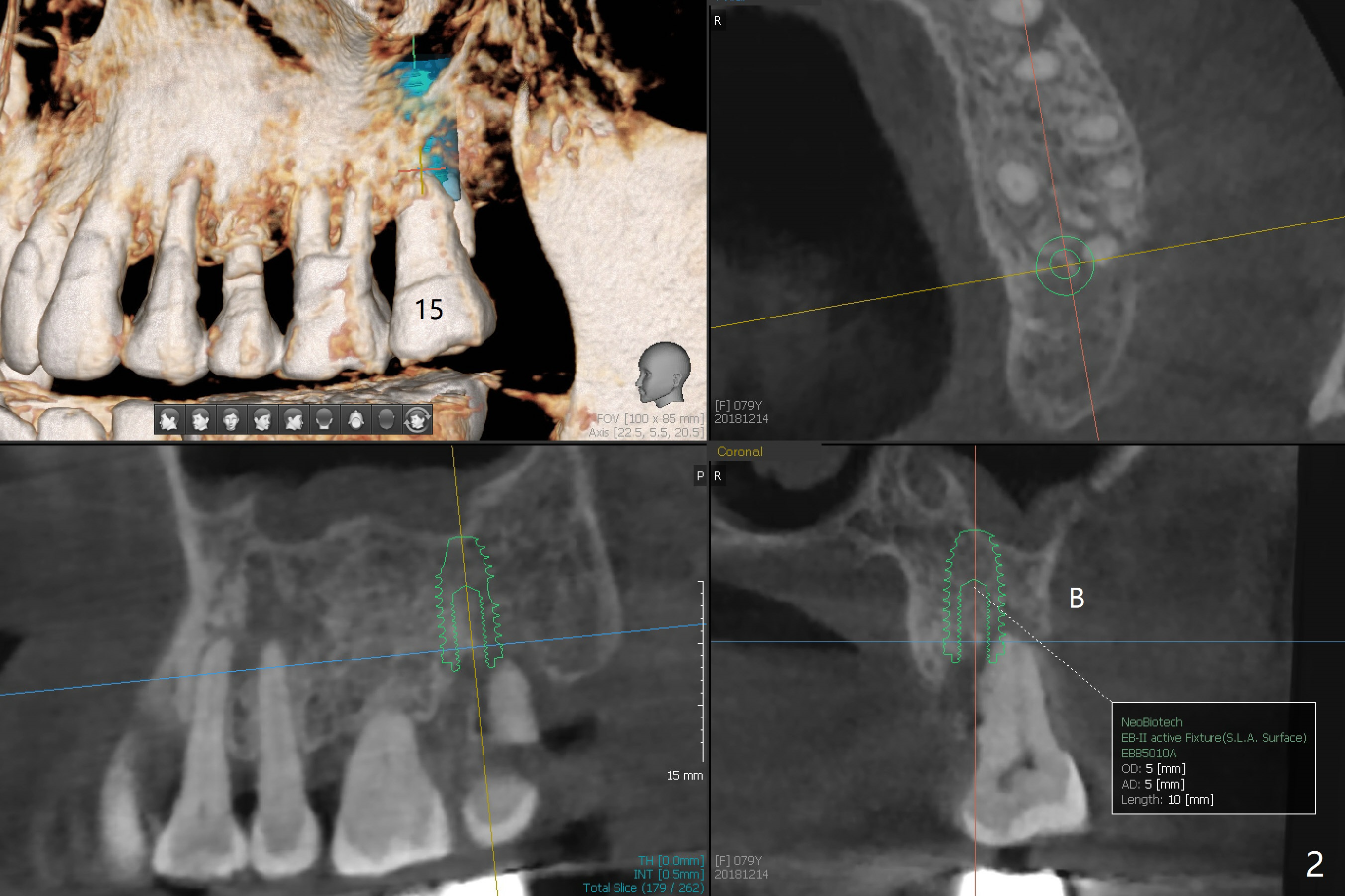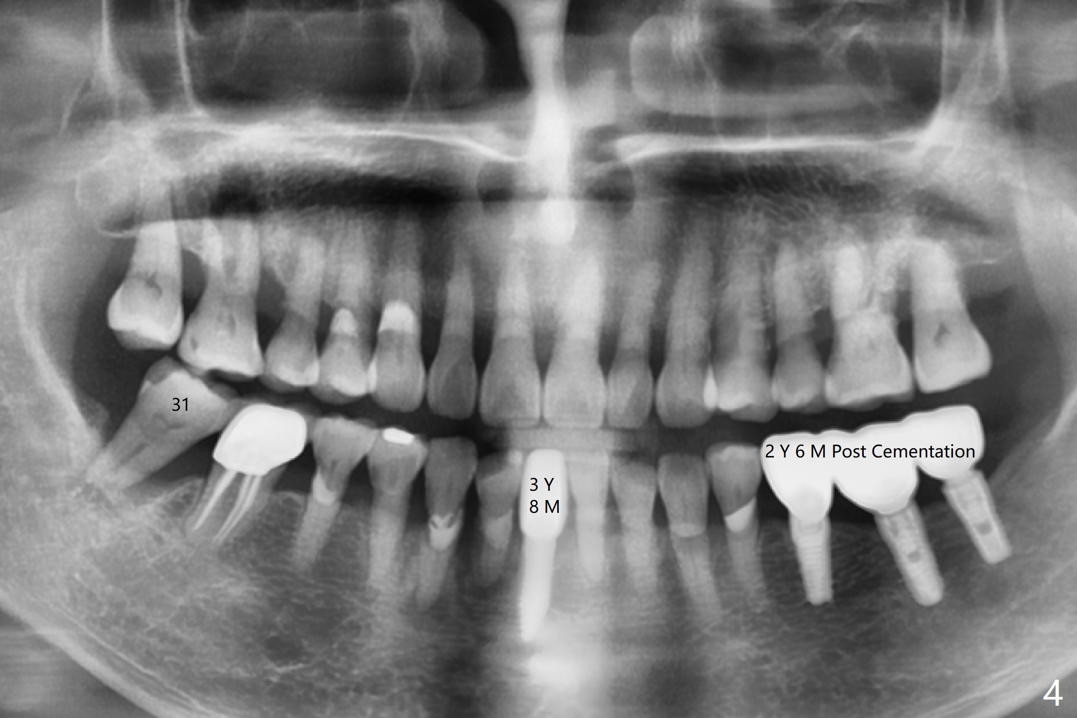 A 79-year-old woman returns to clinic suddenly, requesting extraction of the tooth #31 with mobility III (3 years 8 months post cementation for #25; 2 years 6 months post cementation for #18-20; Fig.4). An immediate implant is planned (Fig.1). After extraction, the large socket has relatively small opening, seemingly easy to keep bone graft in place. The immediate implant with 2-3 mm native bone may not have primary stability, most likely losing its ability to hold bone graft. Therefore socket preservation is conducted at #31. In contrast there is enough bone for an immediate implant at #15 (Fig.2) with palatal root fracture (Fig.3 (palatal view)).