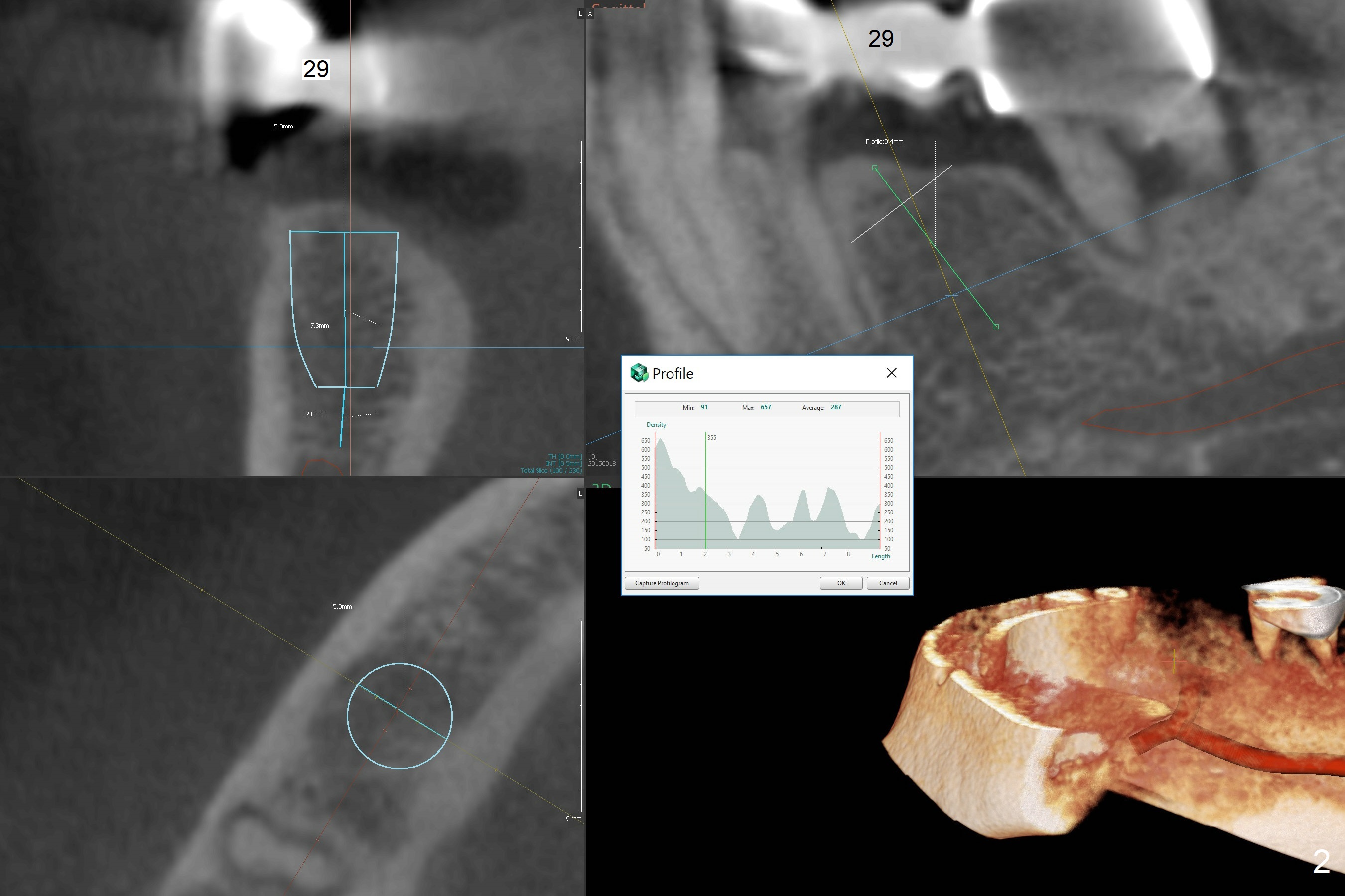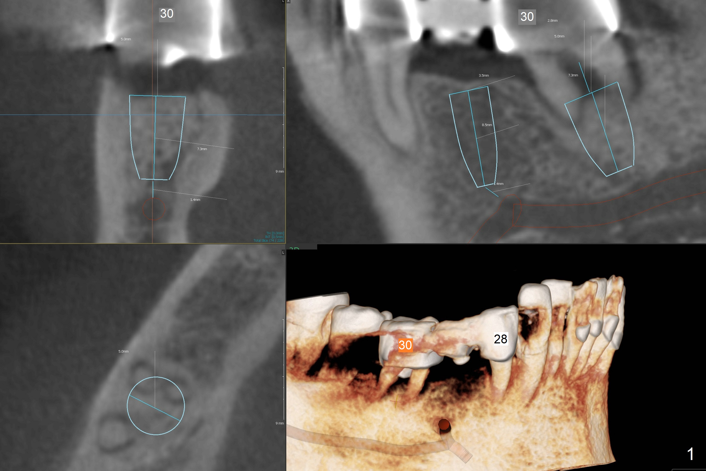 A 54-year-old man has pain at #30 (Fig.1). With severe loss of bone, the tooth is non-salvageable. Section FPD between #28 and 29 before extraction of #30. Because of limited bone, 4.5x7.3 and 5x7.3 mm implants appear to be appropriate at #29 (Fig.2) and 30. Due to low bone density at #29 (Fig.2), under drilling is required.