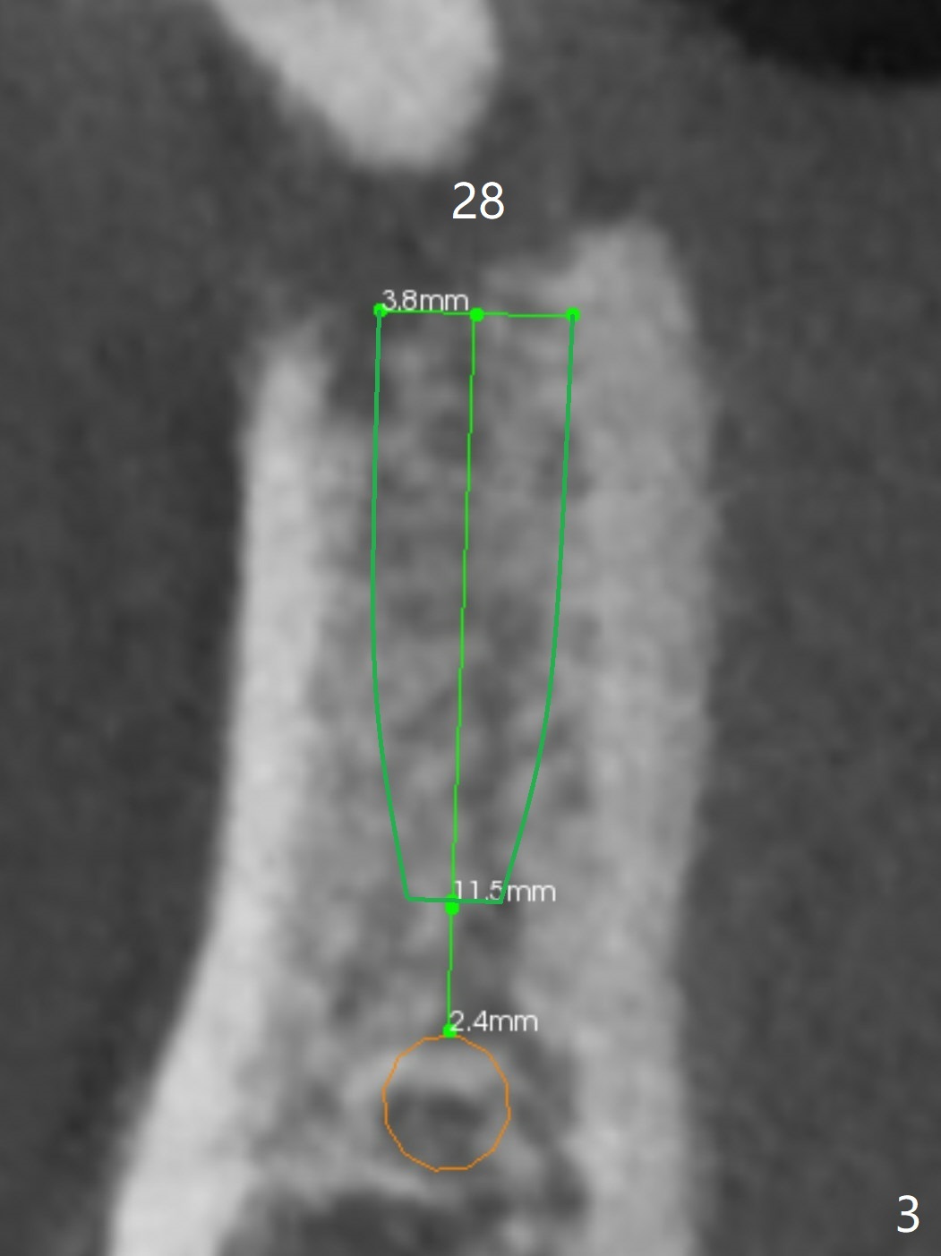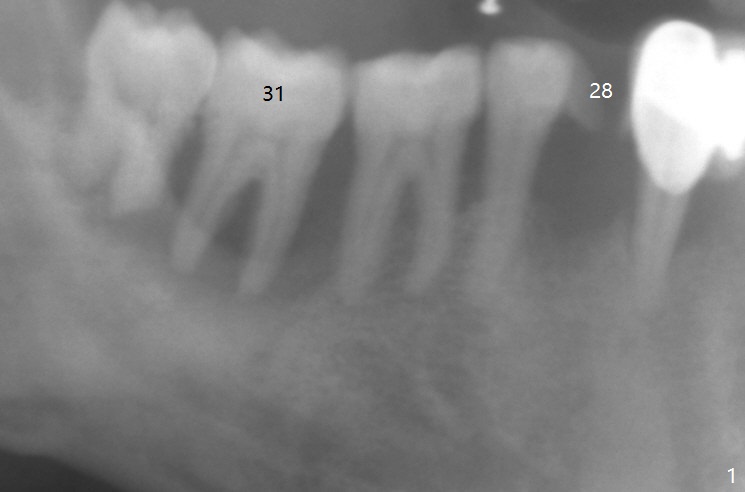 After having upper implants placed (9-11, 15 UR), a 46-year-old man requests taking care of the loose tooth at #31 and the missing tooth #28 next (Fig.1). Bone height is limited at #31 (Fig.2); if hemorrhage and pain are controllable, an extra wide Bicon implant will be placed. In the posterior region with unfavorable implant crown ratio, there is less likelihood to separate Bicon abutment from its implant because of friction mechanism. But 3-5 mm stoppers and drills are from another implant system (regular and wide kits). CT may be taken intraop if needed. PRF membranes will be used to close the large socket opening with a hole for abutment penetration if instructed. Autoclave a needle with endo syringe to inject PRF liquid into the tissue to facilitate tissue healing.