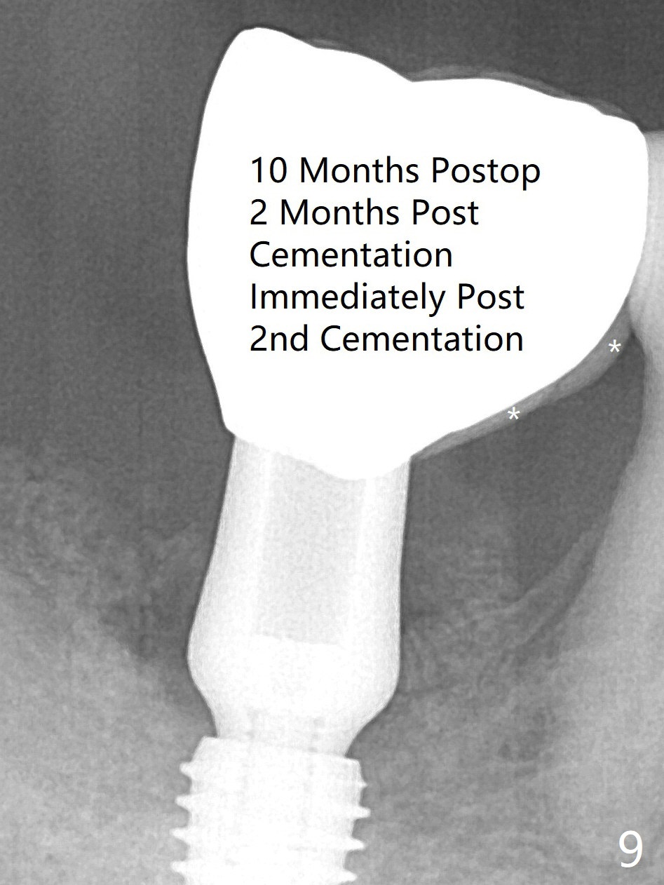 Due to limited bone height confirmed intraoperatively, a shorter UF implant is placed with insertion torque 30 Ncm (Fig.6). After placing a 6.5x5(5) mm abutment, Vanilla Graft (*) and PRF membrane and collagen plug, an immediate provisional is fabricated to close the remaining socket. The tooth #32 is kept initially to increase the stability of the provisional and removed 8 day postop because of discomfort. A 5.5(2.5) mm mill abutment is placed 3 months postop. The implant seems ready for impression 6 months postop (Fig.8). The bone graft remains around the apical portion of the mill abutment with apparently new bone formation around the coronal portion of the implant10 months postop (Fig.9); porcelain (*) has been added to close the mesial gingival embrasure and proximal contact gap. Due to unfavorable crown/implant ratio and poor trajectory, the crown/abutment becomes loose once post 1st cementation. Guided surgery would avoid the trajectory isssue.