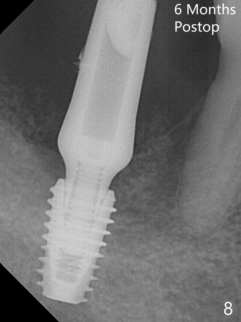 Due to limited bone height confirmed intraoperatively, a shorter UF implant is placed with insertion torque 30 Ncm (Fig.6). After placing a 6.5x5(5) mm abutment, Vanilla Graft (*) and PRF membrane and collagen plug, an immediate provisional is fabricated to close the remaining socket. The tooth #32 is kept initially to increase the stability of the provisional and removed 8 day postop because of discomfort. A 5.5(2.5) mm mill abutment is placed 3 months postop. The implant seems ready for impression 6 months postop (Fig.8).