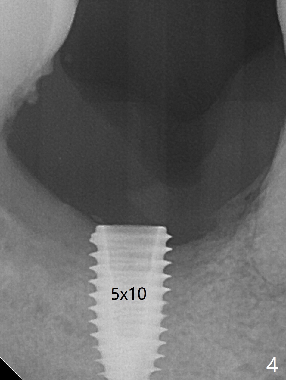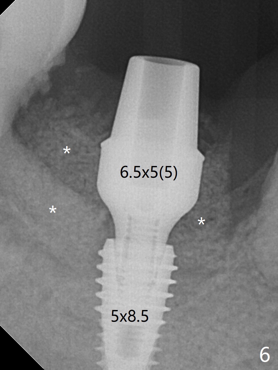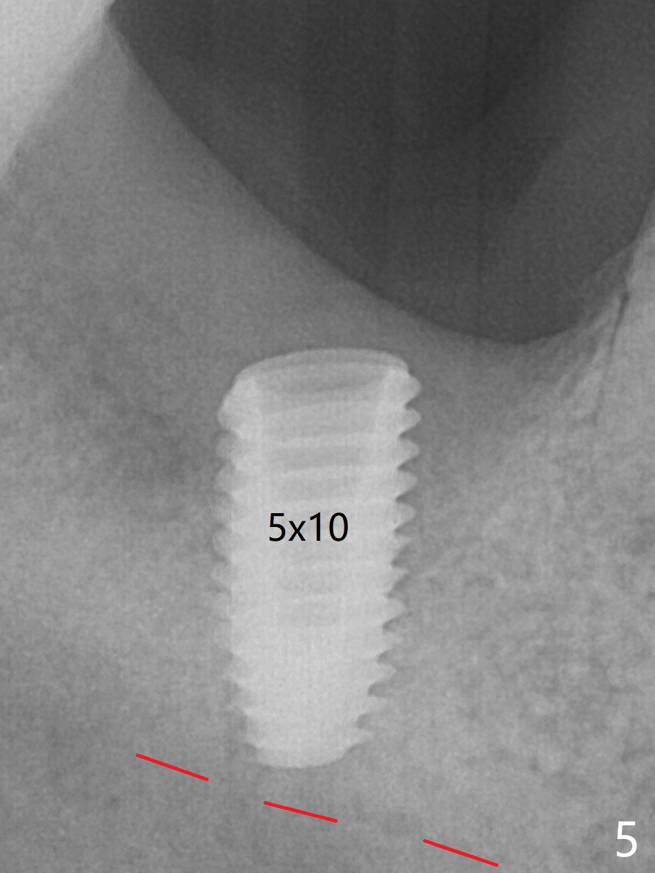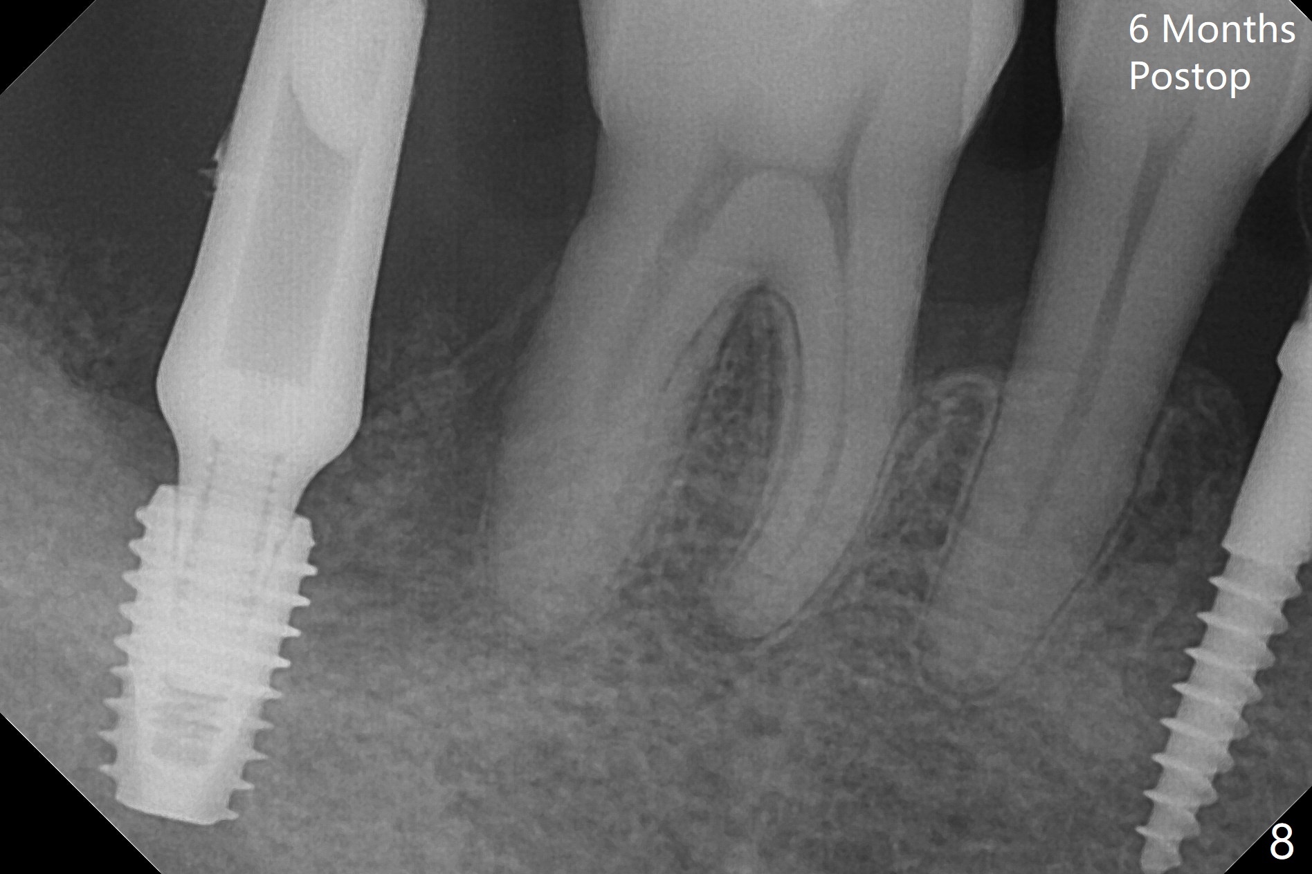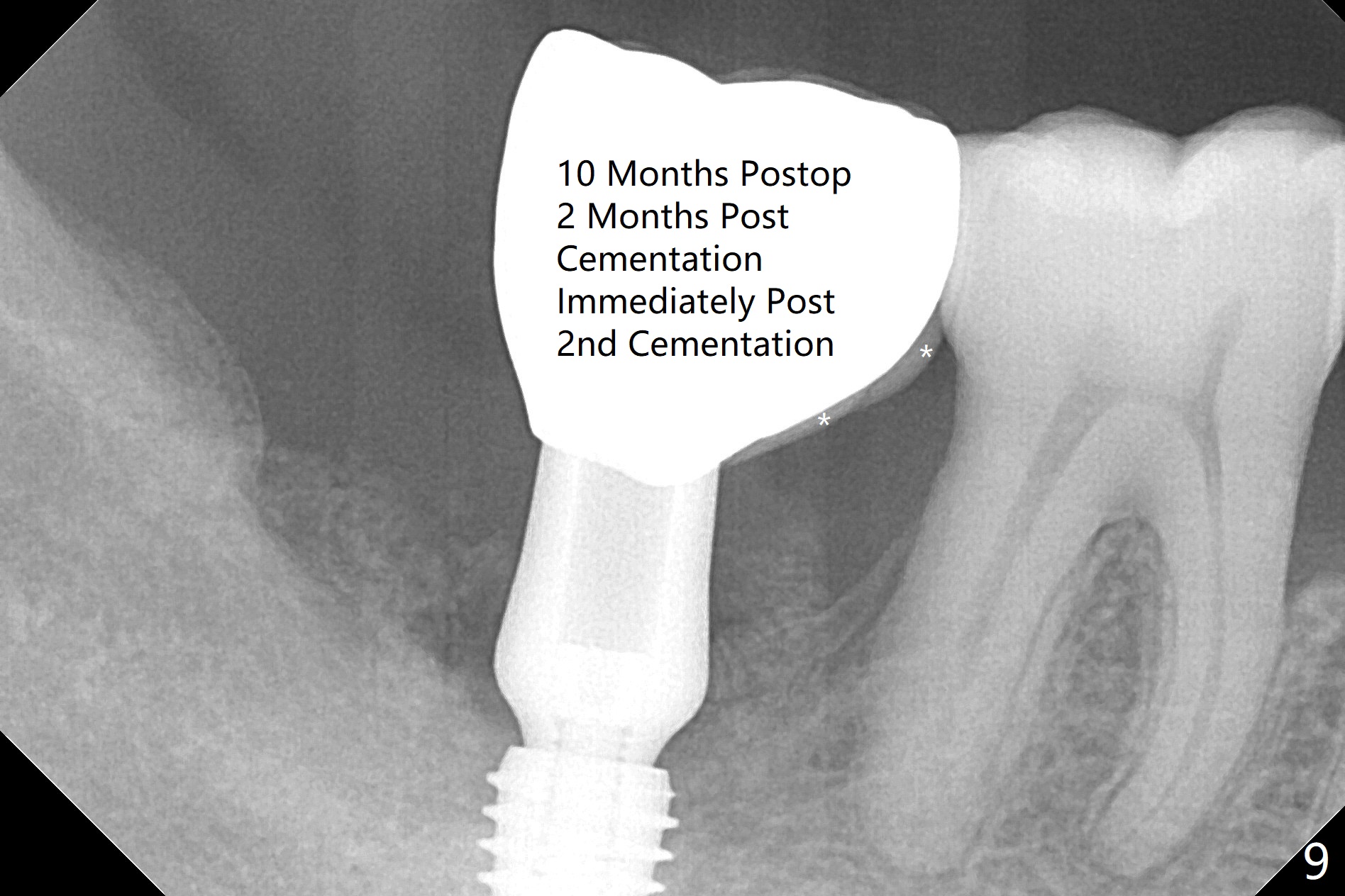 The affected tooth (#31, Fig.1) has severe buccal gingival recession with mobility III. After extraction and removal of granulation tissue, osteotomy is initiated in the middle of the fused socket using IS drills with 4 mm stopper (Fig.2,3). Following sequential osteotomy until 4 mm drill, a 4.5x10 mm IS dummy implant does not achieve primary stability, whereas 5x10 mm one does (Fig.4,5). Due to limited bone height confirmed intraoperatively, a shorter UF implant is placed with insertion torque 30 Ncm (Fig.6,7) with ~ 4.5 mm implant threads exposed coronally. After placing a 6.5x5(5) mm abutment, Vanilla Graft (*) and PRF membrane and collagen plug, an immediate provisional is fabricated to close the remaining socket. The tooth #32 is kept initially to increase the stability of the provisional and removed 8 day postop because of discomfort. A 5.5(2.5) mm mill abutment is changed to 3 months postop. The implant seems ready for impression 6 months postop (Fig.8). The bone graft remains around the apical portion of the mill abutment with apparently new bone formation around the coronal portion of the implant10 months postop (Fig.9); porcelain (*) has been added to close the mesial gingival embrasure and proximal contact gap. Due to unfavorable crown/implant ratio and poor trajectory, the crown/abutment becomes loose once post 1st cementation. Guided surgery would avoid the trajectory isssue.