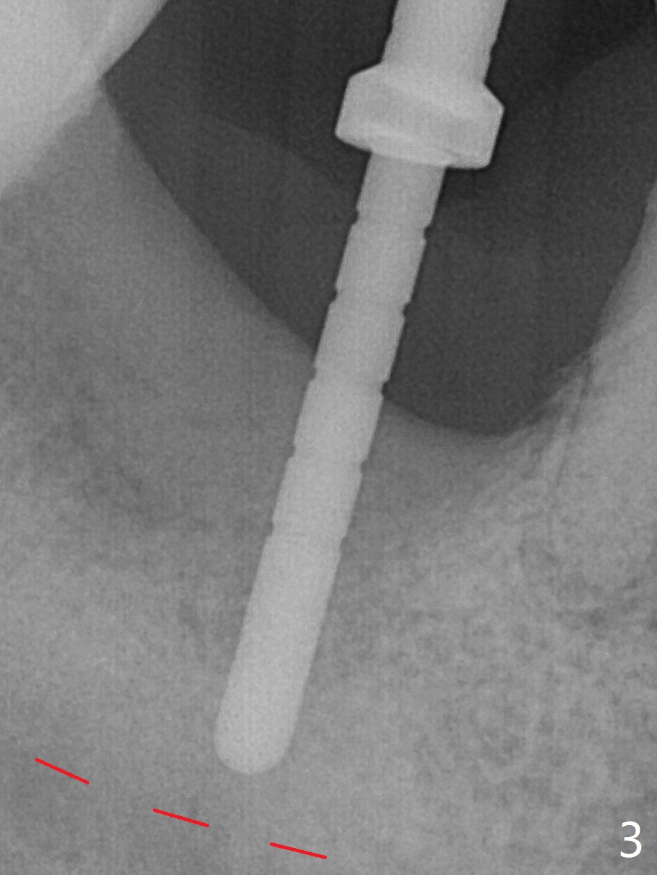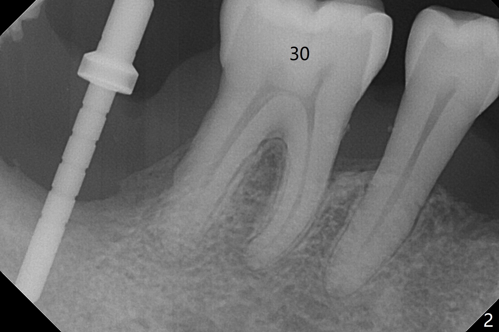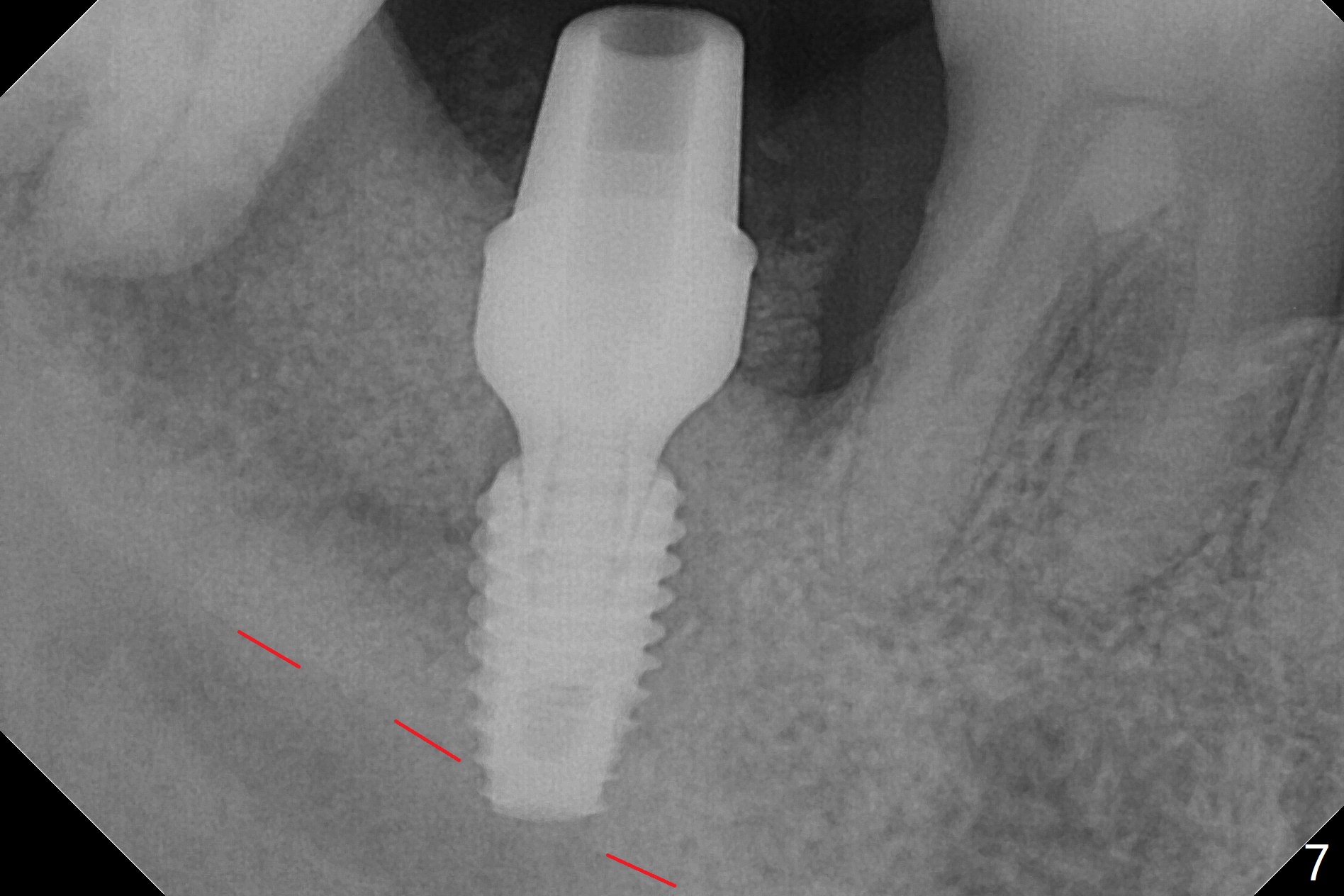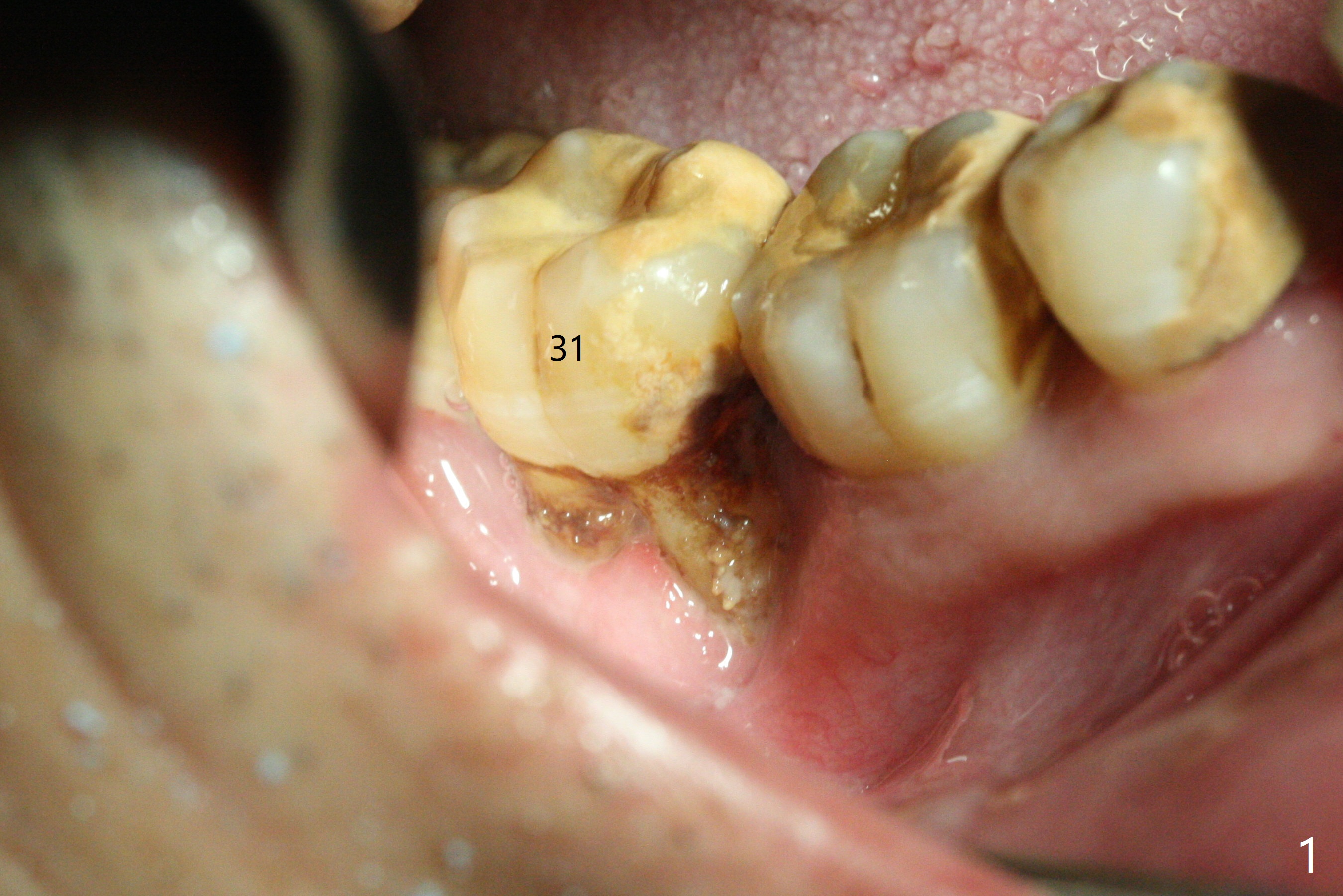 The affected tooth (#31, Fig.1) has severe buccal gingival recession with mobility III. After extraction and removal of granulation tissue, osteotomy is initiated in the middle of the fused socket using IS drills with 4 mm stopper (Fig.2,3). Following sequential osteotomy until 4 mm drill, a 4.5x10 mm IS dummy implant does not achieve primary stability, whereas 5x10 mm one does (Fig.4,5). Due to limited bone height confirmed intraoperatively, a shorter UF implant is placed with insertion torque 30 Ncm (Fig.6,7) with ~ 4.5 mm implant threads exposed coronally. After placing a 6.5x5(5) mm abutment, Vanilla Graft (*) and PRF membrane and collagen plug, an immediate provisional is fabricated to close the remaining socket. The tooth #32 is kept initially to increase the stability of the provisional and removed 8 day postop because of discomfort. A 5.5(2.5) mm mill abutment is changed to 3 months postop. The implant seems ready for impression 6 months postop (Fig.8). The bone graft remains around the apical portion of the mill abutment with apparently new bone formation around the coronal portion of the implant10 months postop (Fig.9); porcelain (*) has been added to close the mesial gingival embrasure and proximal contact gap. Due to unfavorable crown/implant ratio and poor trajectory, the crown/abutment becomes loose once post 1st cementation. Guided surgery would avoid the trajectory isssue.