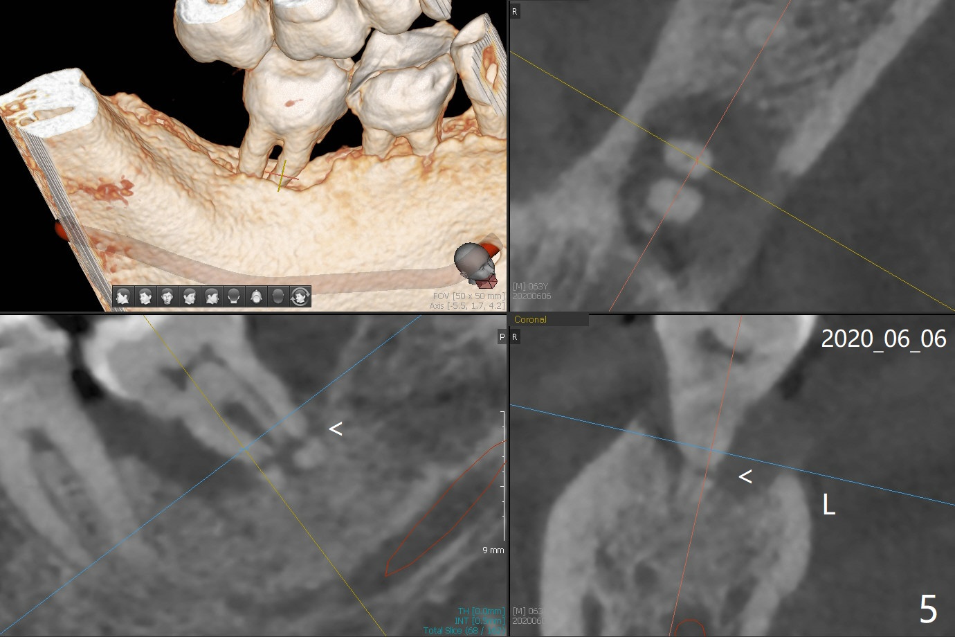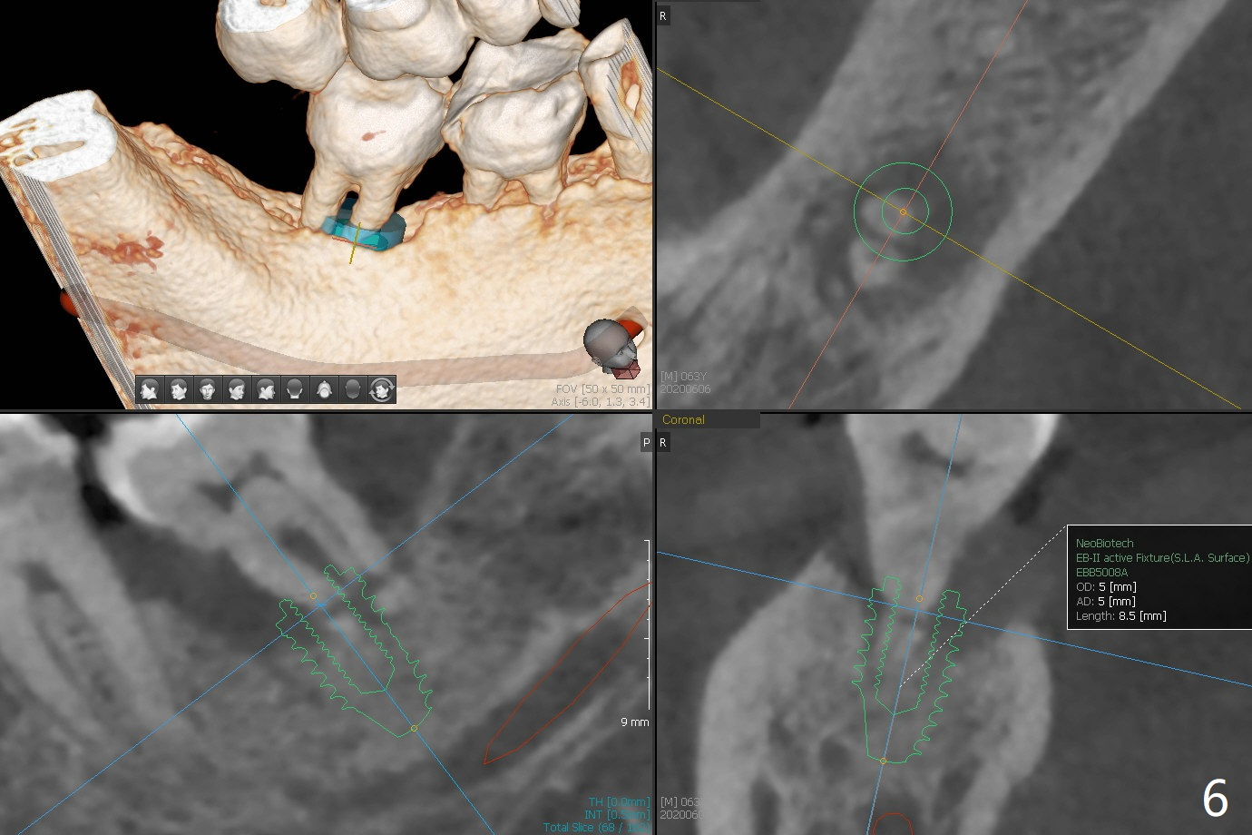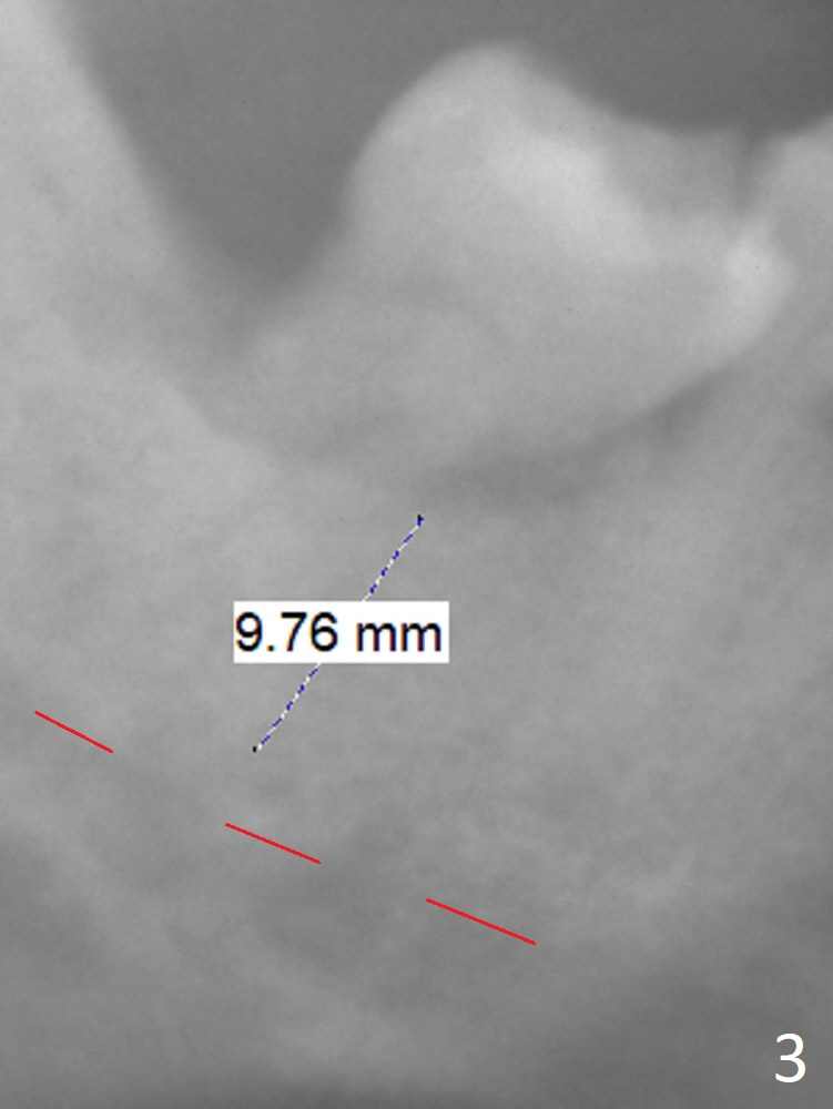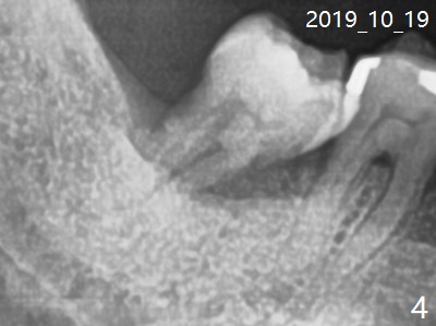 A 60-year-old man has chronic periodontitis, bruxism and malocclusion, e.g., #18 mesiolingual inclination (under occlusal trauma, Fig.1). The lingual pocket is deep with severe bone loss. After extraction, use implant positioner to gauze the size of the socket. Initiate osteotomy as mesial as possible and parallel to the 1st molar (Fig.2,3). Bone density is expected to be high. Prepare soft (1-piece) and hard (IS) tissue-level implants. The tooth remains loose 2 years later, although the patient is asymptomatic (Fig.4). Finally the tooth is symptomatic because of root tip fracture (Fig.5). Use drills with 7.3 mm stop for 4.5 or 5.0x8.5 mm implant free hand (Fig.6). The exposed implant will be covered with sticky bone (PRFx2). Prepare temporary and cemented abutments to hold bone graft in place.