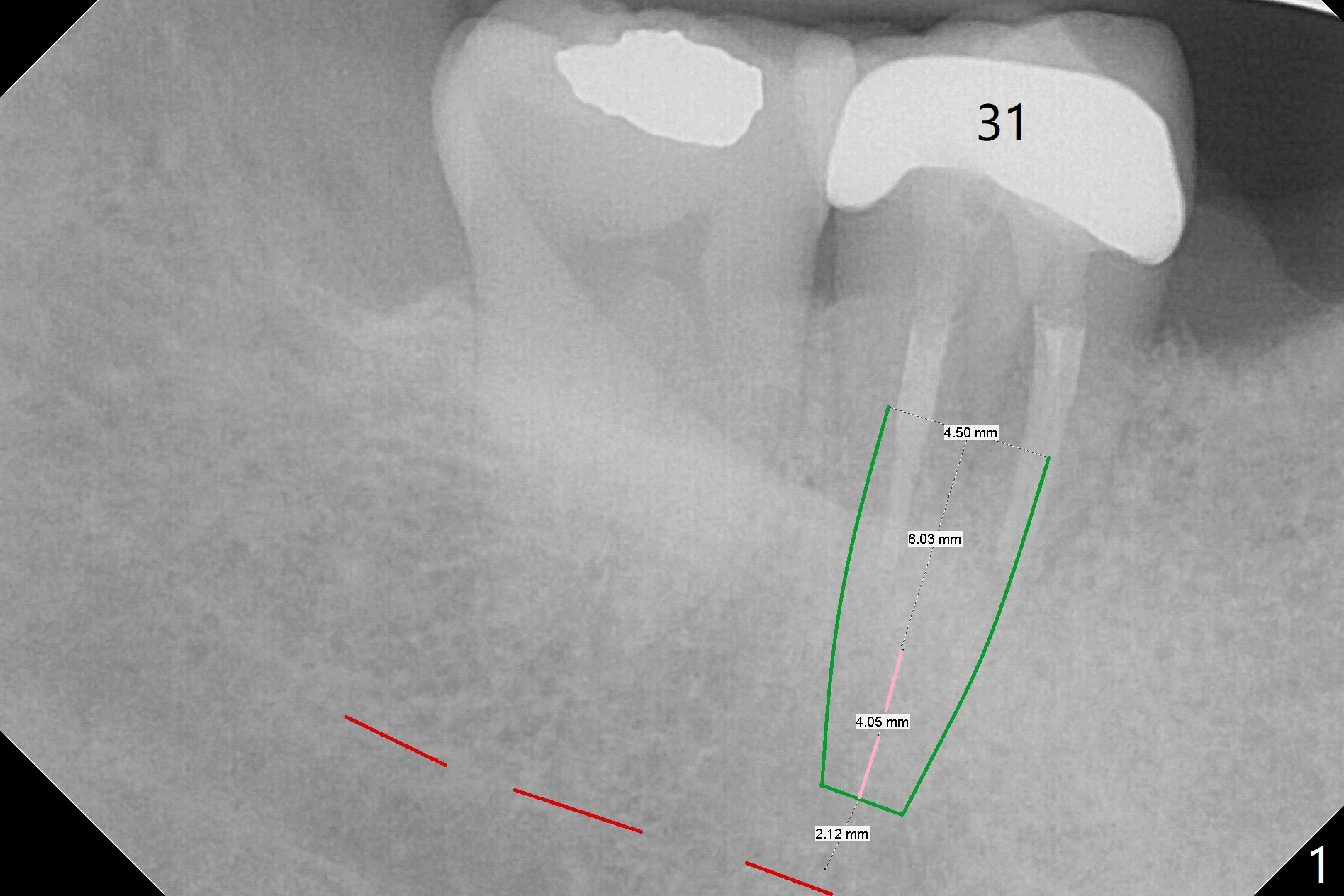 A 59-year-old woman has a mesiobuccal abscess at #31 (Fig.1, possible root fracture), while #30 is missing and replaced with a flipper. After extraction, osteotomy will be initiated distolingual for 4 mm (pink line). Do not lean too lingual apically. If the lingual perforates, place bone graft before placing as small and shallow an implant as possible. Check for perforation after each drill. The patient will return for CBCT one day before surgery. Also take photo for the abscess.