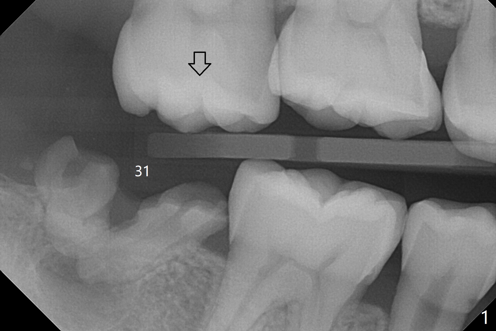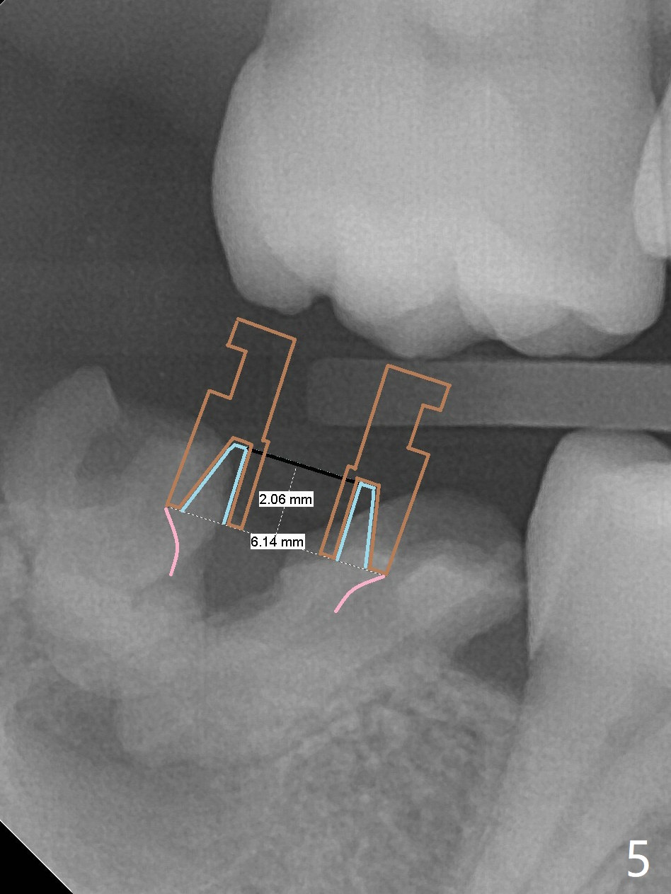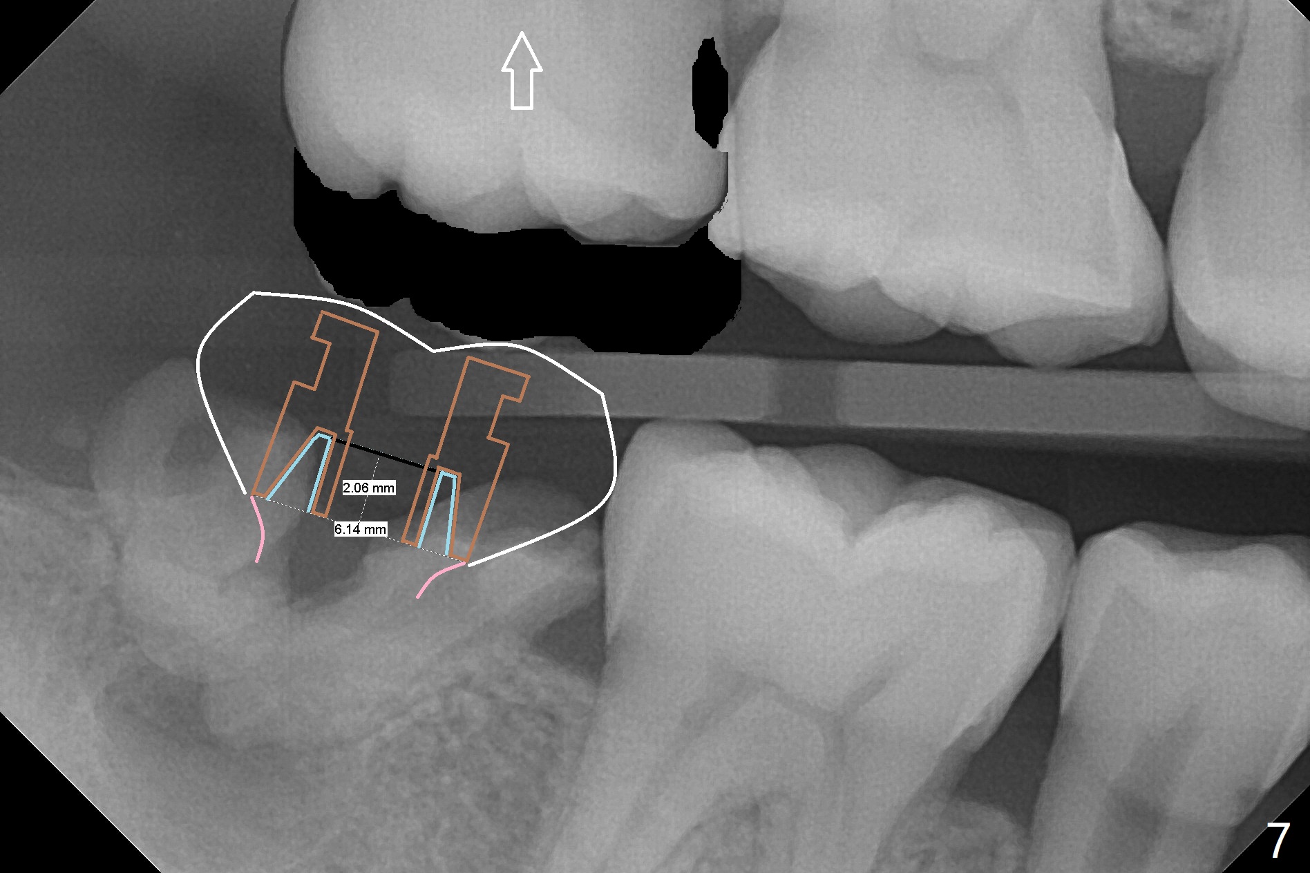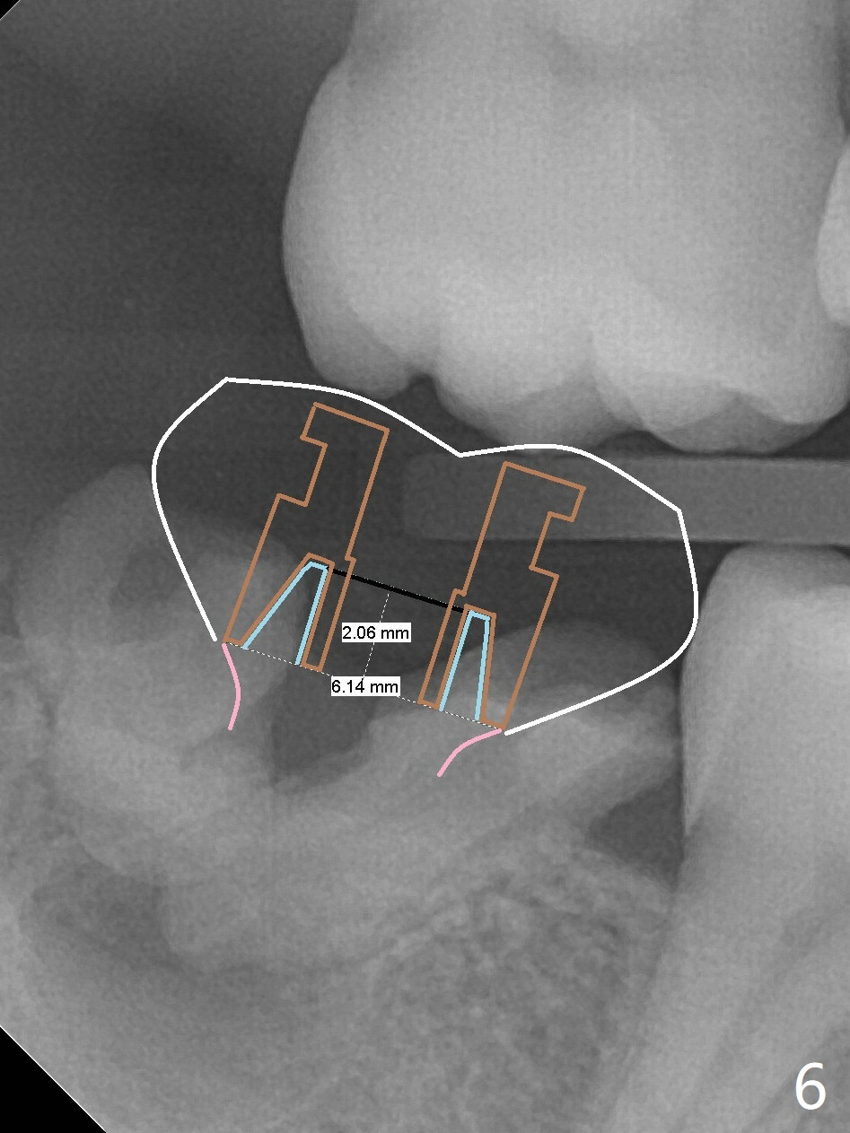 A 39-year-old man finishes orthodontic treatment without intrusion of the upper 2nd molar (Fig.1). He is reluctant for mini-implant placement for intrusion. After extraction of the tooth #31 with periapical radiolucency (Fig.2 *), a 5x11(4) mm Magicore will be placed with guide (Fig.3). Following osteointegration (Fig.4), a burn out core is going to be placed (Fig.5 brown, inside metal, outside plastic). With proper height adjustment, a provisional is fabricated around the core with acrylic (Fig.6 white). If the provisional keeps breaking down under occlusion, the case will be sent to lab for a screw retained crown with unfinished rough occlusal surface so that a thin layer restoration material able to be laid chair-side (acrylic or suction down material). Over time, the opposing tooth will be intruded (Fig.7 arrow).