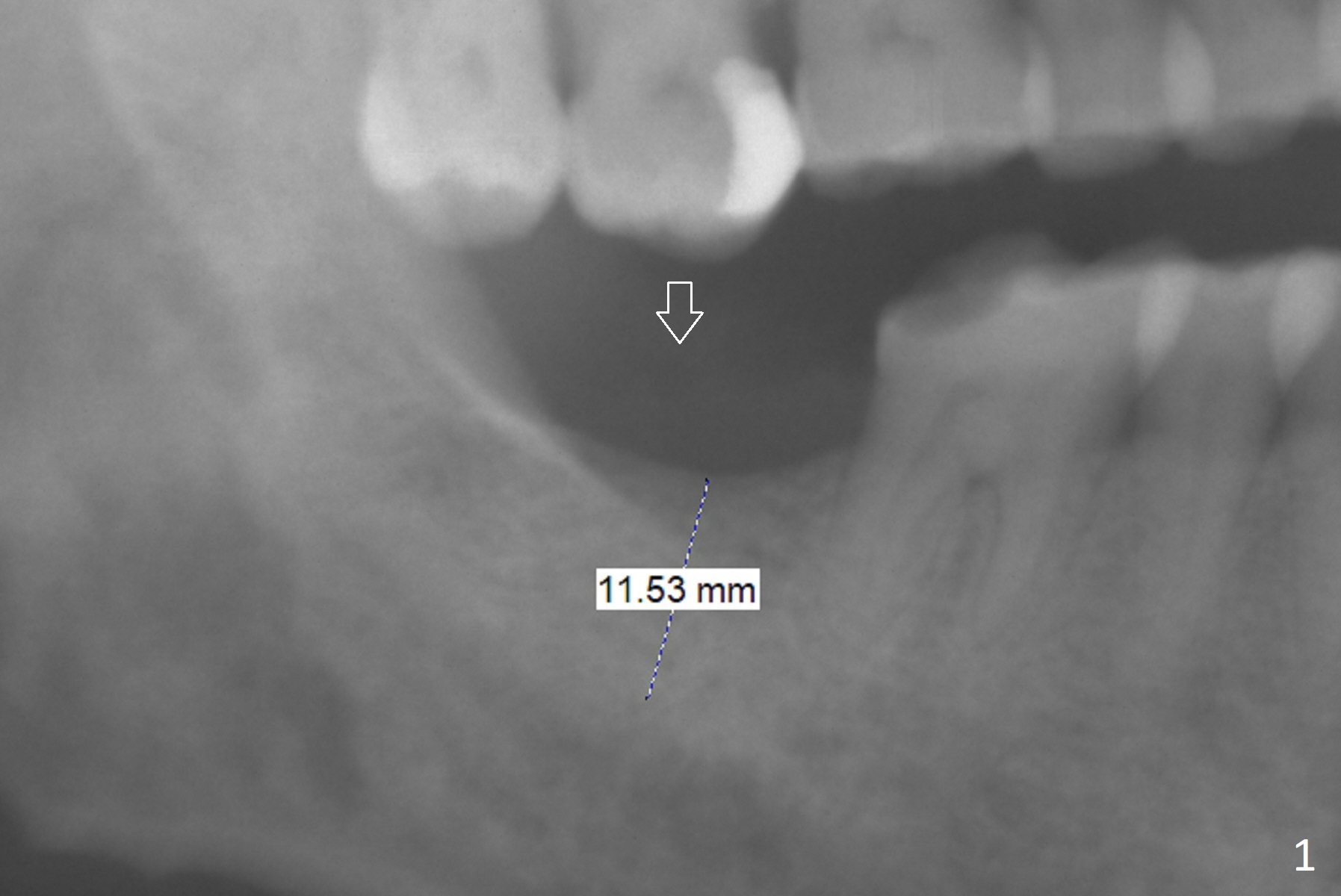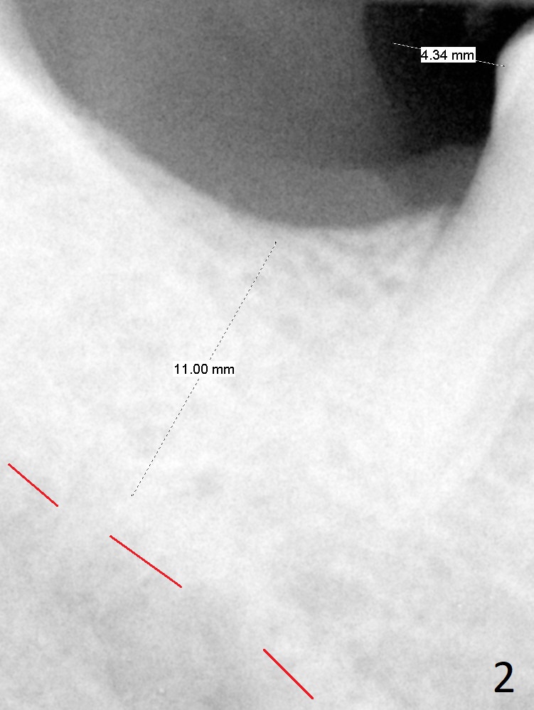 A 59-year-old man will return for #31 implant placement 2 months after #15 one (Fig.1). Since the opposing tooth is supraerupted (arrow), the depth of osteotomy will be 11.5 mm, while an implant will be 10 mm long. Immediately (probably 2 weeks) after the surgery, two mini-implants will be placed for orthodontic intrusion.