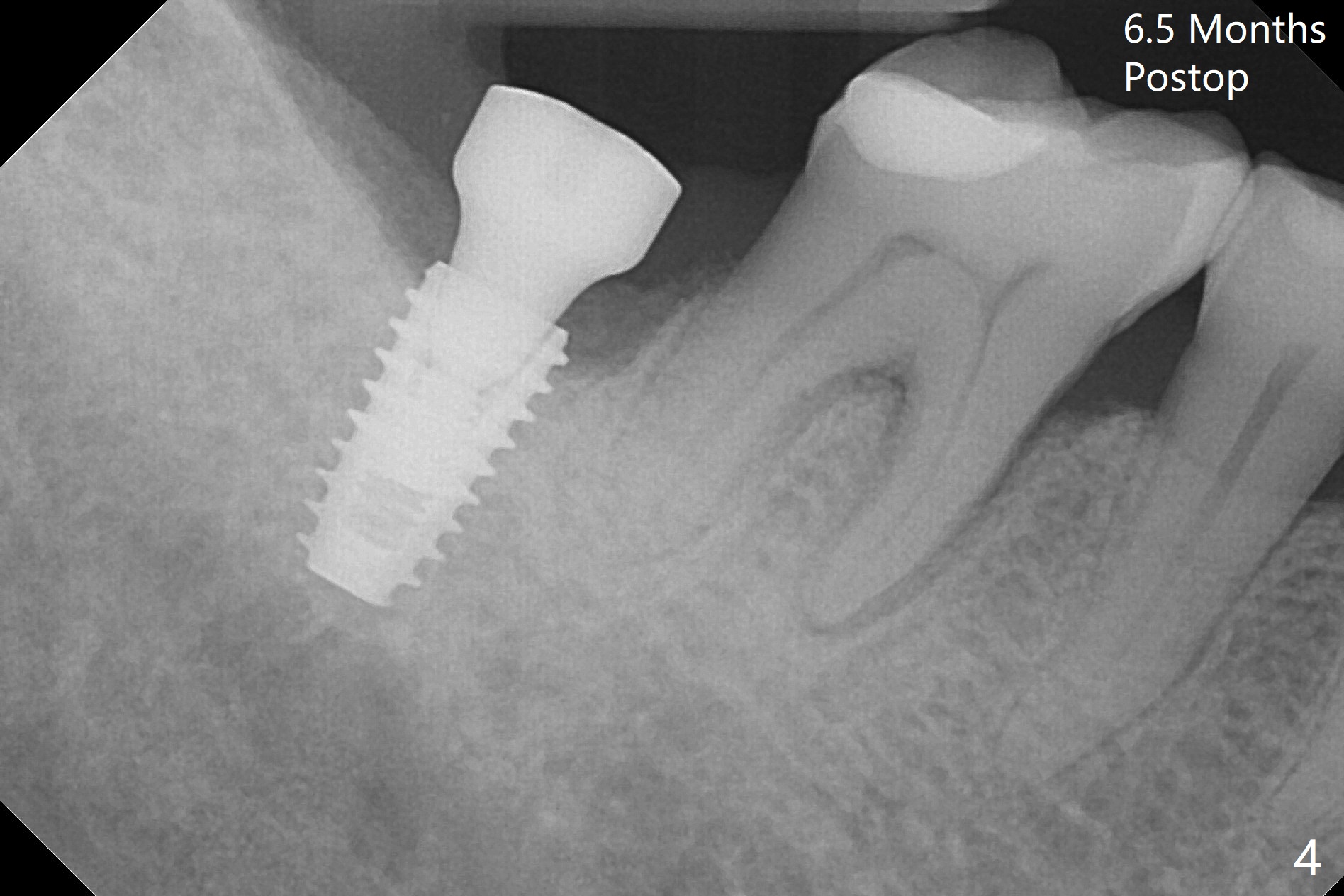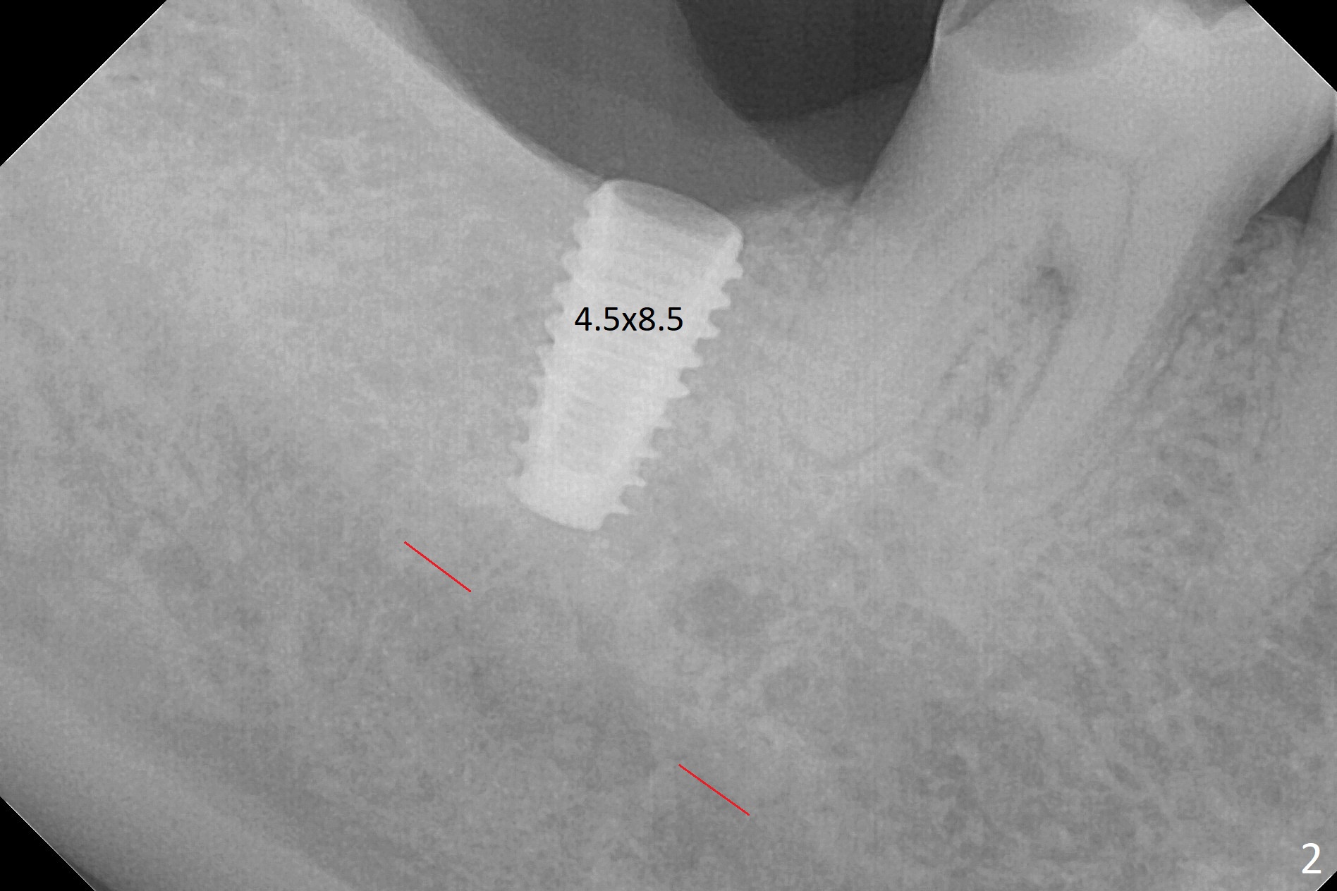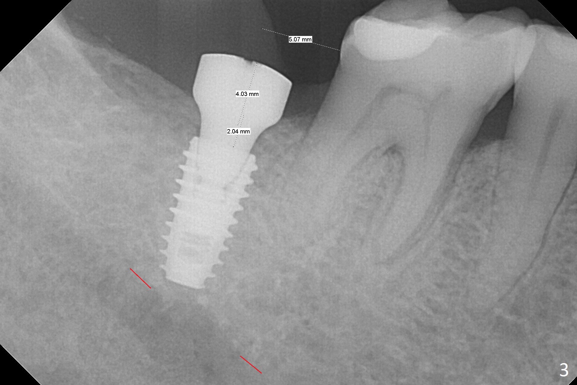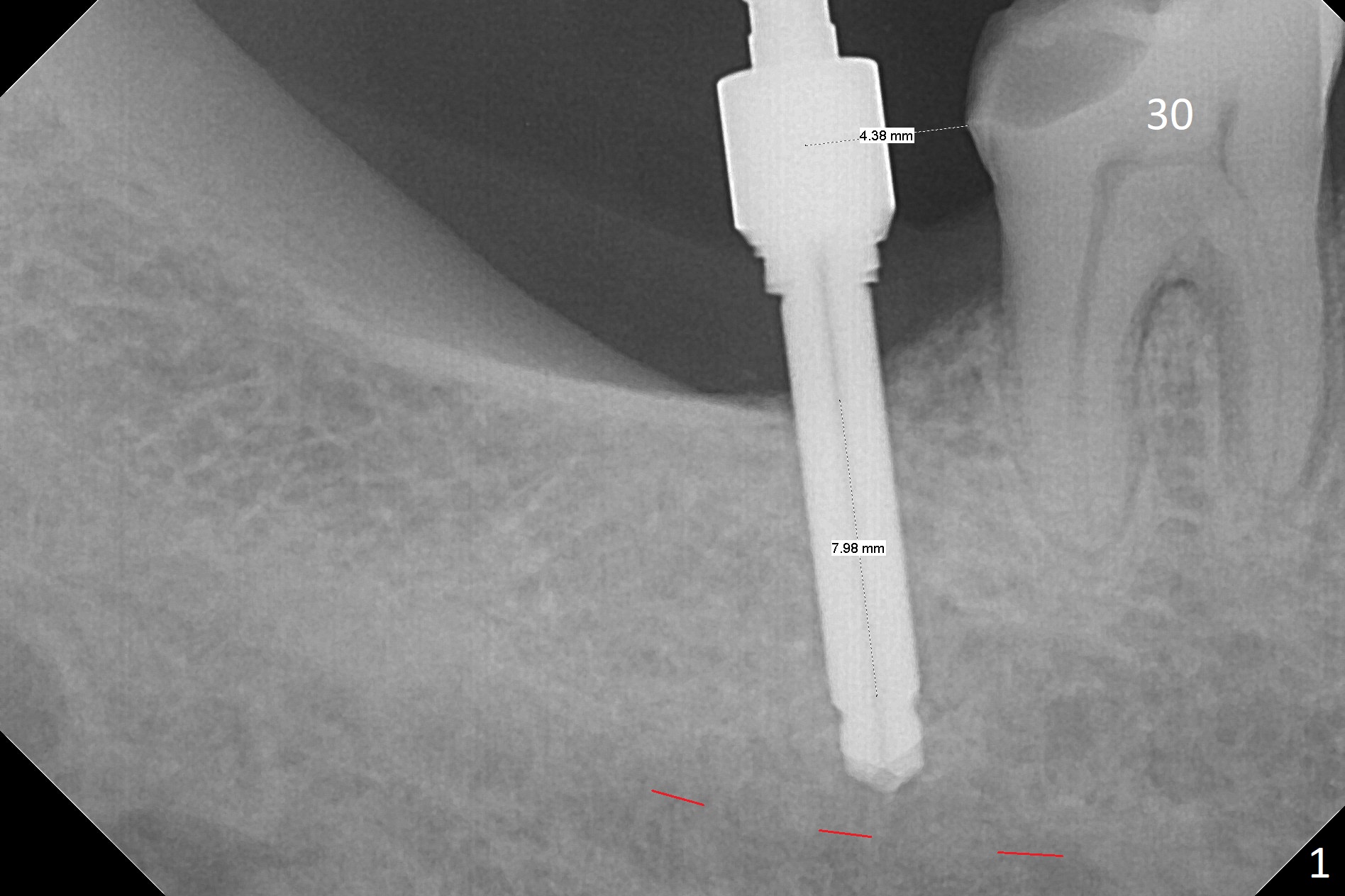 The ridge at #31 is wide buccolingually, but uneven with buccal lower. When a 3 mm drill reaches 13 mm in depth (Fig.1 (gingival level, flapless with Magic Split)), the patient feels pain with the osteotomy close to the Inferior Alveolar Canal (red dashed line). Subsequent osteotomy depth gradually reduces to 11.5 and 10.0 mm before placing a 4.5x8.5 mm implant initially with high torque. After rewinding, the implant is placed deeper (Fig.3 (implant plateau being even with the buccal crest)); a 5.5x4(2) mm healing abutment is placed due to severe supraeruption of the tooth #2. The patient refuses orthodontic intrusion. A prepped 5.5x4(2) mm cemented abutment is placed 6.5 months postop (Fig.3). After reduction of the lingual cusp of the tooth #2 (barely clearance), a provisional is fabricated at #31 to intrude the opposing tooth.