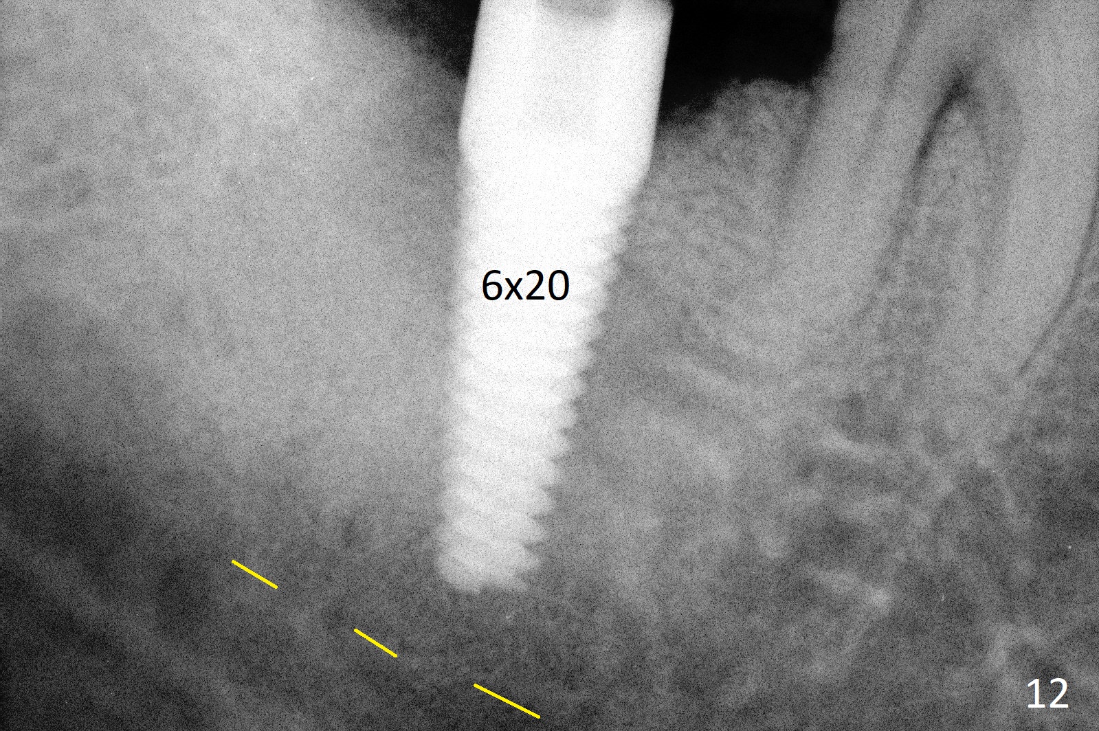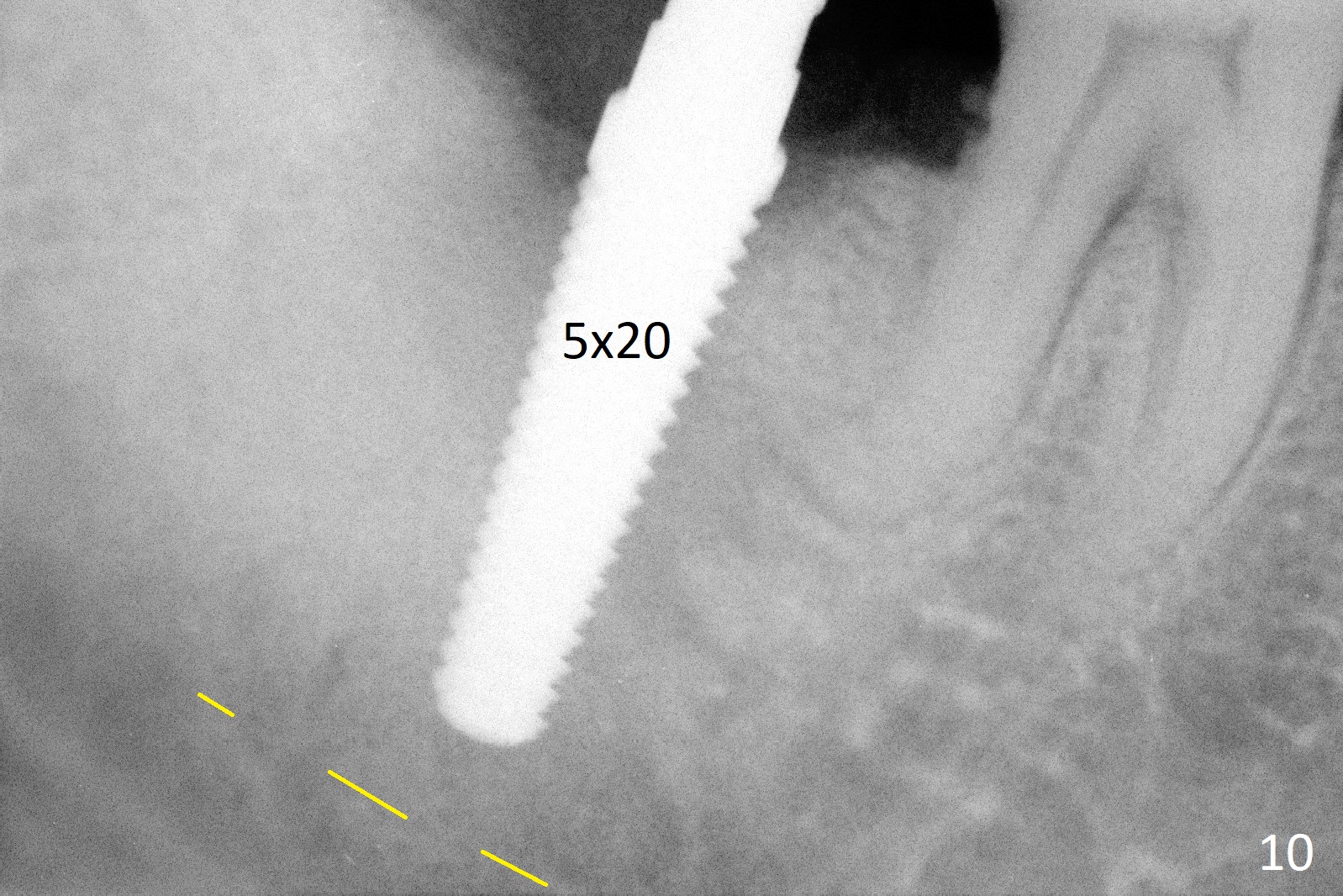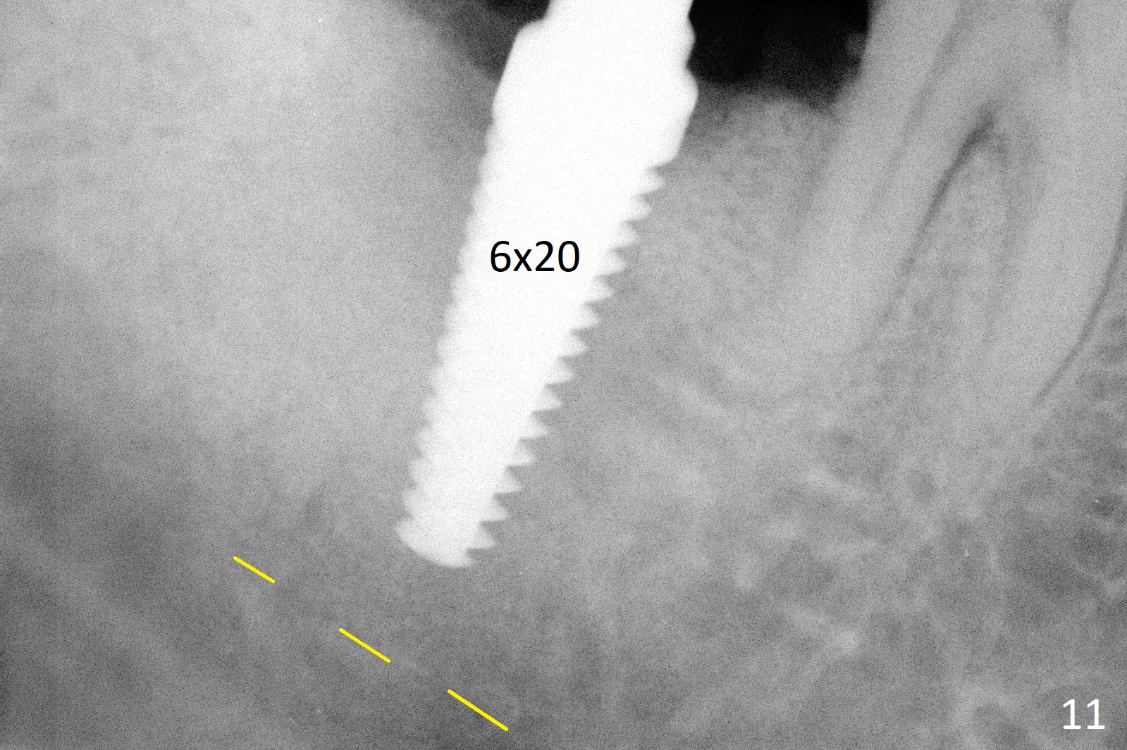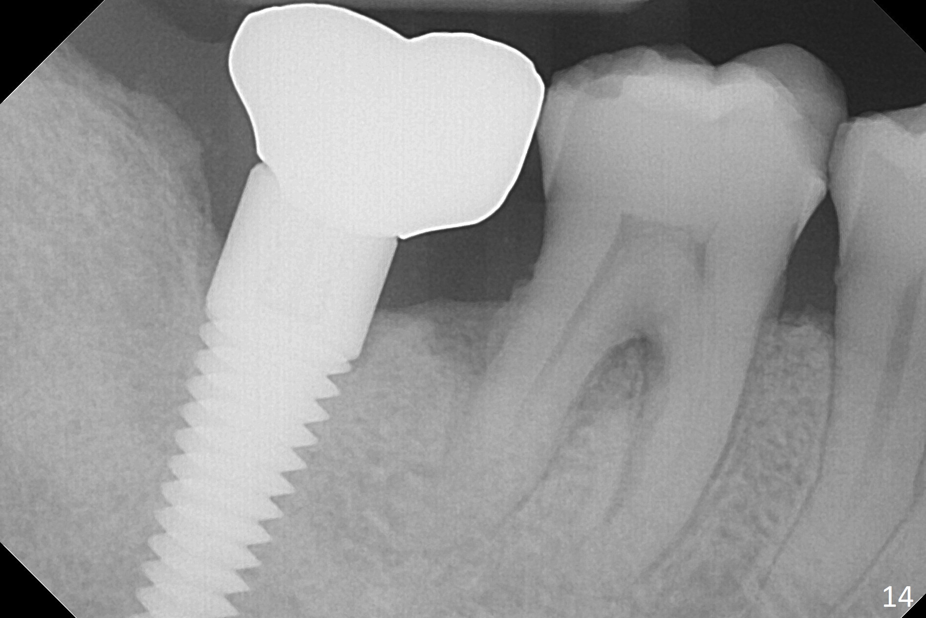 A 50-year-old man, a smoker, presents to clinic with pain of the tooth #15 with apparently occlusal trauma (Fig.1). Two years and three months after #15 extraction, he returns for #31 extraction (Fig.2) and socket preservation (Fig.3). The socket depth is 17 mm along the long axis of the socket 2.5 months post extraction (Fig.4, gingival level). Initial osteotomy is created in the mesial slope of the socket for 14 mm (Fig.5). After sequential osteotomy, a 6x17 mm tap is seated shallower (Fig.6) than the 2 mm drill (Fig.5). Following further osteotomy, a 7x14 mm implant is seated incompletely (Fig.7), which was not found intraop. The implant becomes loose with purulent discharge 19 days postop. The patient returns for 2nd placement 2 months post implant removal (Fig.8). Osteotomy is created probably in the mesial slope with 17 mm (bone level, Fig.9). After insertion of 5 (Fig.10) and 6 (Fig.11) x20 mm taps (tissue level), a 6x20 mm tissue-level implant is placed with clearance from the Inferior Alveolar Canal (Fig.12 yellow dashed line). The implant is restored 8.5 months postop (Fig.13) without bonding 5 mm 0 degree unipost. The crown dislodges 4 months post permanent cementation. Still the patient complains of small crown without occlusal contact. Impression is taken for a new normal-sized crown. The new crown becomes loose 1 year 9 months post cementation (Fig.14). The teeth #14 and 15 remain unrestored.