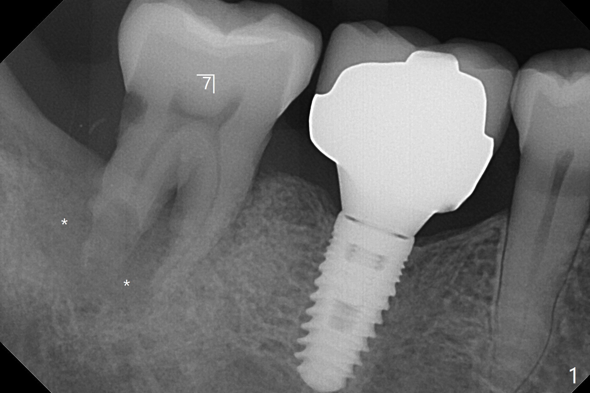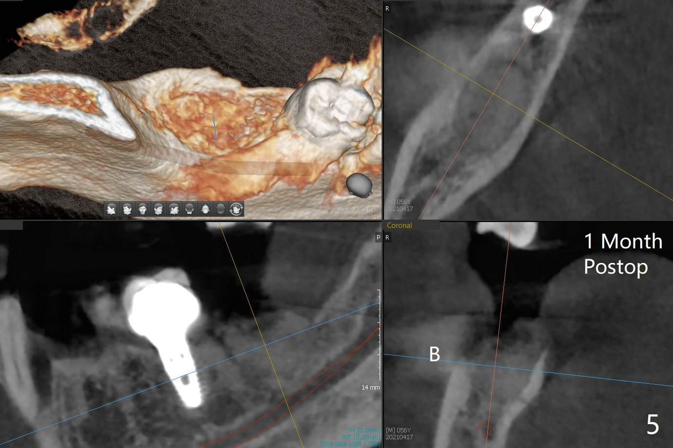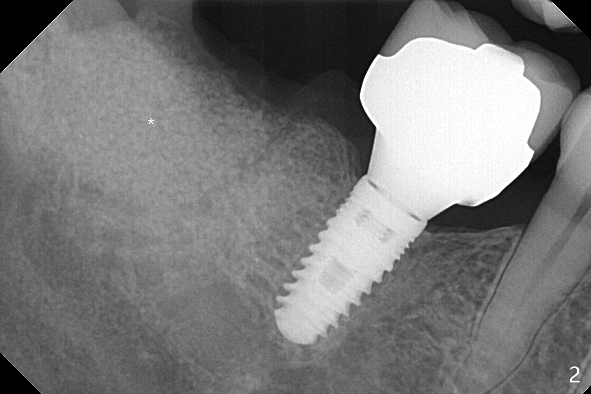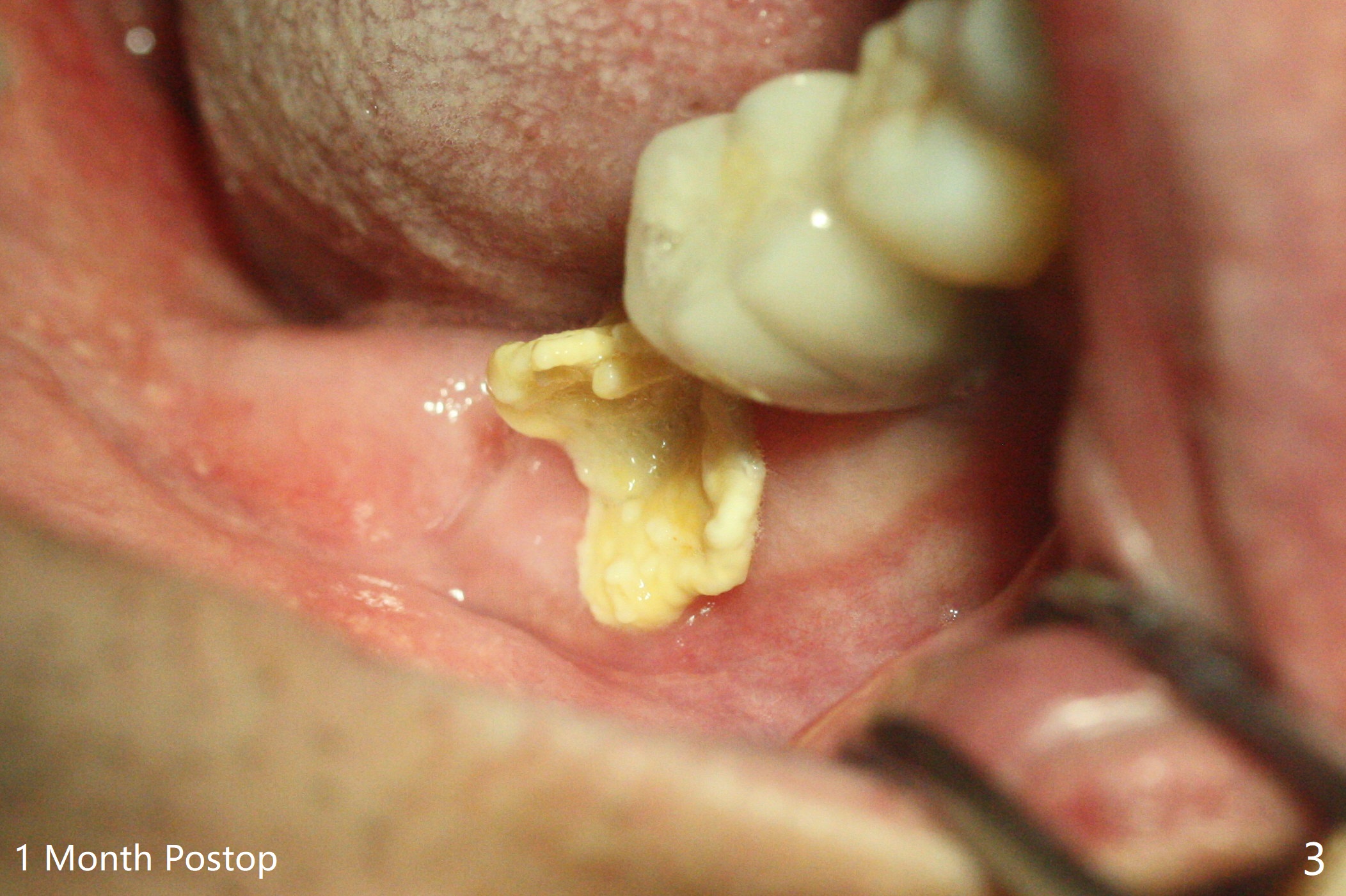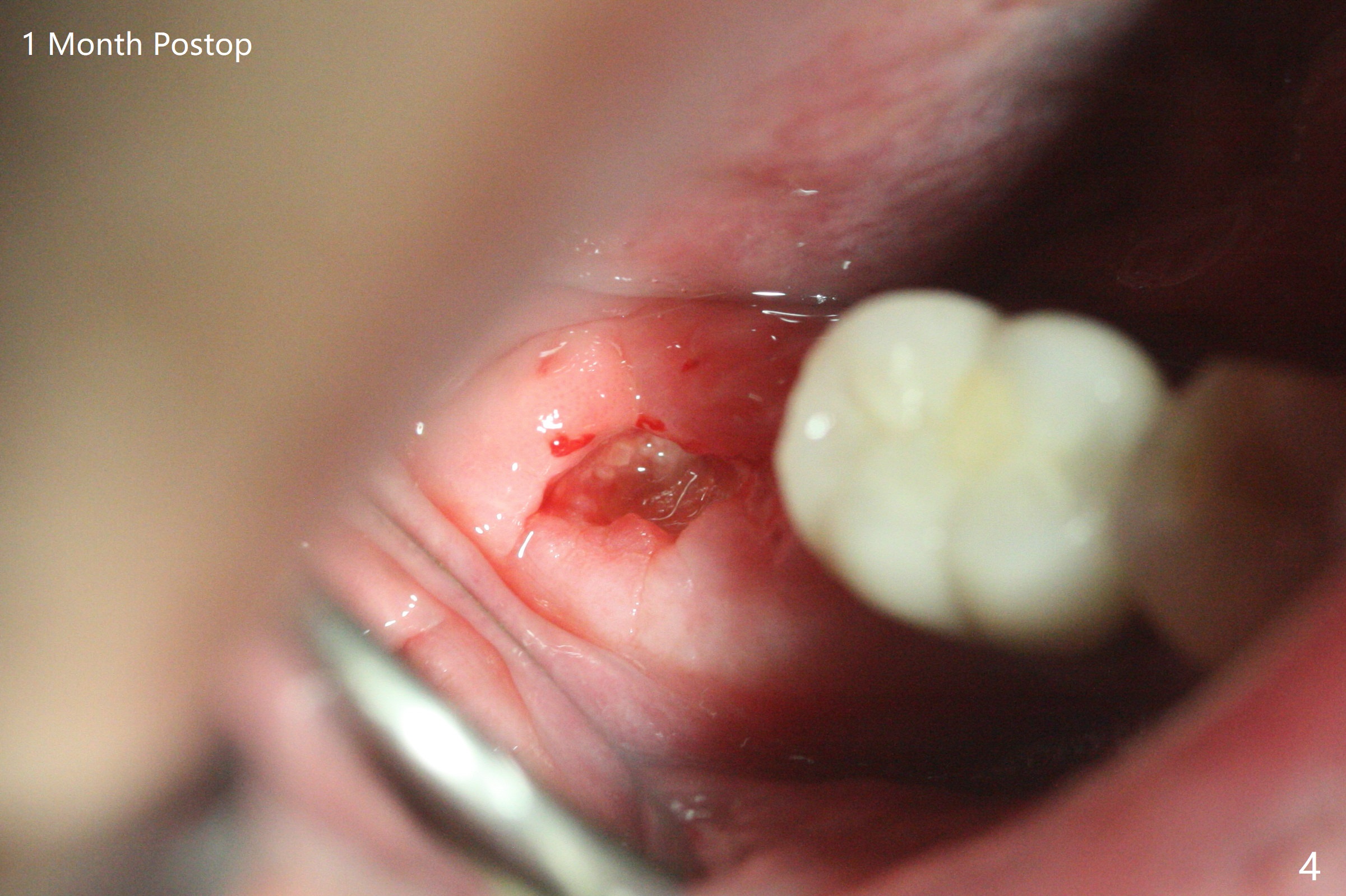 56岁男严重牙周炎,要求拔除右下7(图一),病人特别提出彻底清除炎性组织,GEM21S与皮质骨粉调袢5分钟后放置清创的牙槽窝(图二:*),覆盖Cytoplast,4-0 PTFE缝合。术后一个月膜游离(图三),撤线(缝线不是故意穿过膜)后,膜去除,下面骨粉好像稳定(图四至六)。