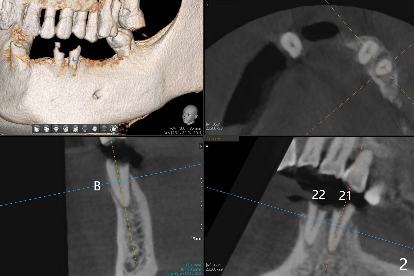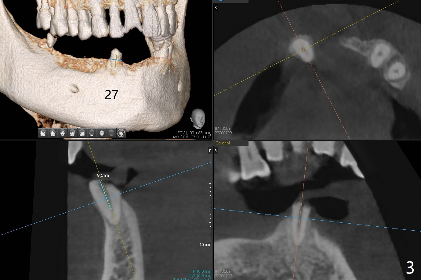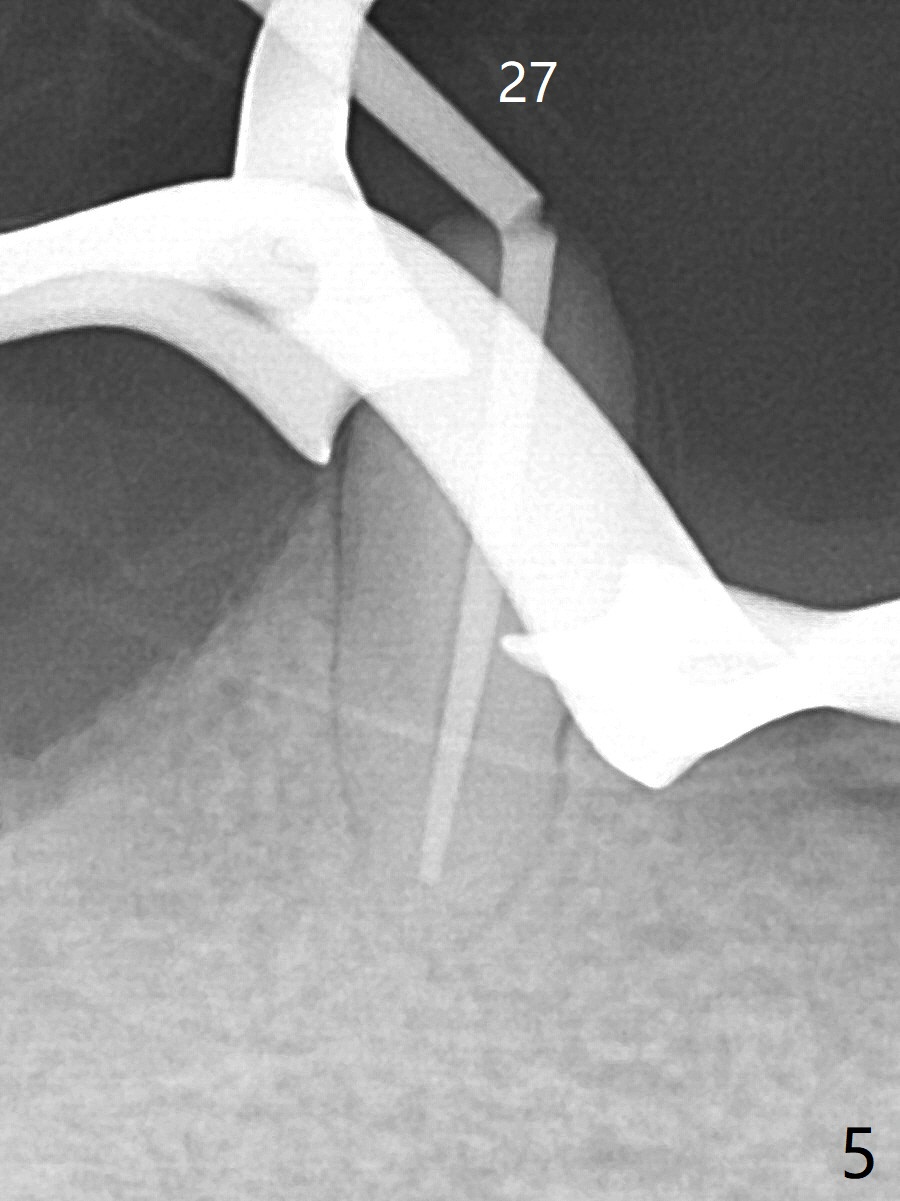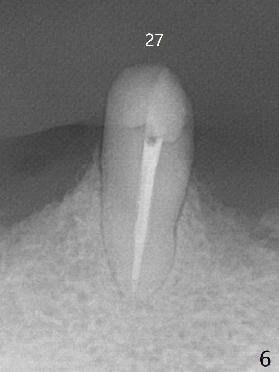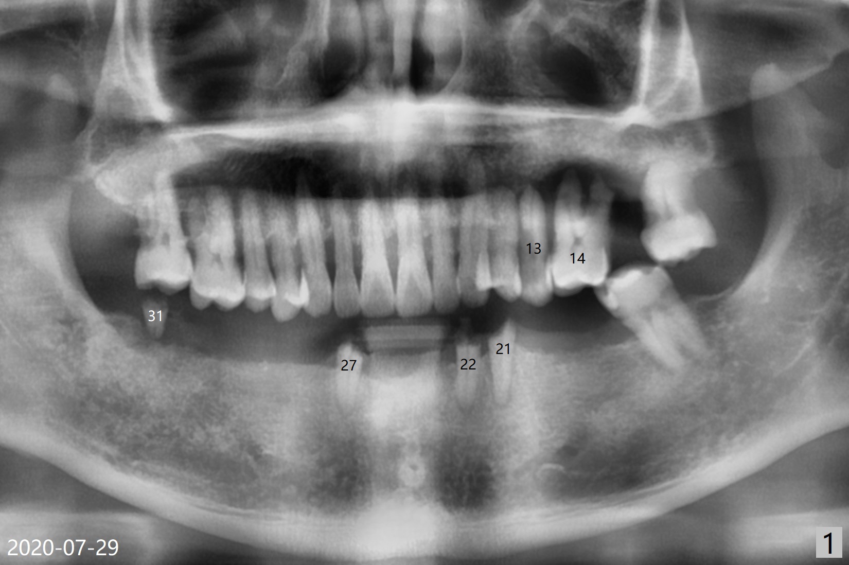 60岁男两年前回国制作下颌活动假牙,之后没有什么护理,五个基牙四个坏的厉害(图一(上面):21,22,27,31),初步计划:21,22,27号牙根管治疗(图二,三),31号牙拔除种植(申请保险,图四),都装上球状基台(ball abutment),增加托牙稳定性。当牙根基牙不行时,再逐步改做植牙。深洗和14号牙(图一)拔出后十四天病人回来进行27号牙(右下3)根管治疗(图五,六),工作长度13毫米,合适打桩做牙冠吗(原有局部托牙有卡环(Clasp and rest)?还是安置球冒更恰当?