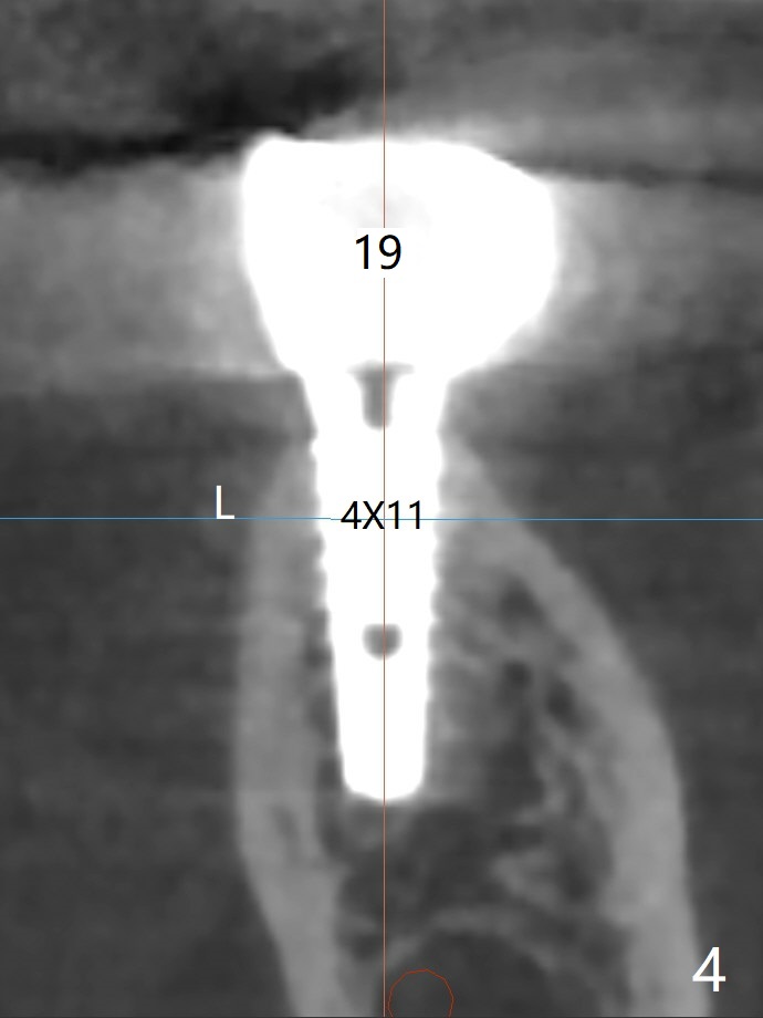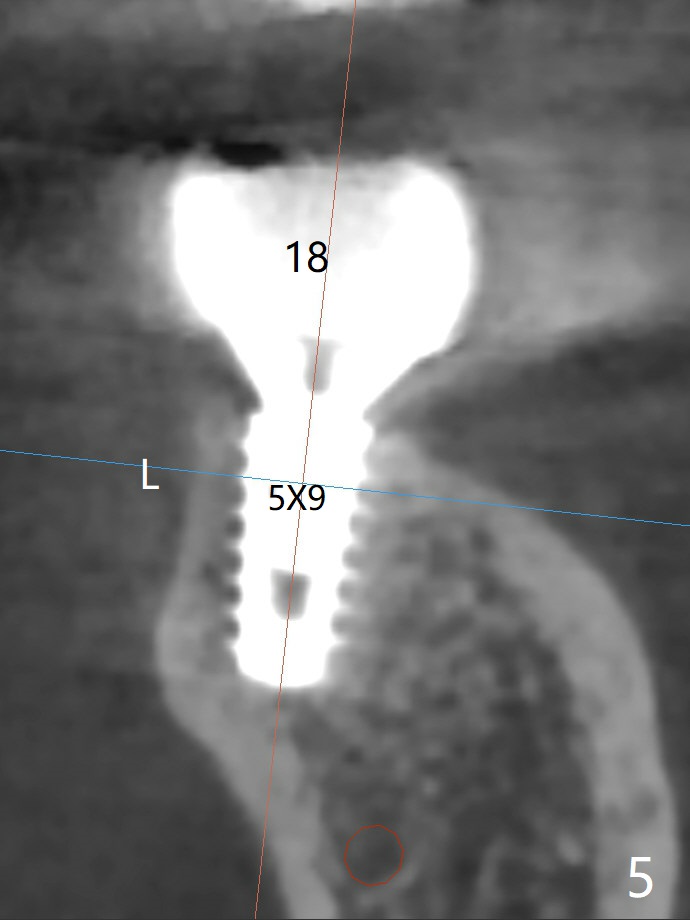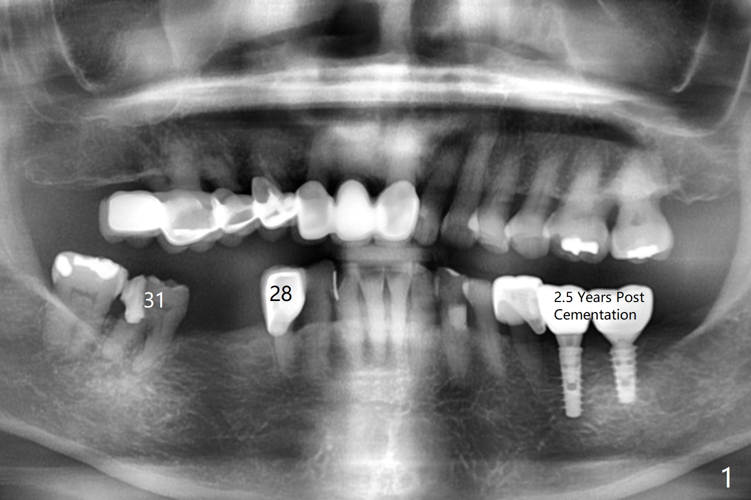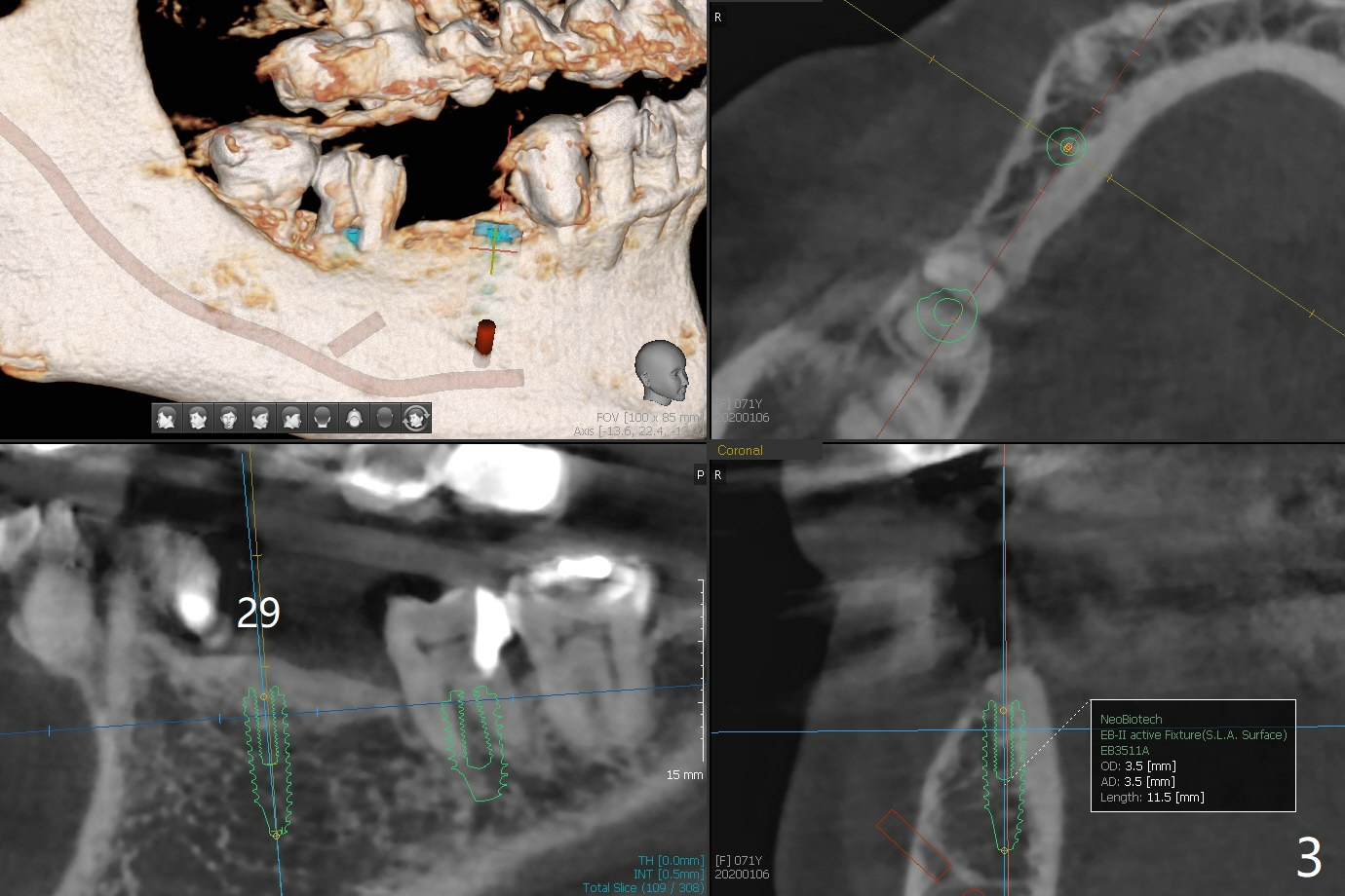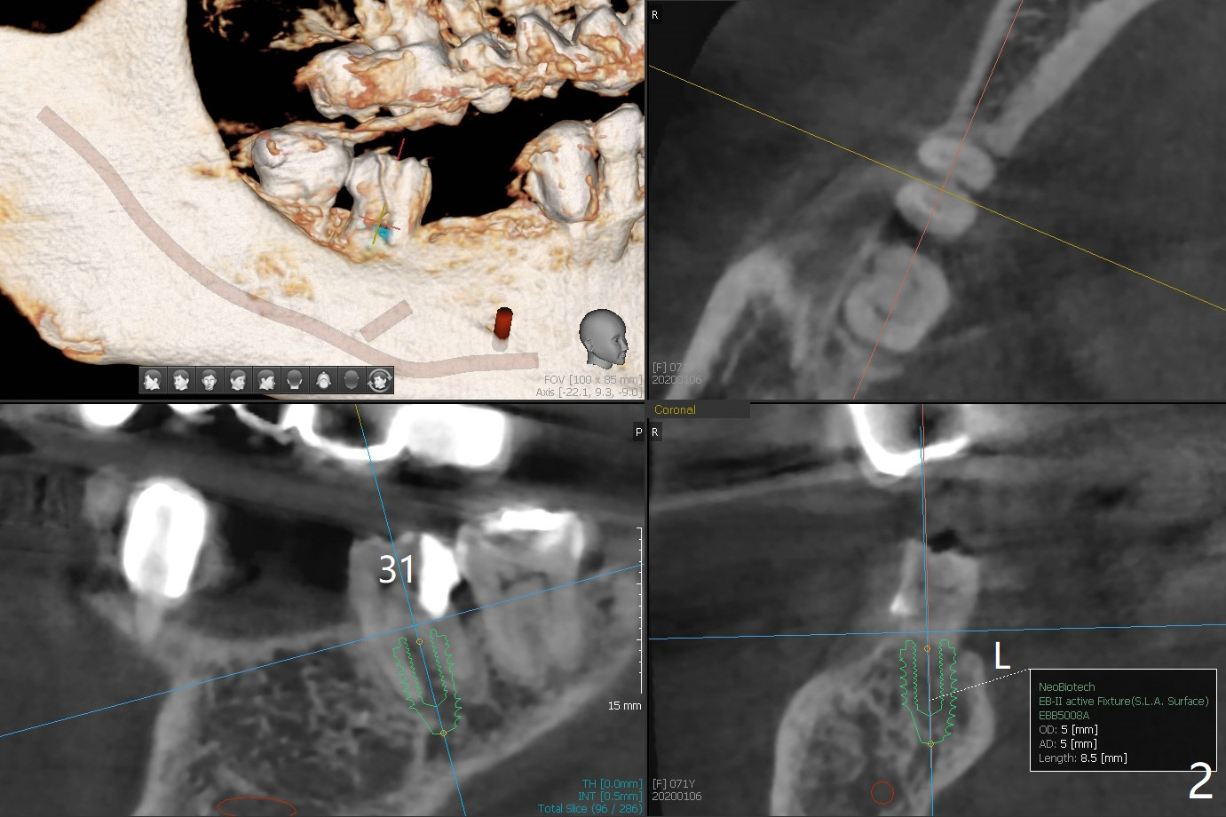A 71-year-old woman has failed retainer at #31 (Fig.1). Implants will be placed at #31 and 29 for a FPD (Fig.2,3, as compared to Fig.4,5). The ridge at #29 is narrow with thick lingual plate. To avoid buccal deviation, coronal osteotomy overprep will be conducted.