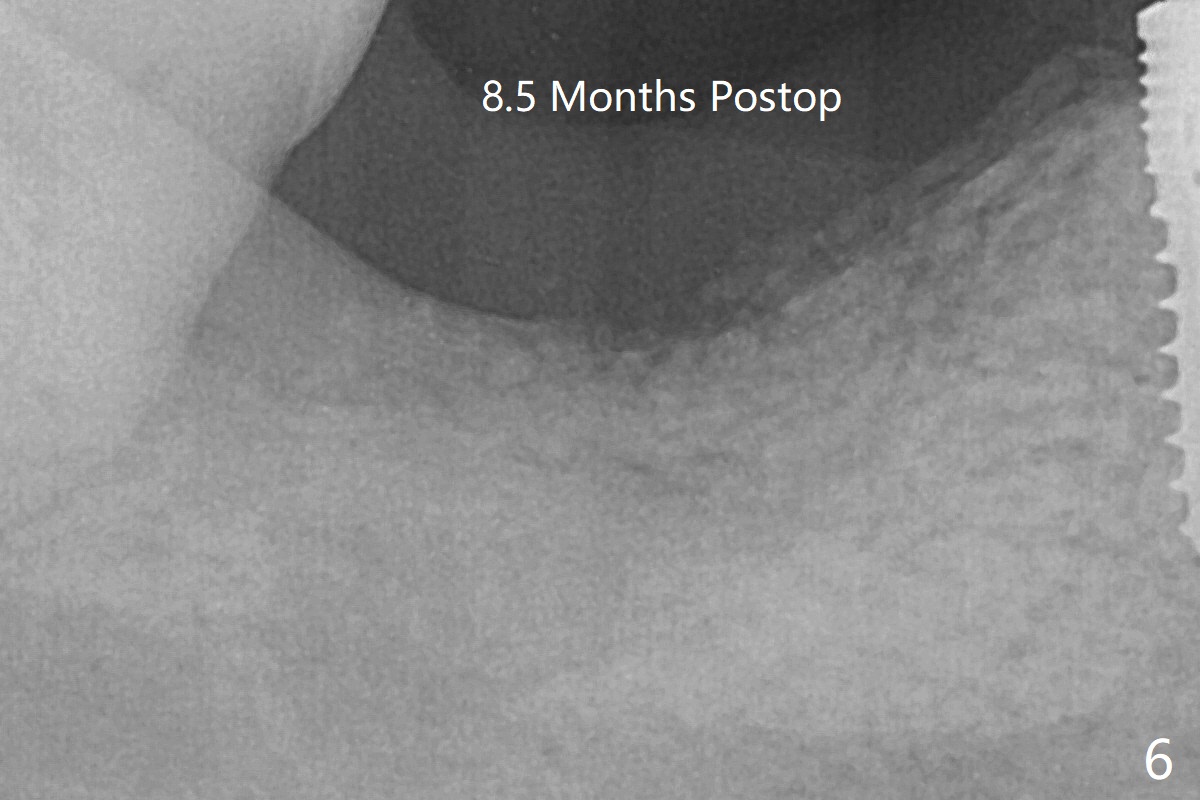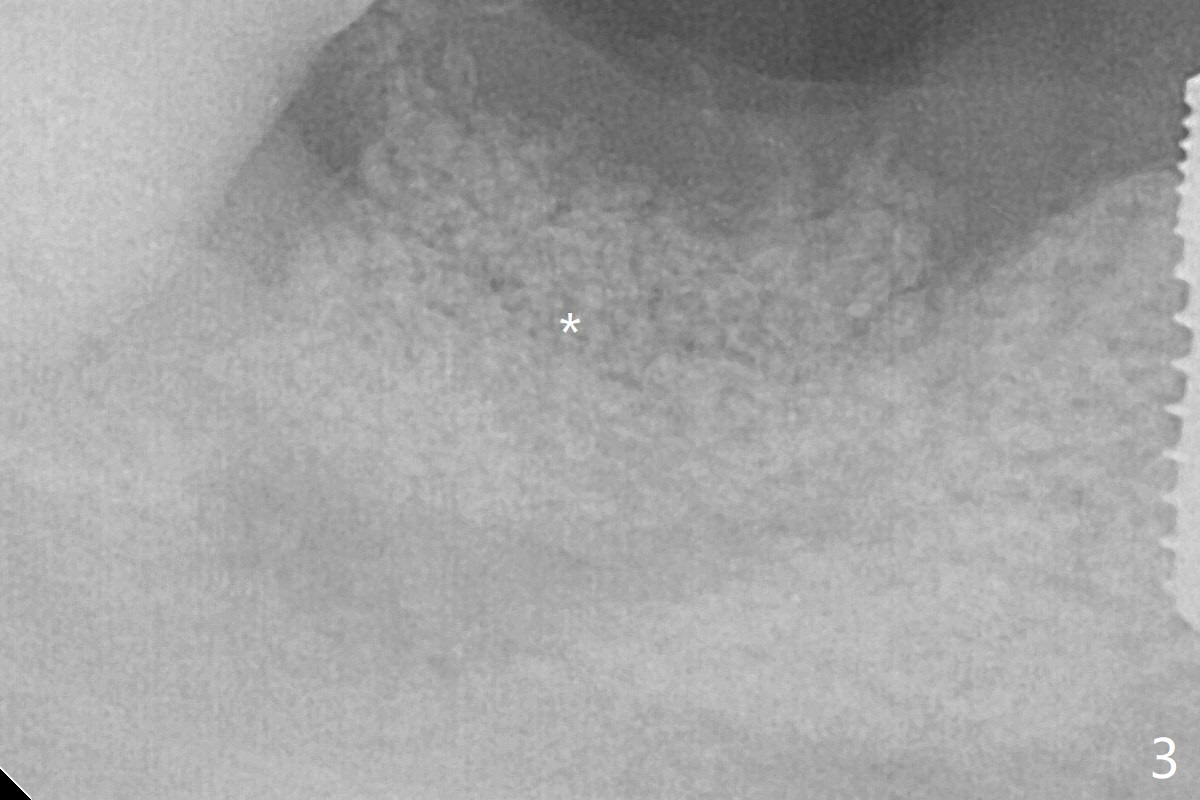 The deep soft tissue socket with hemorrhage after extraction presents difficulty in debridement of granulation tissue apically. After placement of allograft (Fig.3 *) and overlying collagen membrane (Fig.2 C), the socket is closed with 4-0 Chromic gut suture. The bone graft seems to have lost in 8.5 months (Fig.6).