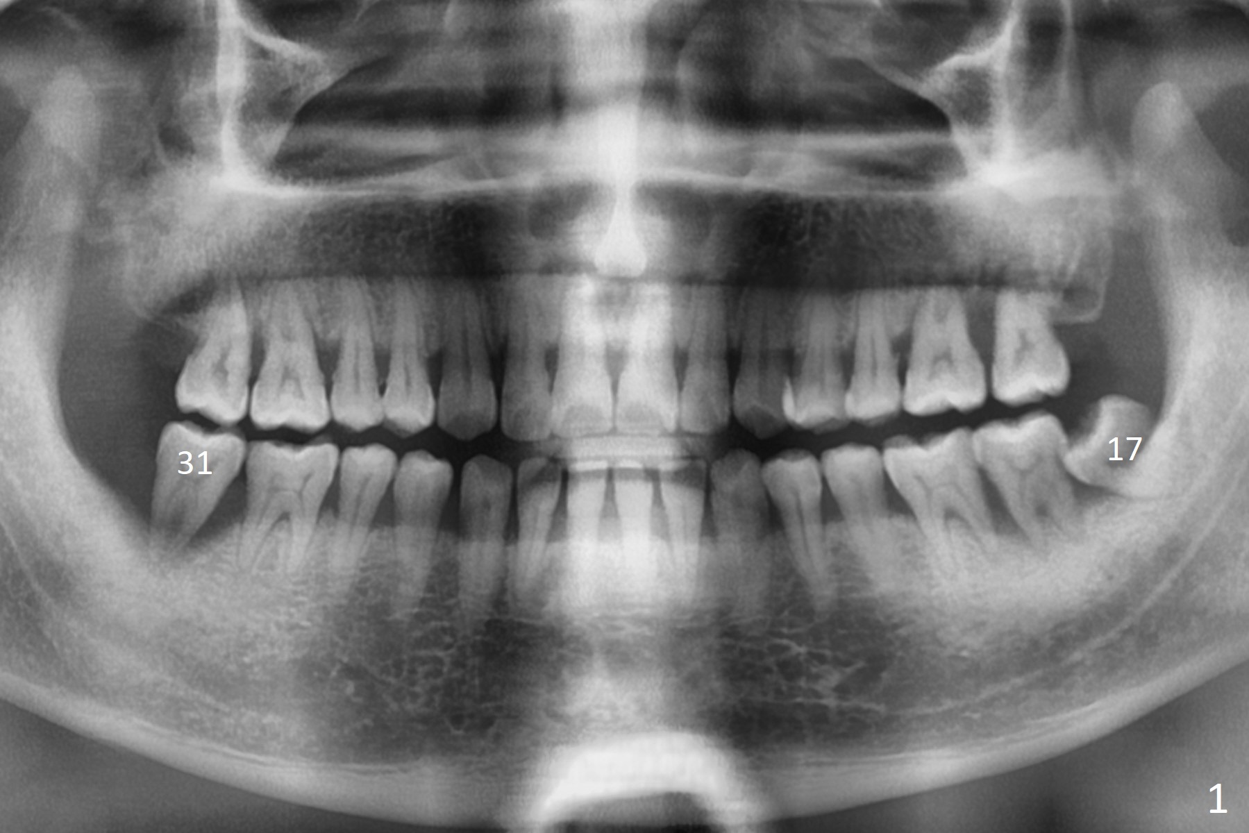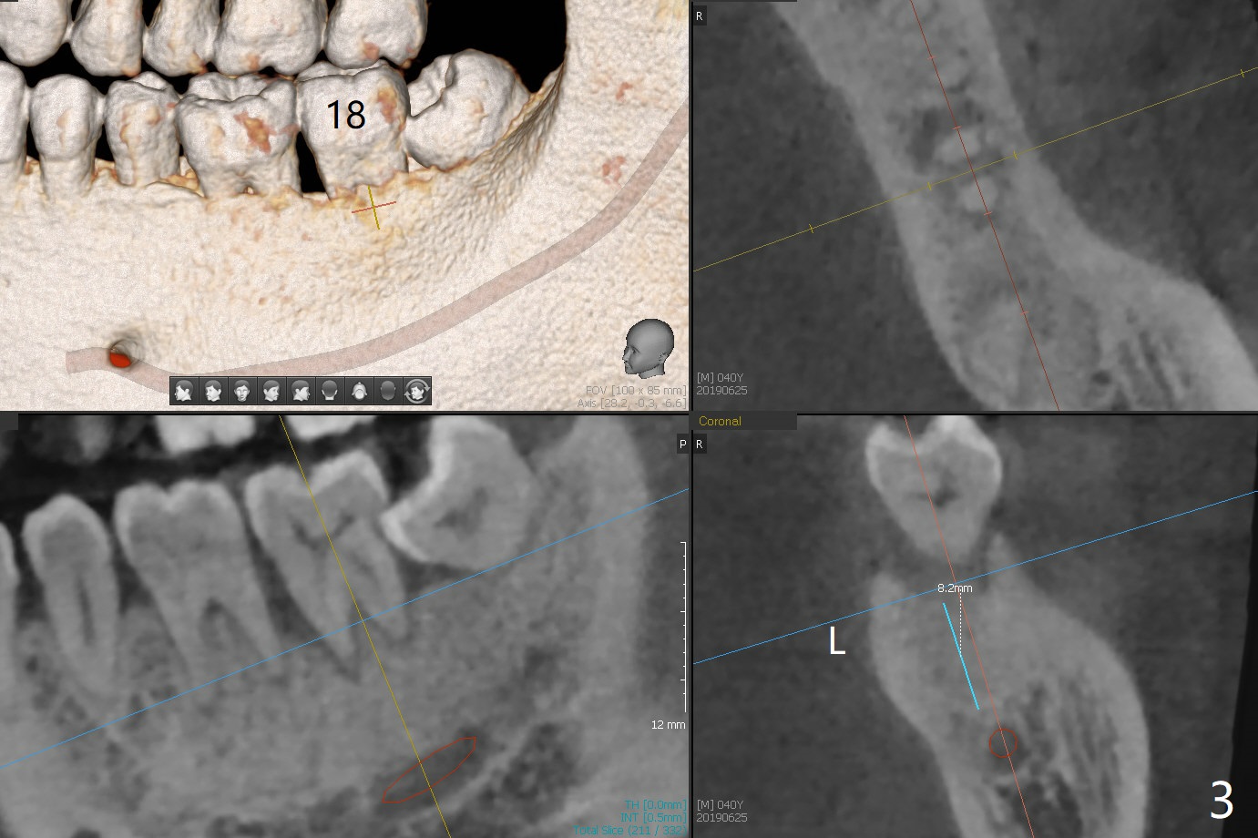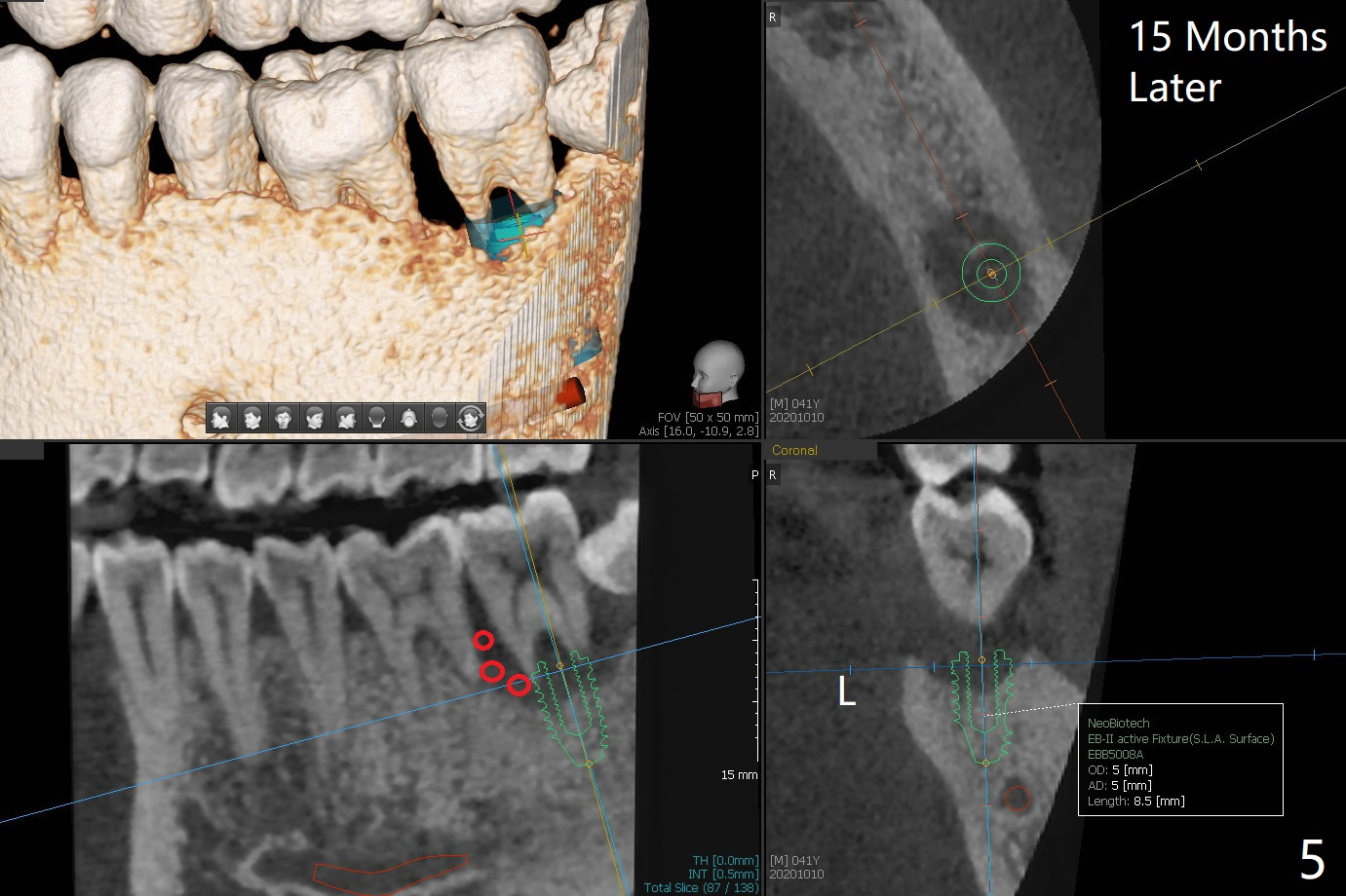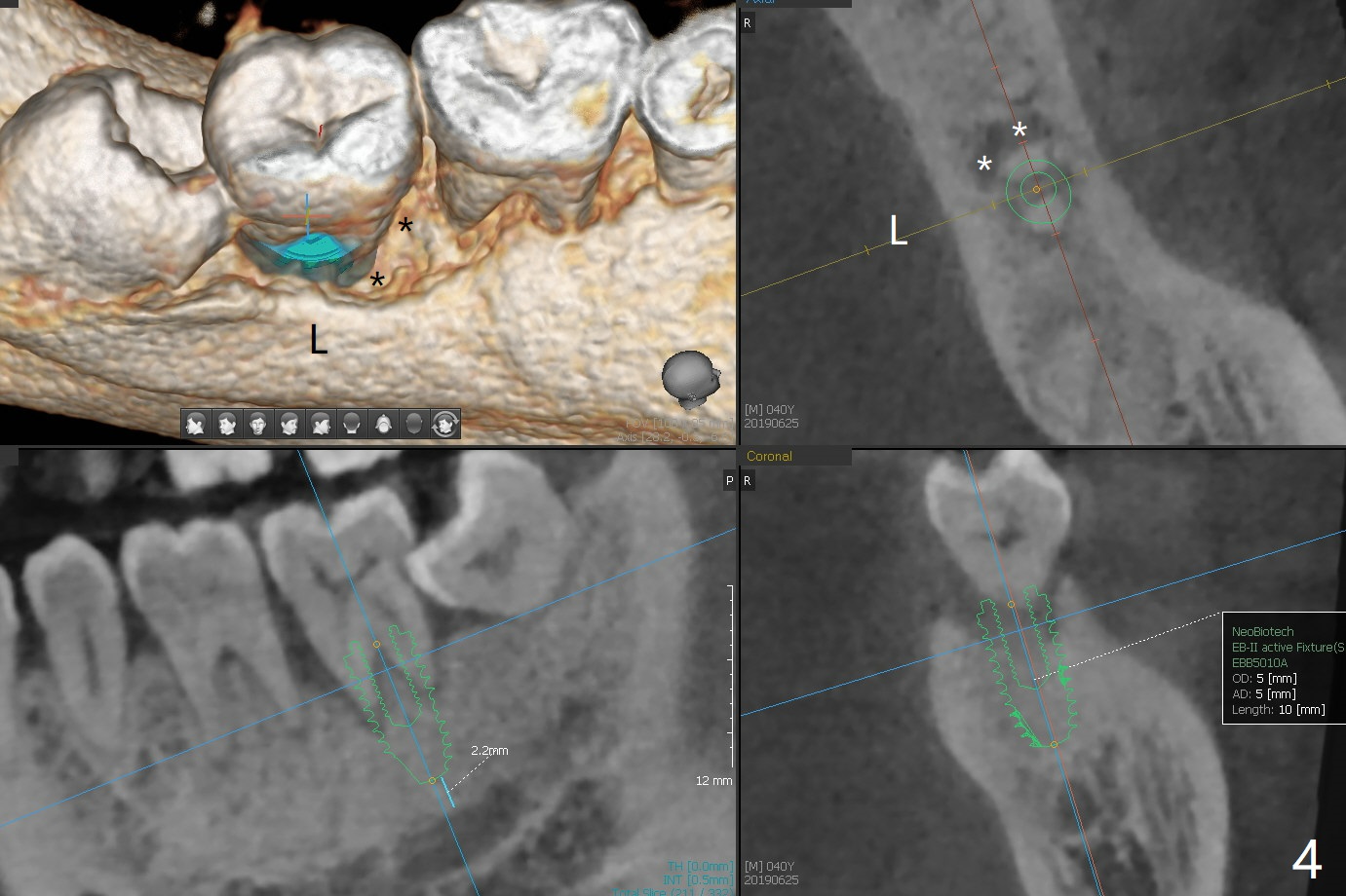 A 40-year-old man (smoker, 1ppd) is concerned about #31 mobility (Fig.1). Gross debridement is finished in his 1st appointment, while impression is taken for guide in his 2nd one. SRP has been scheduled for lower right quadrant with #31 extraction and immediate implant (Fig.2). The tooth #17 extraction will be postponed. The extraction may lead to mobility of the tooth #18, although SRP for the other 3 quadrant will be scheduled 1 week post #31 surgery. Smoke reduction is encouraged. When the crown is delivered at #31 one year later, the tooth #18 is loose (Fig.3) with lingual fistula. Since bone loss is more severe lingual (L *), a 5x10 mm immediate implant will be placed buccal (Fig.4). The tooth #17 will be kept as a distal stop for guide and extracted after #18 implant placement. Bone loss at #18 is more severe with mobility 15 months later; a shorter implant will be placed (Fig.5). After local scaling & root planing of the distal surface of #19 and application of Endogain, place sticky bone (red circle). Insert Collagen or Osteogen Plug in the #17 sockets.