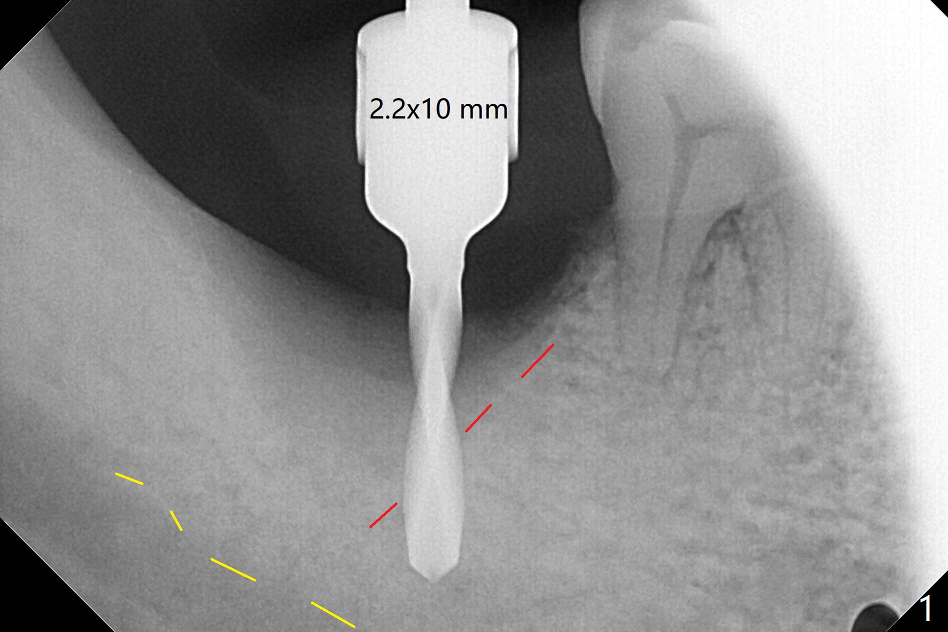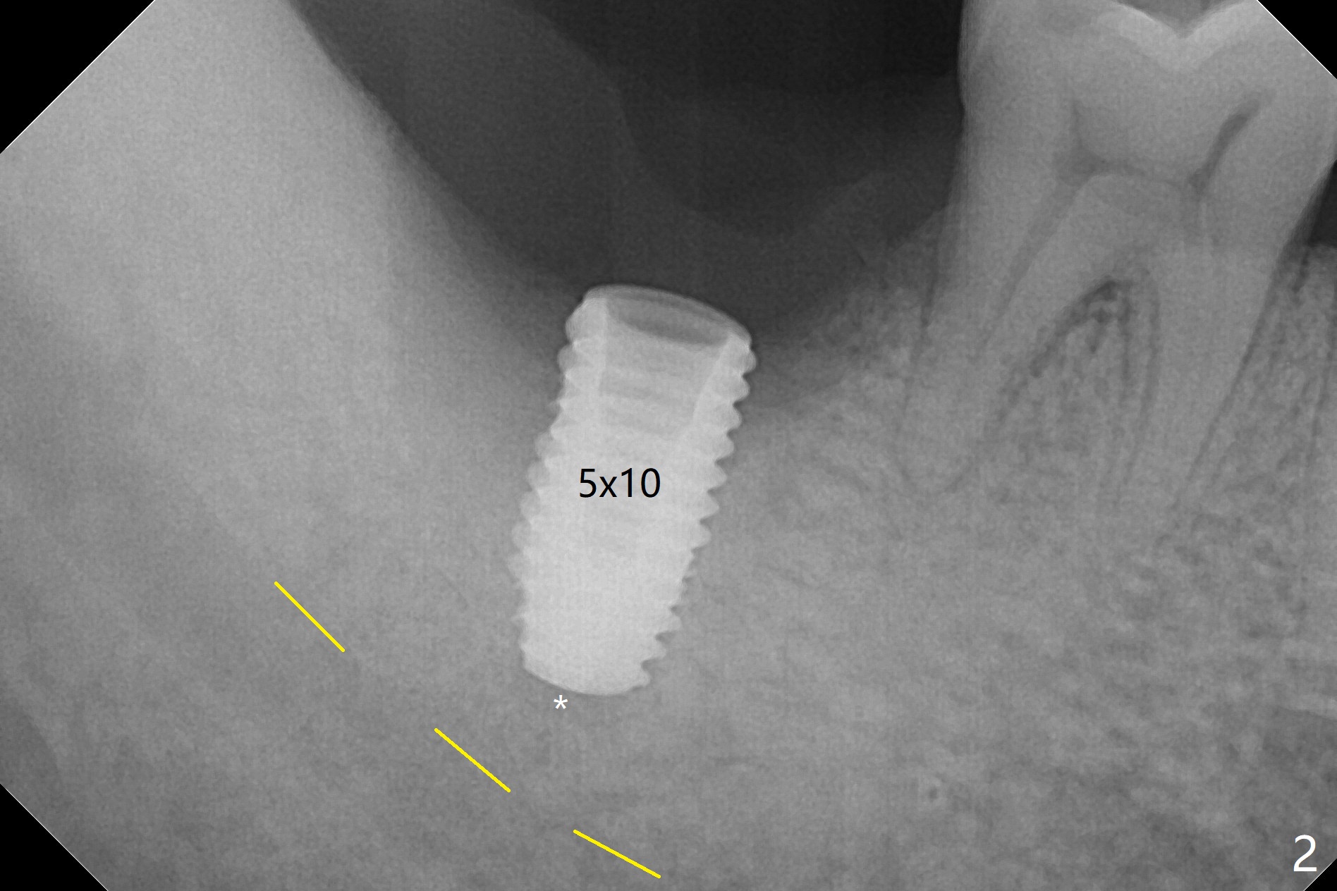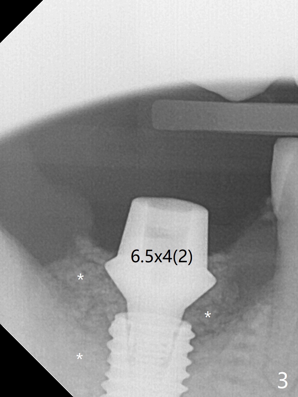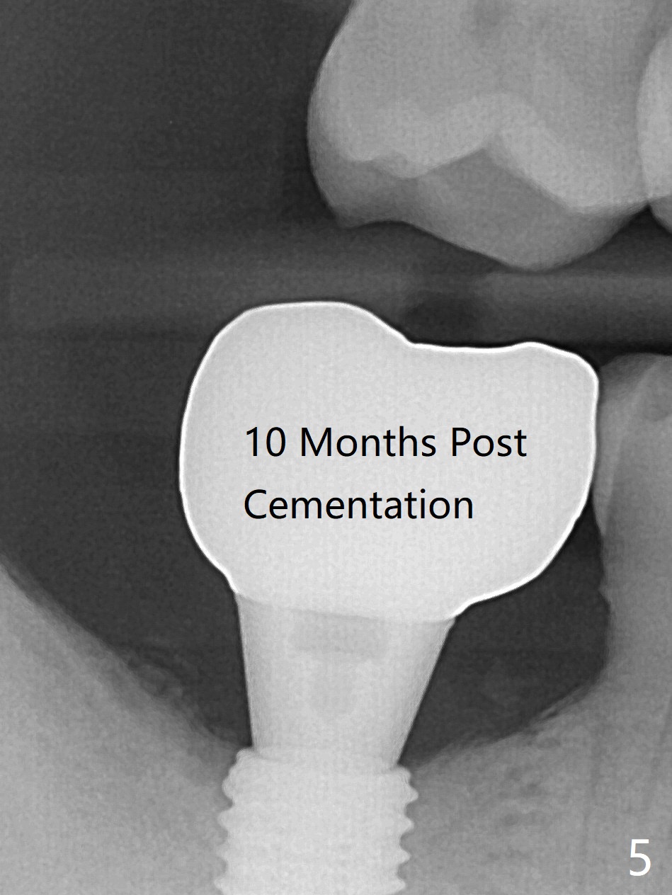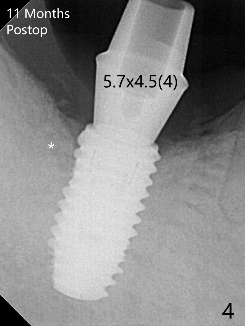 The morning case shows that to avoid Inferior Alveolar Neuropathy associated with 2nd molar implant placement, three measures should be adopted, no block anesthesia, no pressure on the distal end of the distal end guide and no over deep placement. In fact pain control is difficult with severe chronic periodontitis at #31. After repeated infiltration injection, the most effective step of anesthesia is slow speed of osteotomy with gentle pressure. The 1st intraop PA is taken when the depth is reached with a 2.2 mm pilot drill (Fig.1 (yellow dashed line: superior border of the Inferior Alveolar Canal)). The 2nd purpose of the PA is to make sure that the osteotomy is establish in the mesial slope of the socket (red dashed line). As drills increase in diameter, the patient experiences pain. Since the bone density is high, it is hard to place 5x10 mm implant to the lowest space (Fig.2 *, ~ 60 Ncm). For compensation, bone graft (Fig.3 *) is packed securely around the implant before and after abutment insertion. After fabrication of an immediate provisional, periodontal dressing is applied around the provisional and socket to prevent graft leakage. Smoke cessation/reduction is encouraged. In fact the patient returns 11 months postop (the 1st time postop), partly due to coronavirus. The immediate provisional is lost, but the distal defect has apparently been repaired (Fig.4*). A 4 mm cuff abutment is changed to due to enough occlusal clearance. The abutment is completely seated. Oral hygiene is poor with 1/2 ppd of smoke. SRP was done in the lower right quadrant when the implant was placed. When the crown is delivered 1 year postop, the patient mentions #18 mobility. SRP is done in the lower left quadrant. The bone is stable 10 months post cementation (Fig.5).