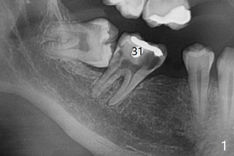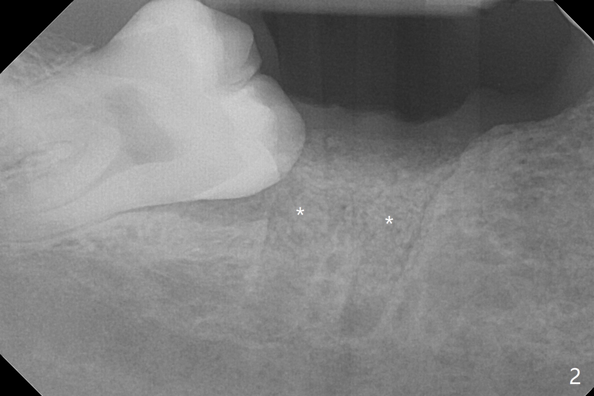 A 50-year-old man requests extraction of the tooth #31 (Fig.1) several months after sedative filling. After placement of Vanilla graft (Fig.2 *) and Osteogen plug, 4-0 Chromic gut suture passes 6-month membrane twice for fixation (figure-8 style), followed by multiple interrupted manner.