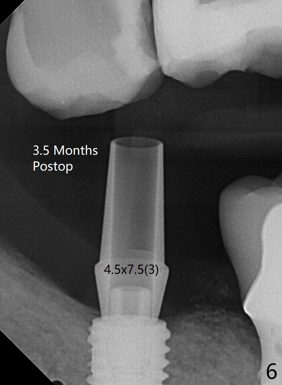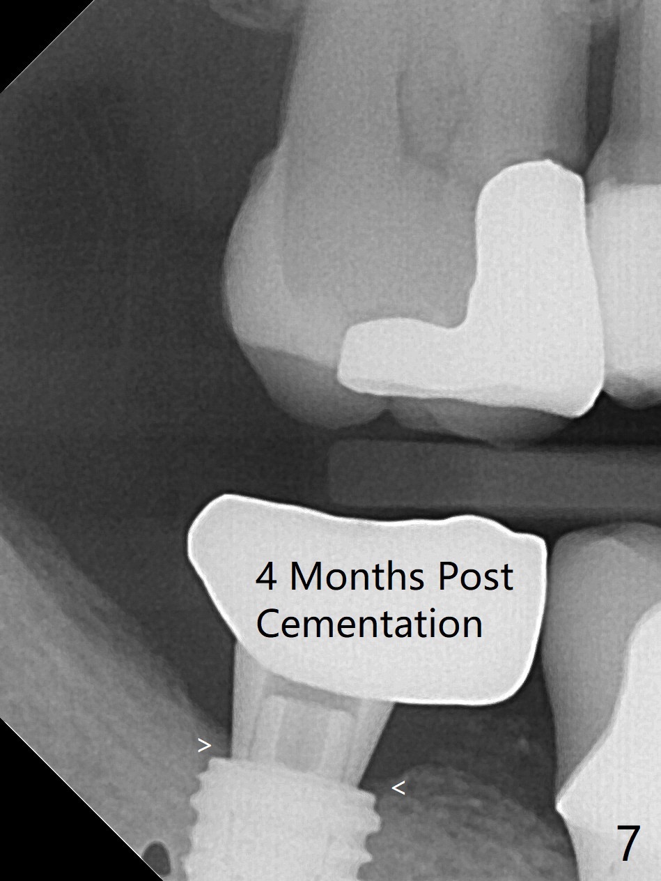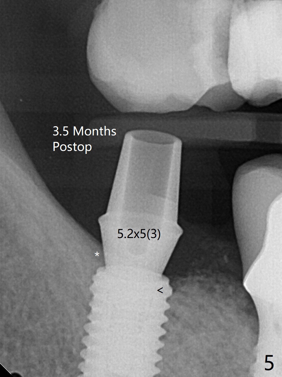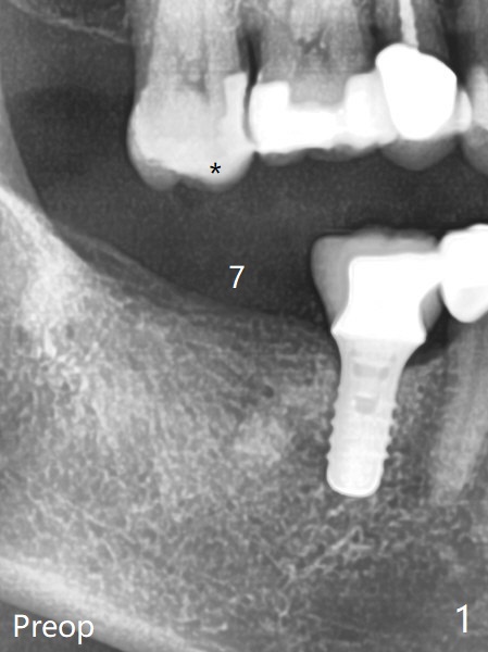 61岁女右下7导板钻洞,第一个钻头(环形钻)就有困难入位,部分磨去对合7近中腭侧牙尖(图一:*),钻头入位就好多了(图二:^,对比)。钻洞时发现骨质密度中等,所以最后钻头直径4.5毫米。不过无法用手植牙工具旋入植体,使用5.0毫米功螺纹钻头后,手工具就好用了,植体植入一定深度,扳手有空间插入,最后扭力30Ncm。第二个问题,当按照设计深度植入植体,用探针检查颊侧好像没有骨壁;加深大约0.5毫米(仿佛没有取到目的,颊侧骨板不明显)后,使用6毫米profile钻头,插入5.5x3毫米愈合基台(图二,三),在基台和颊侧牙龈之间植入异体骨粉,但愿帮助颊侧骨板再生。术后一周内敷料脱落,颊侧伤口愈合,好像骨粉没有流失。术后2.5月愈合基台脱落,换至小号基台(4向毫米),仍旧疼痛,休息2分钟,手拧紧,拍摄根尖片,仿佛就位(图四)。准备一周后调换稍微大,例如,4.8毫米基台。术后3.5个月,5.2毫米基台好像没有就位(图五:<),可能与远中牙槽嵴接触(*)。小一号基台仿佛就位(图六),与远中牙槽嵴无接触。术后4个月粘固后基台螺丝拧紧30Ncm。术后8个月,也就是粘固后4个月,牙槽嵴似乎试图覆盖植体平台(图七:箭头)。