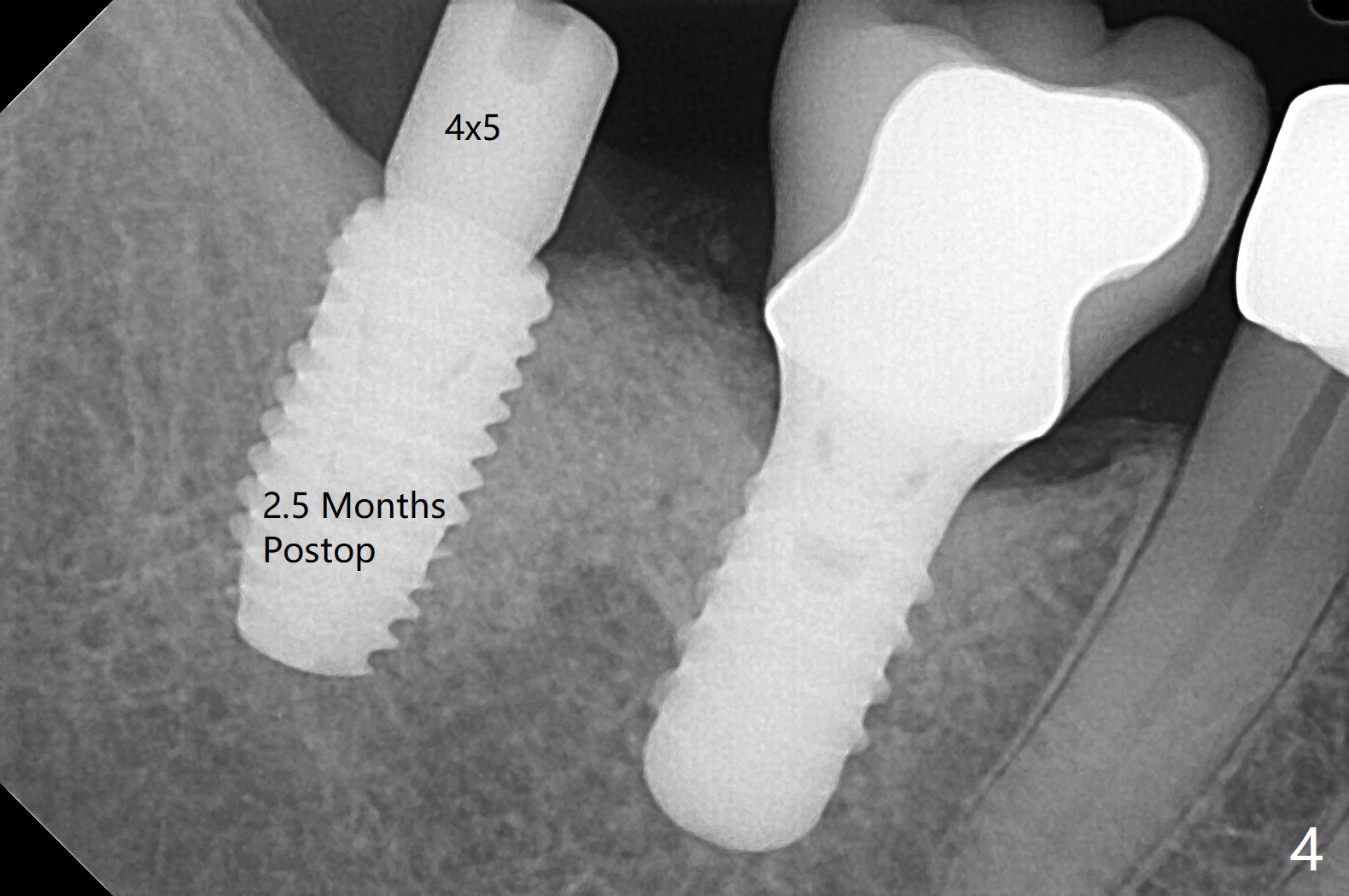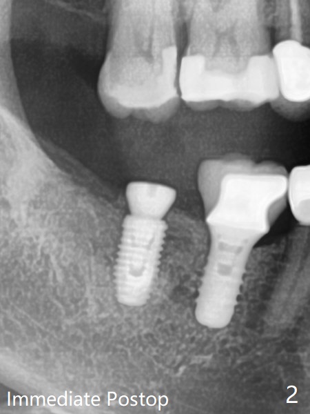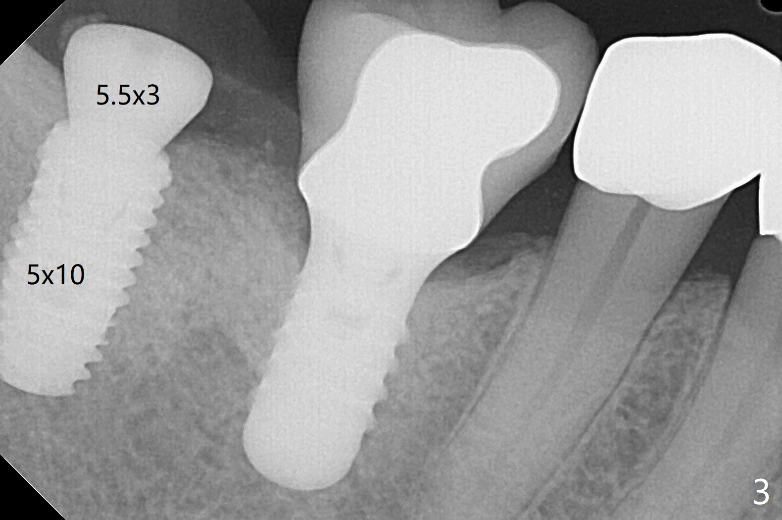 61岁女右下7导板钻洞,第一个钻头(环形钻)就有困难入位,部分磨去对合7近中腭侧牙尖(图一:*),钻头入位就好多了(图二:^,对比)。钻洞时发现骨质密度中等,所以最后钻头直径4.5毫米。不过无法用手植牙工具旋入植体,使用5.0毫米功螺纹钻头后,手工具就好用了,植体植入一定深度,扳手有空间插入,最后扭力30Ncm。第二个问题,当按照设计深度植入植体,用探针检查颊侧好像没有骨壁;加深大约0.5毫米(仿佛没有取到目的,颊侧骨板不明显)后,使用6毫米profile钻头,插入5.5x3毫米愈合基台(图二,三),在基台和颊侧牙龈之间植入异体骨粉,但愿帮助颊侧骨板再生。术后一周内敷料脱落,颊侧伤口愈合,好像骨粉没有流失。术后2.5月愈合基台脱落,换至小号基台(4向毫米),仍旧疼痛,休息2分钟,手拧紧,拍摄根尖片,仿佛就位(图四)。准备一周后调换稍微大,例如,4.8毫米基台。术后3.5个月,5.2毫米基台好像没有就位(图五:<),可能与远中牙槽嵴接触(*)。小一号基台仿佛就位(图六),与远中牙槽嵴无接触。术后4个月粘固后基台螺丝拧紧30Ncm。术后8个月,也就是粘固后4个月,牙槽嵴似乎试图覆盖植体平台(图七:箭头)。