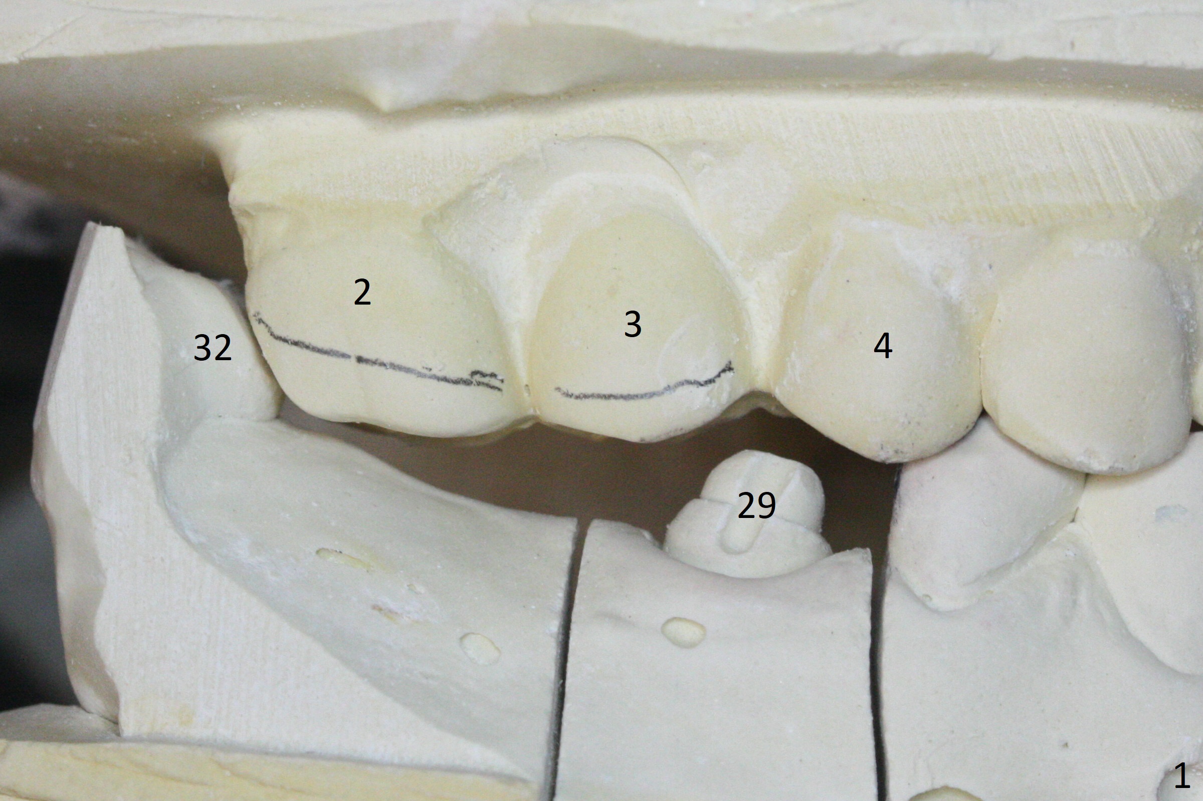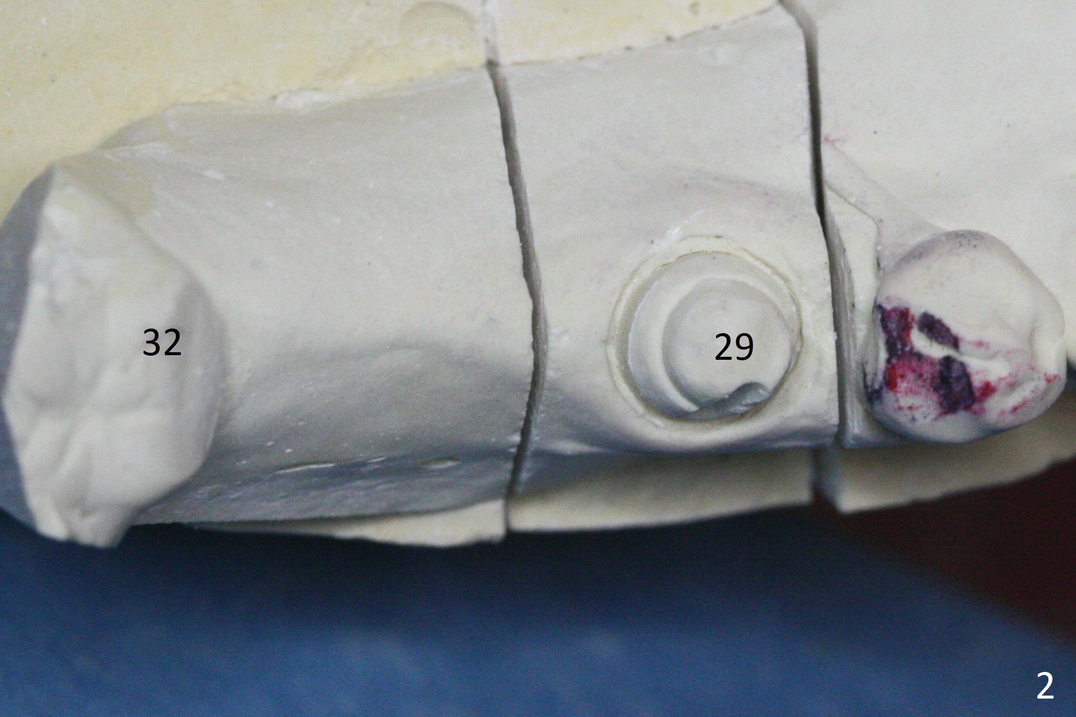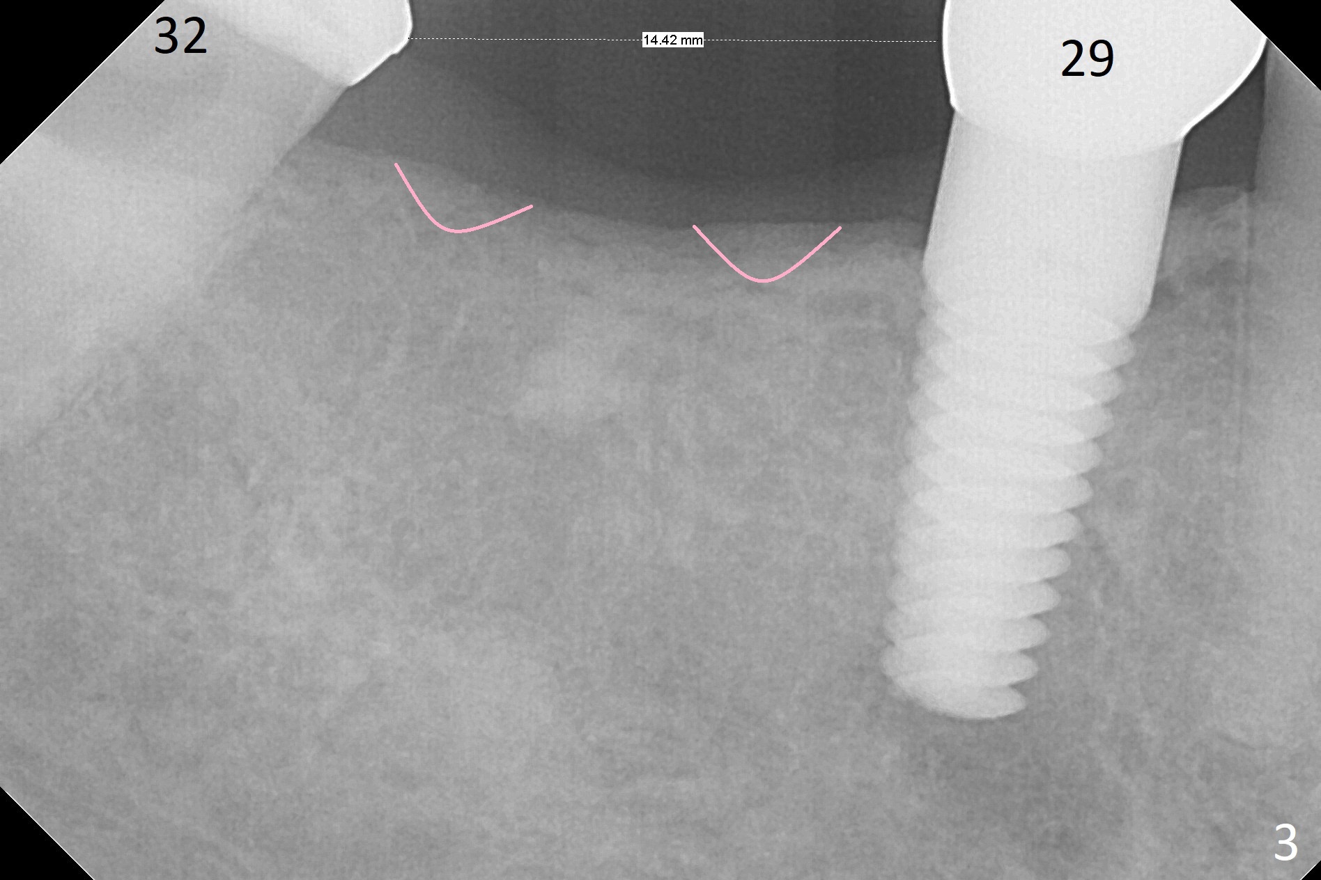 There are 5 steps to tackle the vertical space issue. First, trim the opposing restorations at #2 and 3 (FPD; Fig.1 pencil mark). Second, reduce the ridge prior to osteotomy (Fig.2 pink) so that the implants can be placed deeper with abutment margin 1 mm supracrestally. Third, adjust abutment height and barely create 1 mm occlusal clearance for provisional. Fourth, fabricate the provisional with wide base prior to suturing so that there is sufficient gingival clearance for final impression. Last, fabricate splinted restoration, temporary and permanent, so that there is less chance of crown dislodgement due to limited space (short abutment height). Inform the patient of possible redo of the opposing restoration (#3 implant and #2 crown redo).