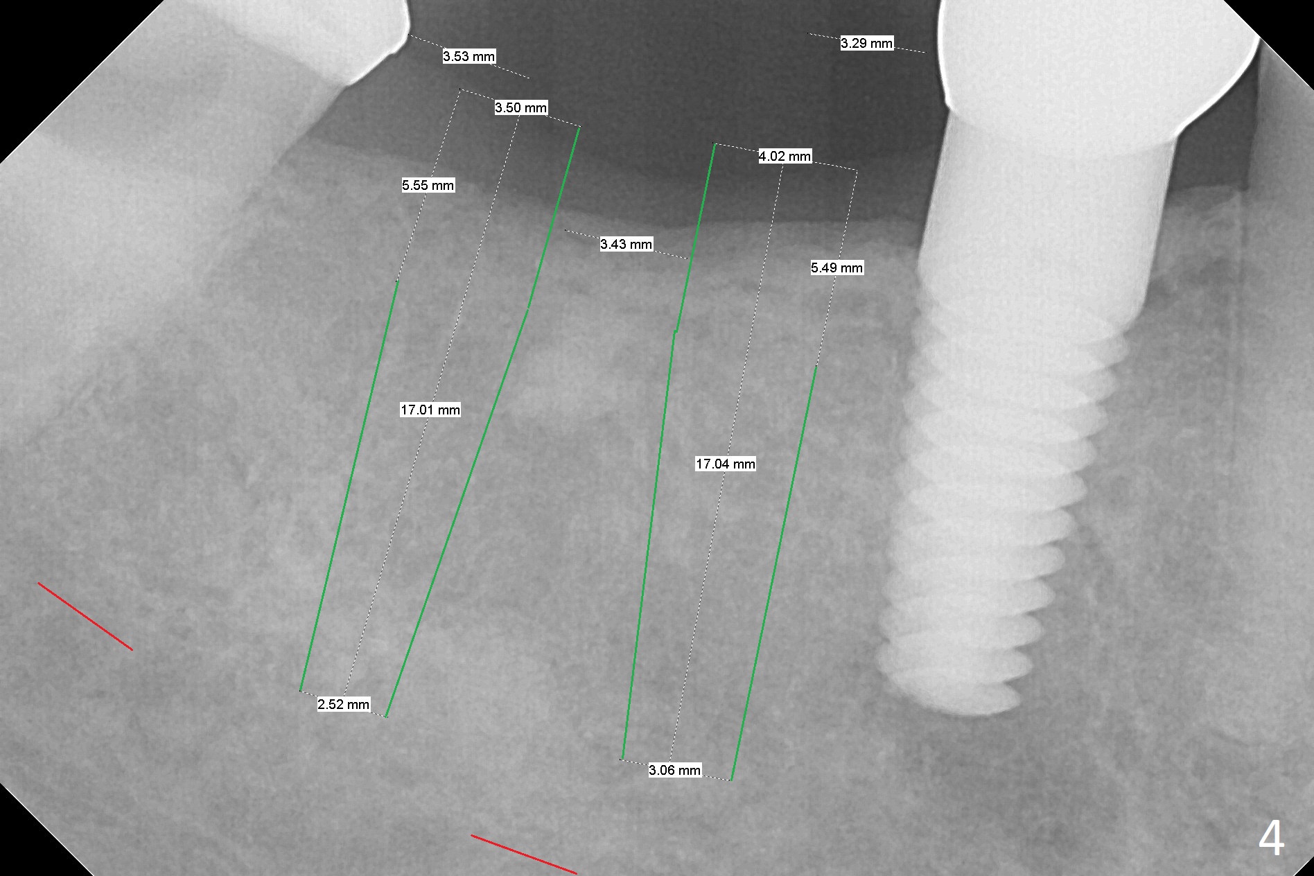 A 53-year-old woman will return to have implants at #30 and 31 with limited vertical space 4 years after # 29 implant placement (Fig.1). The buccolingual width is within normal limit (Fig.2). The 2nd difficulty is the narrow mesiodistal space (Fig.3), which will be handled with 2 1-piece implants (instead of 2-piece ones as shown in Fig.4, probably 3.5x17 mm (tissue-level) at #30 and 3x12(2) mm (bone level) at #31). With 1-piece implants, there is no issue of abutment loosening.