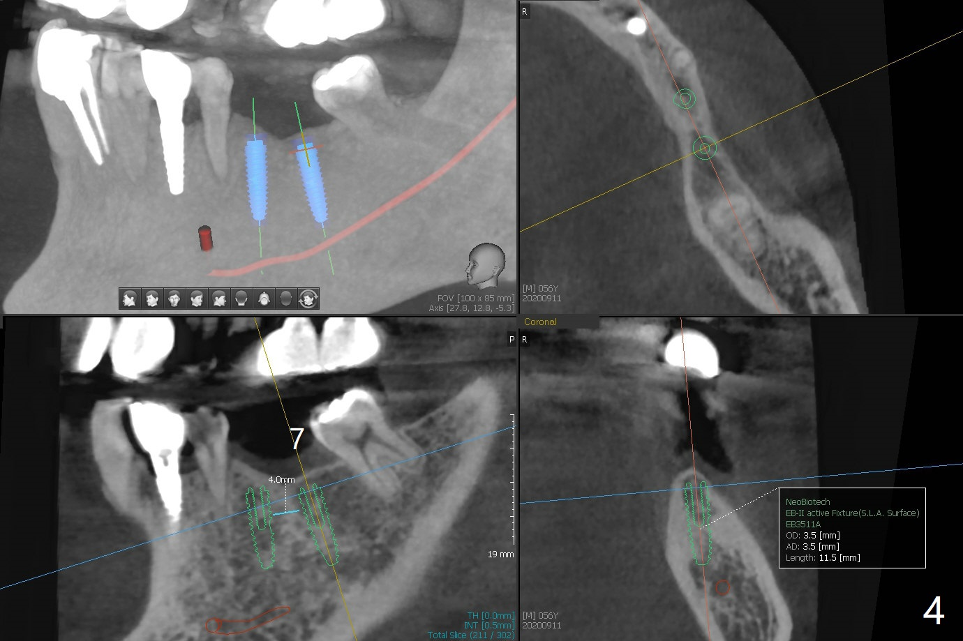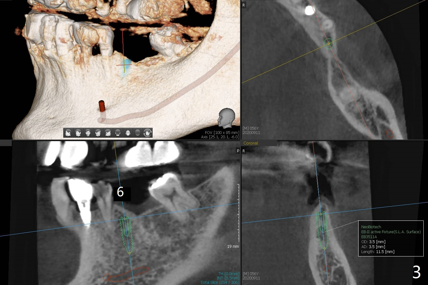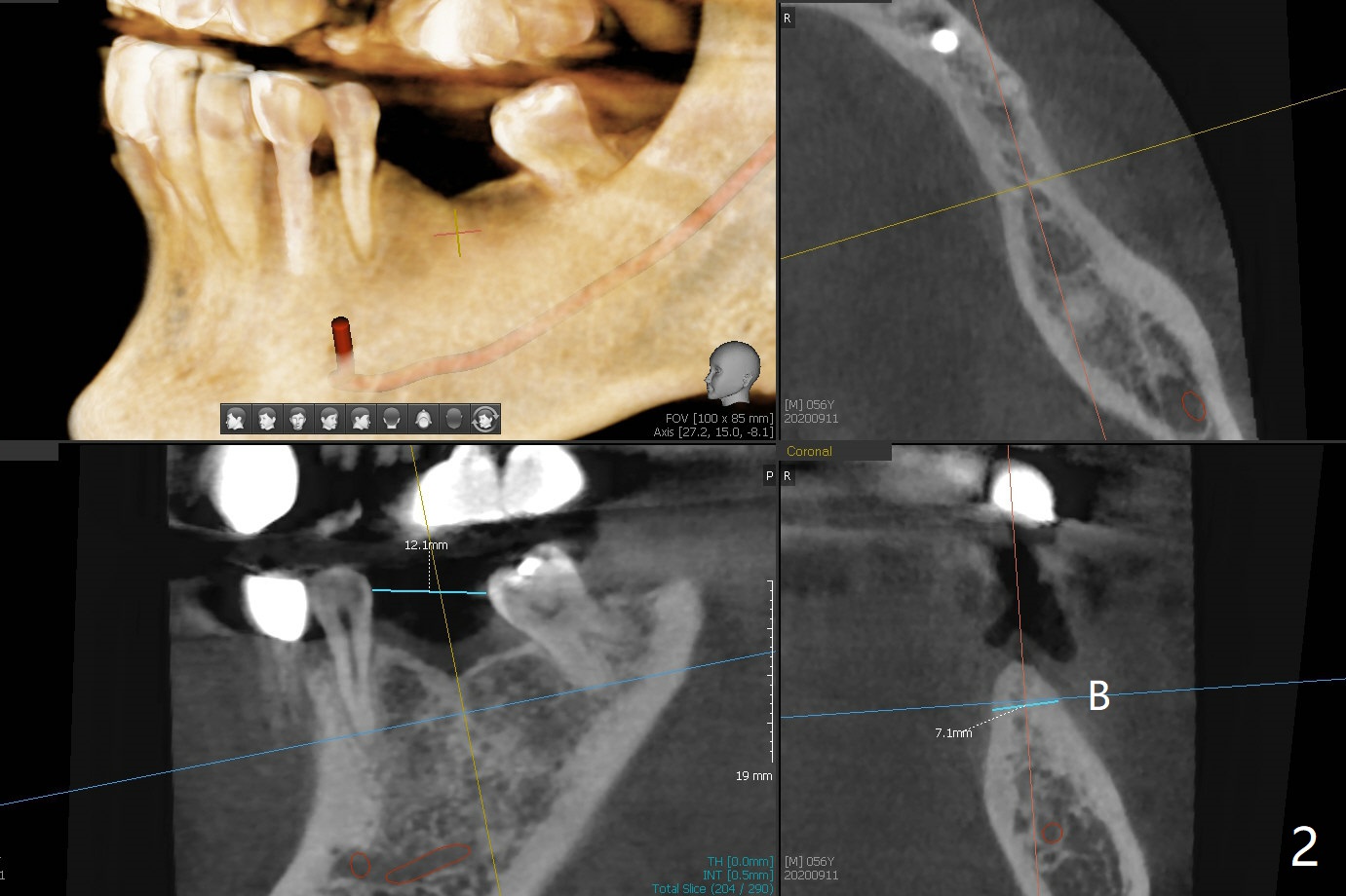56岁男,高血压,紧张怕痛,要求迅速手术,所以我们初步选择导航。由于他还能在右边咀嚼,先做左侧植牙。左侧好像缺失两个牙齿(图一),不过近远中间隙更象缺失一个牙齿(图二)。牙槽嵴狭窄,骨皮质厚,容易植骨吗?还是容易劈开?牙槽嵴狭窄(图三,四,六)似乎适合种植两个小植体(两个双尖牙)。如果只植入一个,牙槽骨高度差些,植体短(图五),仿佛做牙槽嵴劈开术比较好。