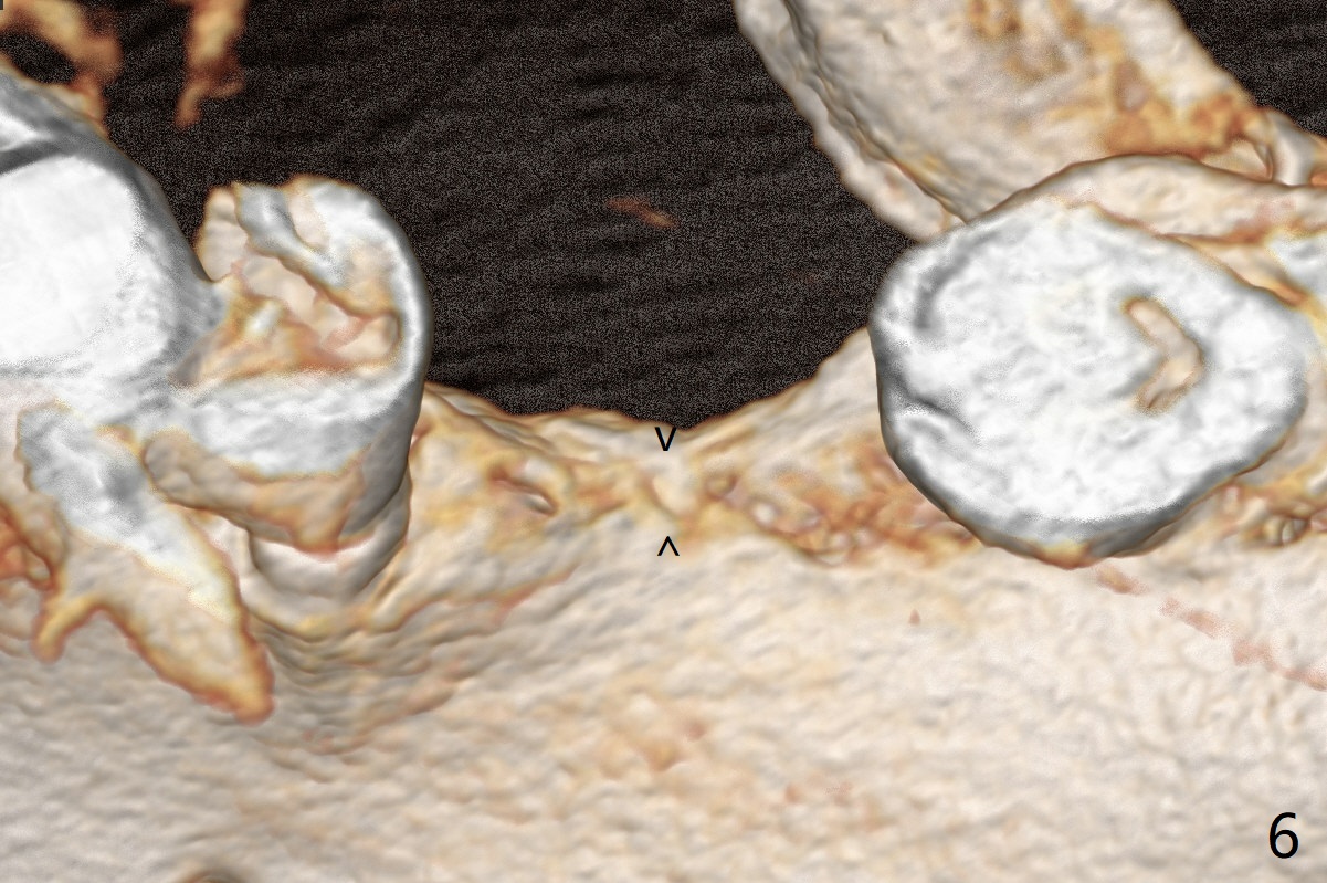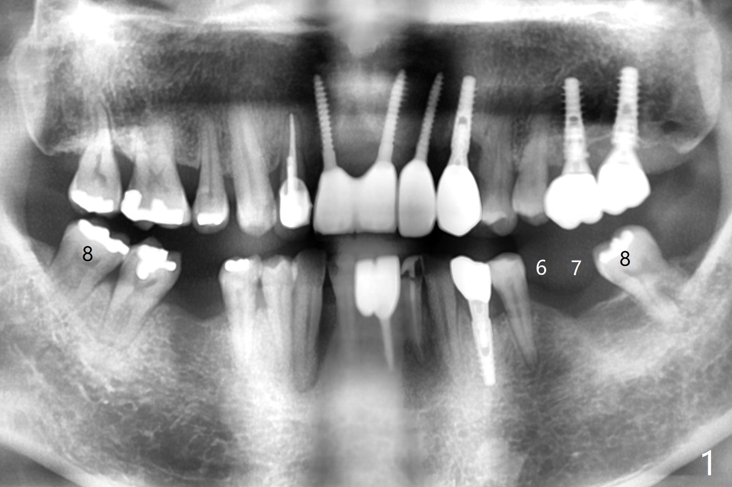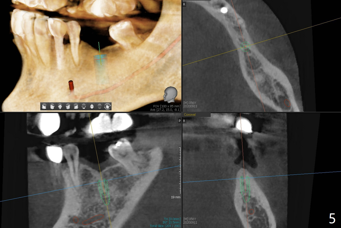 56岁男,高血压,紧张怕痛,要求迅速手术,所以我们初步选择导航。由于他还能在右边咀嚼,先做左侧植牙。左侧好像缺失两个牙齿(图一),不过近远中间隙更象缺失一个牙齿(图二)。牙槽嵴狭窄,骨皮质厚,容易植骨吗?还是容易劈开?牙槽嵴狭窄(图三,四,六)似乎适合种植两个小植体(两个双尖牙)。如果只植入一个,牙槽骨高度差些,植体短(图五),仿佛做牙槽嵴劈开术比较好。