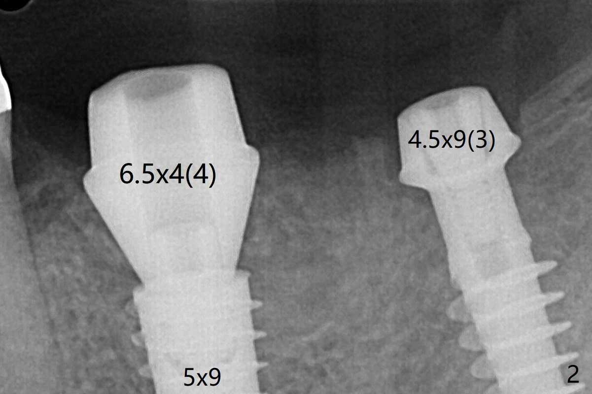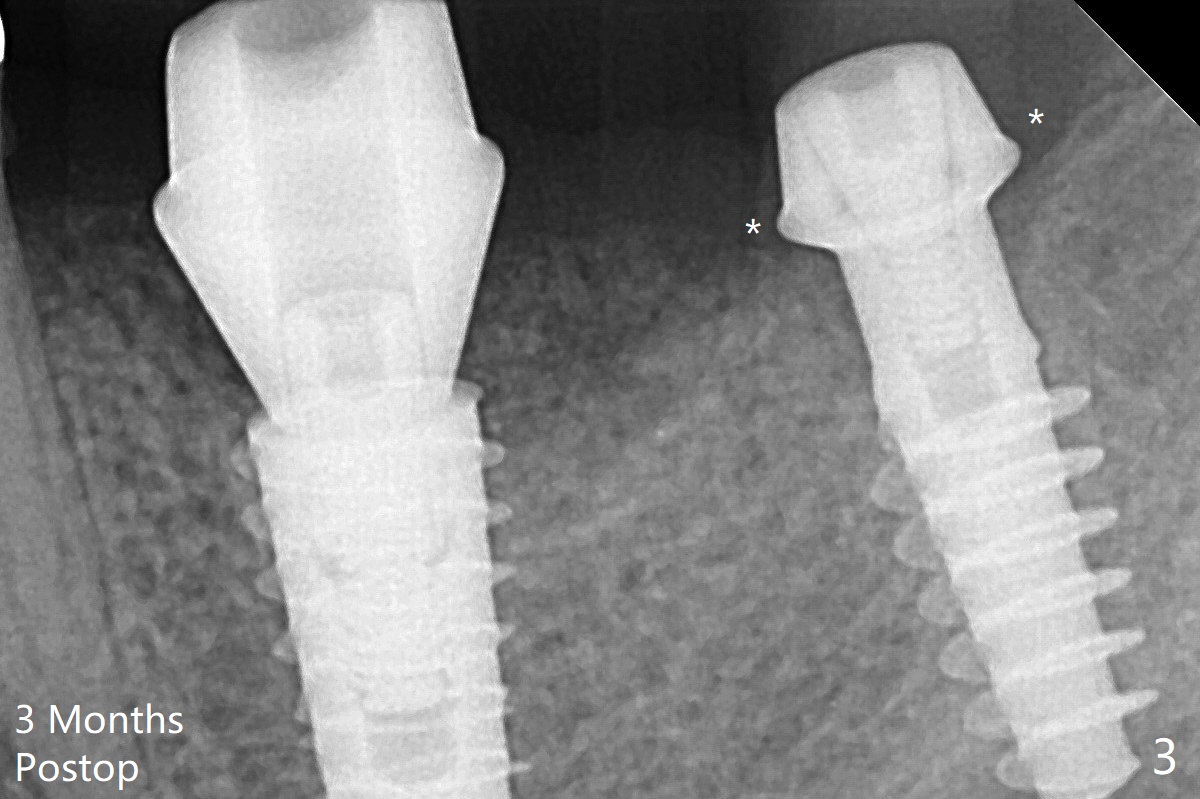 Because of supraeruption of the opposing teeth, the abutment at #19 is heavily reduced, whereas the Magicore is placed super low (Fig.2). The latter may be backed up or crown lengthening is necessary. In fact neither is necessary, since there is crestal bone loss at #18 nearly 3 months postop (Fig.3). There is no difficulty in placing 4.5 mm healing cuff.