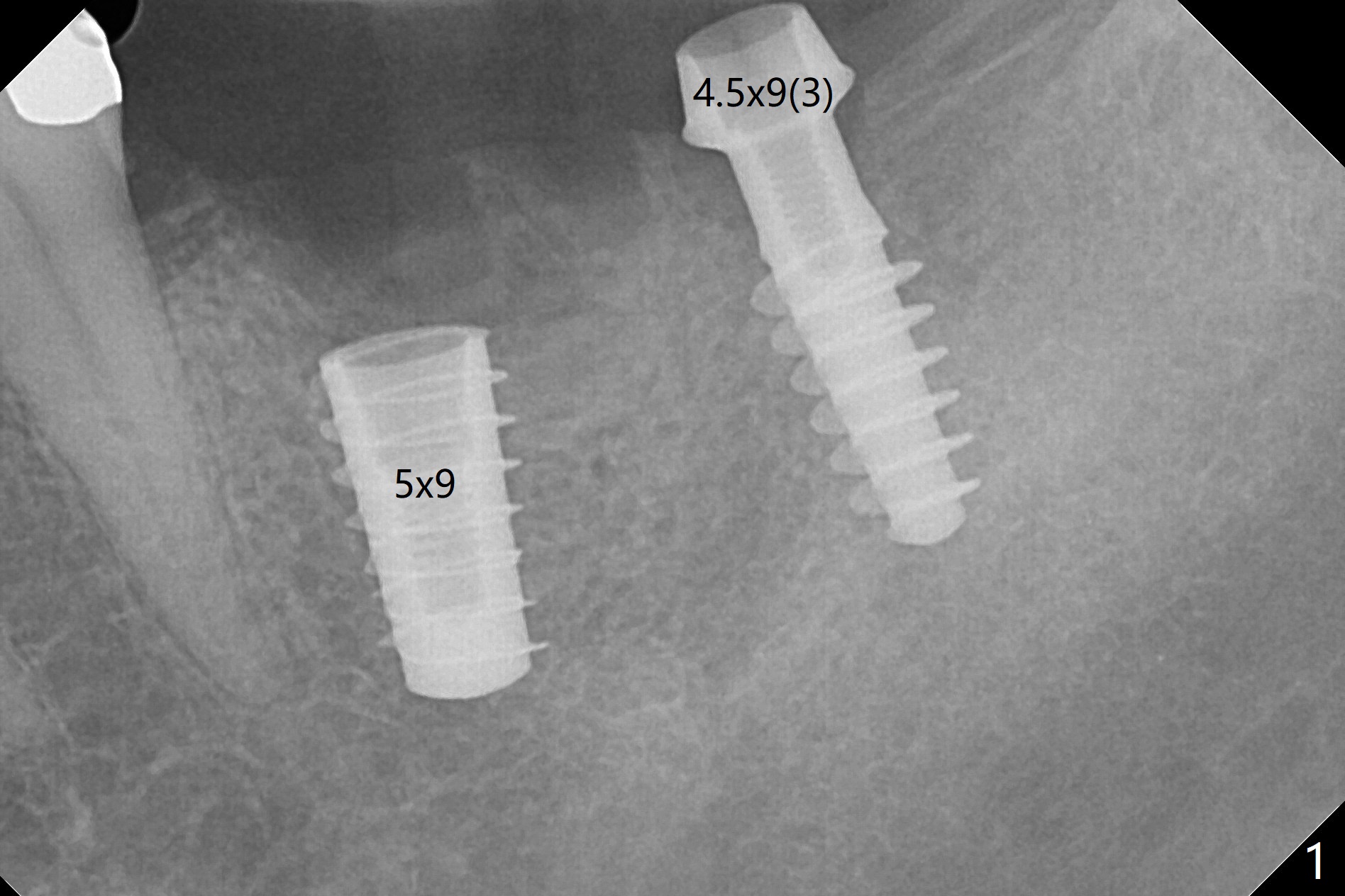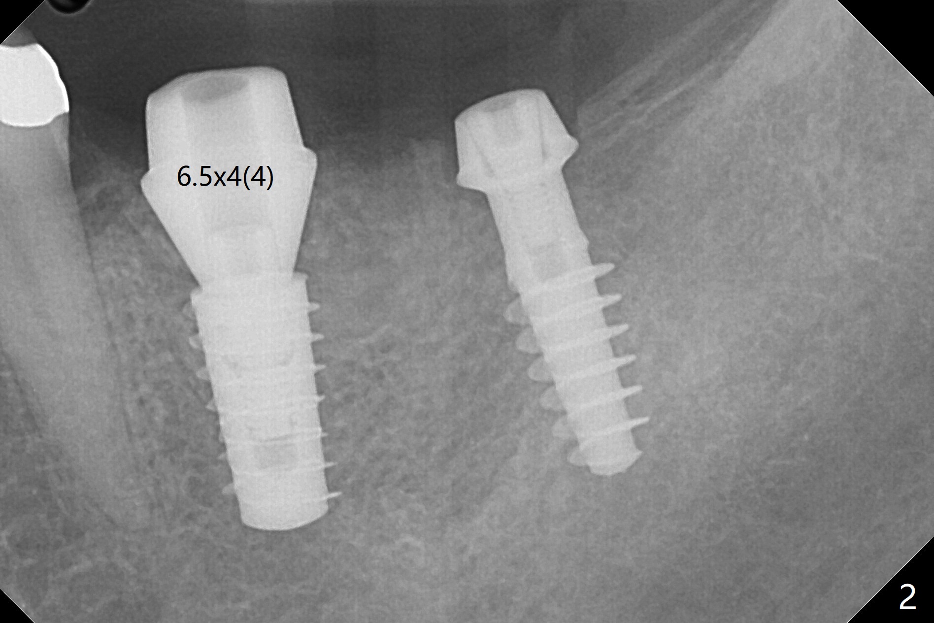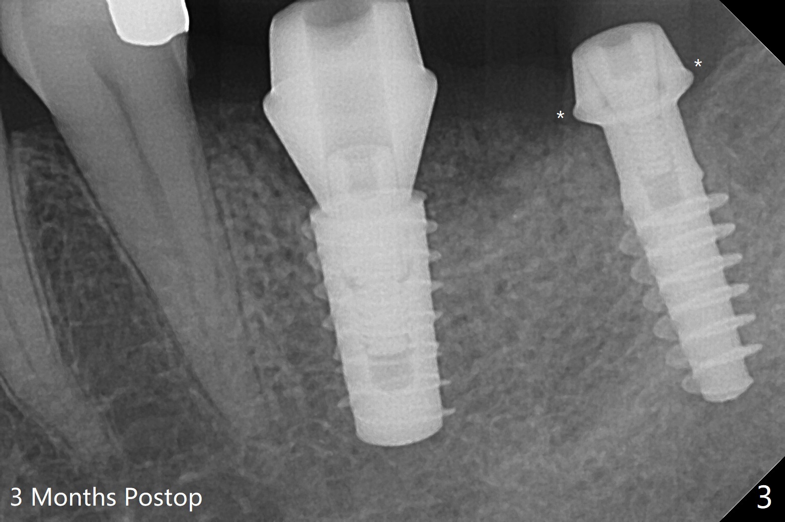 After osteotomy according to drill sequence except no tap at #18, a 5x9 mm FC at #19 achieves insertion torque at 20 Ncm, while a.4.5x9(3) mm Magicore <10 Ncm (Fig.1,2), probably due to the fact the core (middle portion) of Magicore is small, dictating underprep (in diameter) when the bone is not hard. In addition, IS implant driver cannot be engaged to Magicore so that the placement of the latter is free hand. Because of supraeruption of the opposing teeth, the abutment at #19 is heavily reduced, whereas the Magicore is placed super low (Fig.2). The latter may be backed up or crown lengthening is necessary. In fact neither is necessary, since there is crestal bone loss at #18 nearly 3 months postop (Fig.3 *). There is no difficulty in placing 4.5 mm healing cuff.