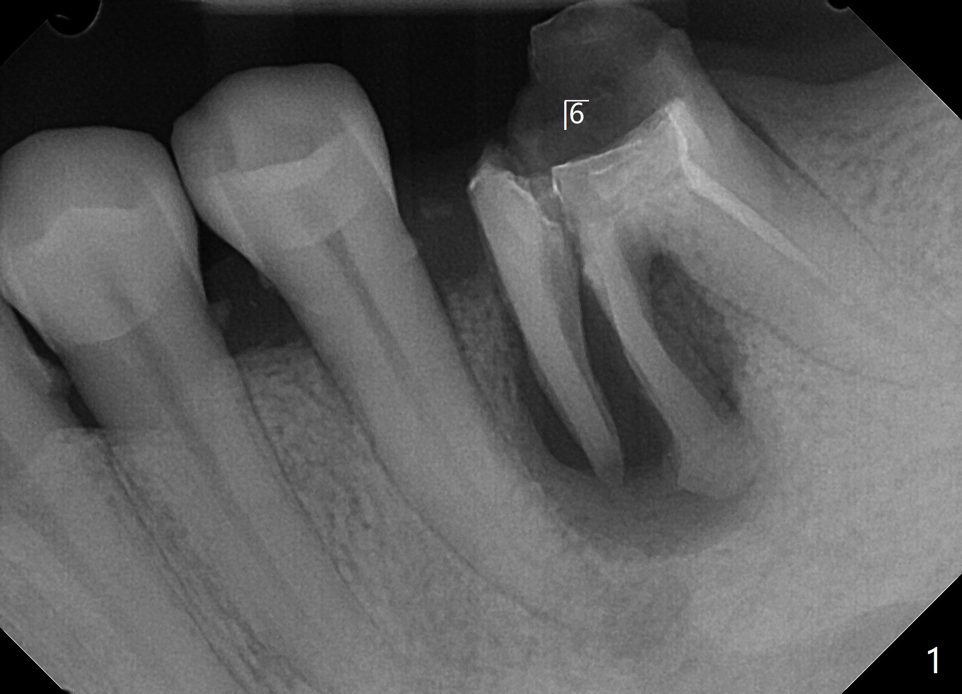 49岁男半年前要求粘固左下6牙冠,近中根纵裂,与7缺失有关,前磨牙牙根特别长,说明咬合力大,也是纵裂原因。