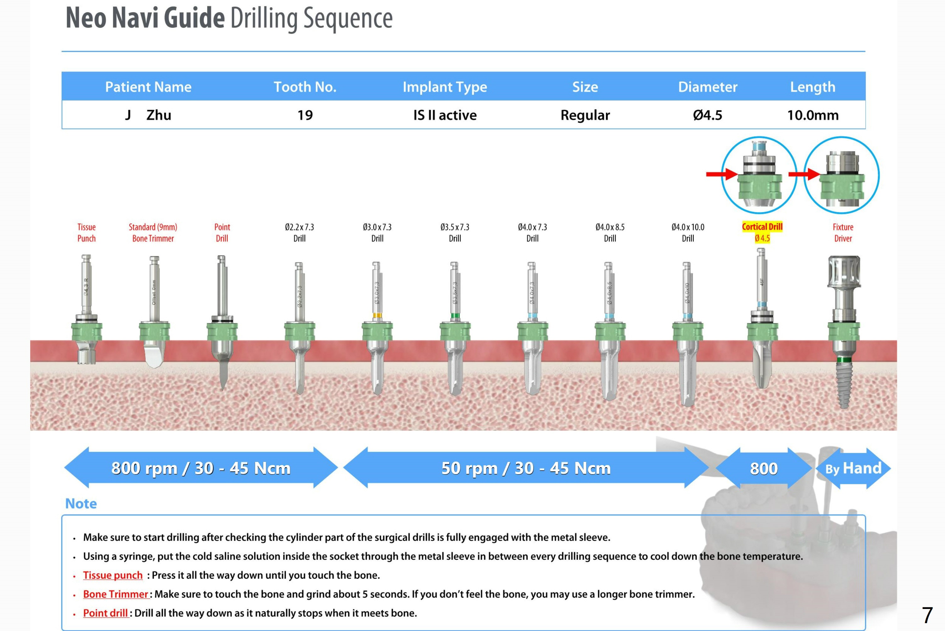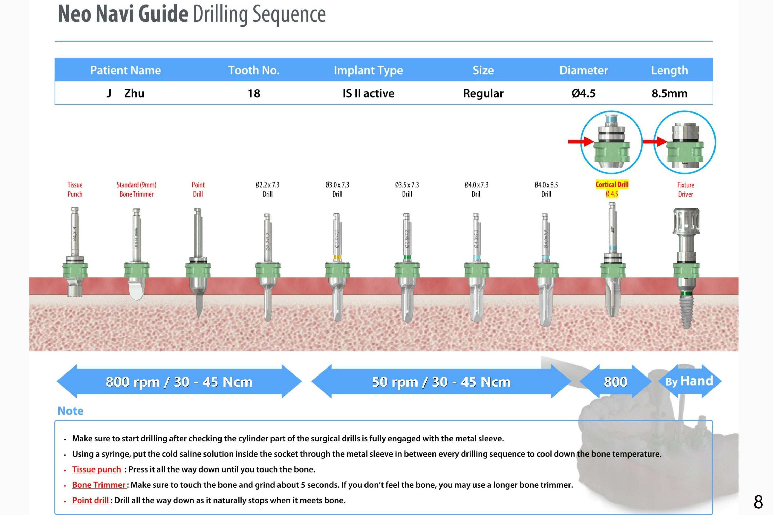 For the implants, I would recommend 800 rpm for all osteotomy drills with