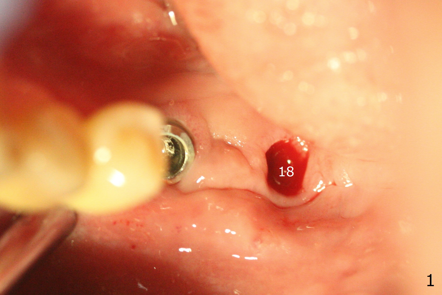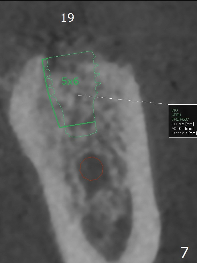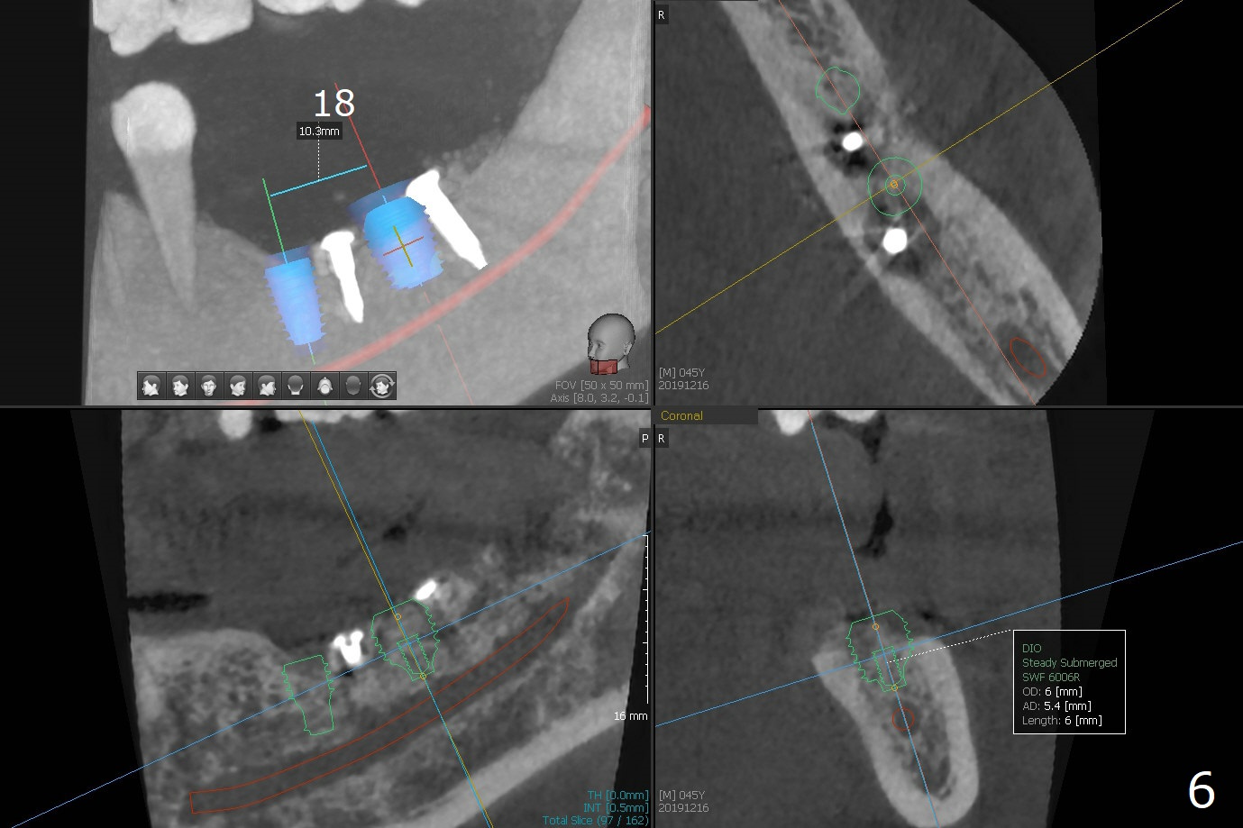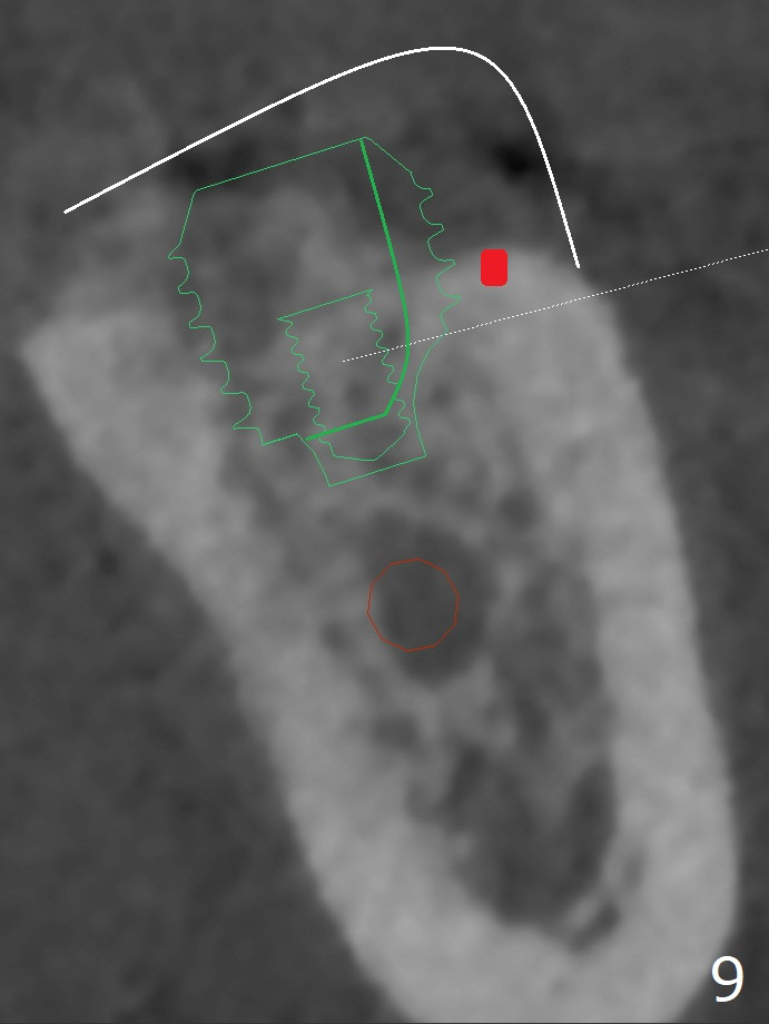 It appears that short implants could be placed mesial to the original sites (Fig.5,6), 5x6 and 5x5 mm at #19 and 18, respectively, with guide as lingual as possible. The exposed buccal threads will be covered by 3-D Bond (Fig.9 white line, post decortication (red)), collagen plug and PGA suture. Healing screws are most likely used, although healing abutments should be prepared if they help wound closure.