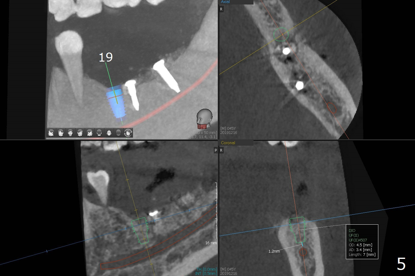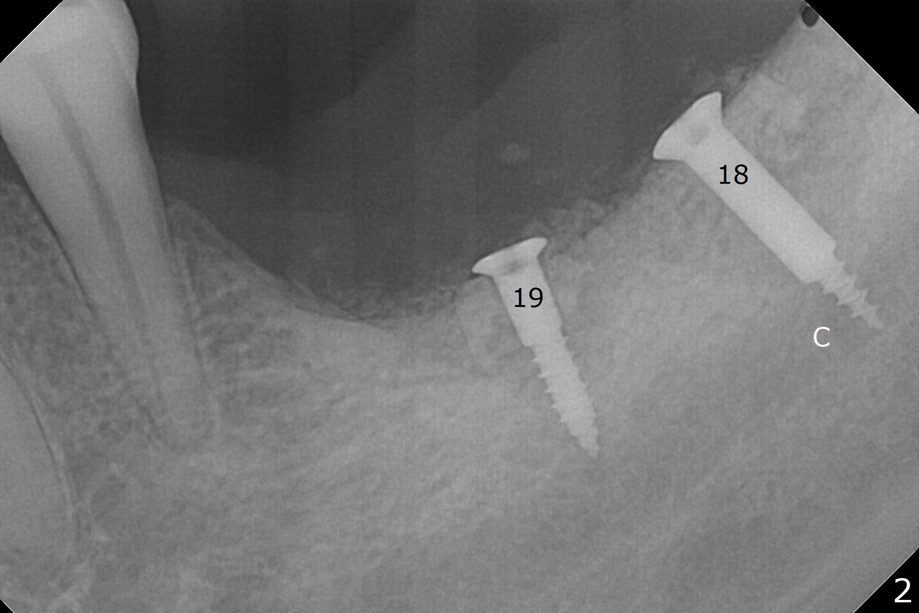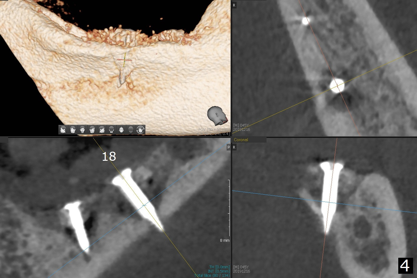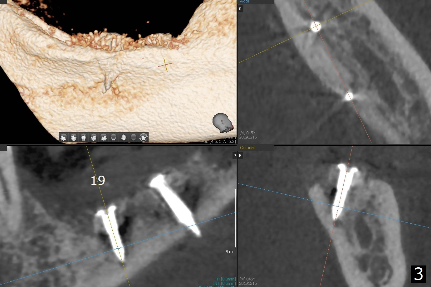 While the implant at #18 is easily removed, the one at #19 is superficial with buccal nonkeratinized gingiva (Fig.1). The latter is removed. Two small pieces of onlay graft is harvested from the left ramus and fixed in the defects with pins (Fig.2), surrounded by allograft with PRF. Since the pin at #18 looks violating the Inferior Alveolar Canal (Fig.2 C), CT is taken. In fact the pin perforates the lingual plate at #18 (Fig.4, as compared to Fig.3 (#19)). It leaves in place. Postop the wound dehisces with loss of allograft and exposure of the screws. The wound heals gradually mesiodistal with exposure of #18 screw 2.5 months postop. Follow up is disrupted by coronavirus pandemic.