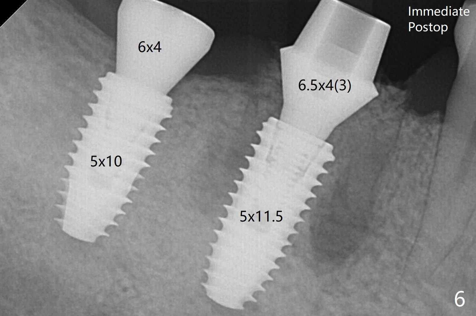 A healing abutment is placed at #31 because of supraeruption of the tooth #2 (Fig.4,5), while a cementation abutment is placed at #30 (incomplete seating) with autogenous bone (from drills) and allograft placed around it (*, Fig.6). However, the miniimplants dislodged. Due to coronavirus, the implants are restored with heavy abutment and opposing tooth trimming 1 year 9 months postop (Fig.16). Magicore should have been placed instead.
