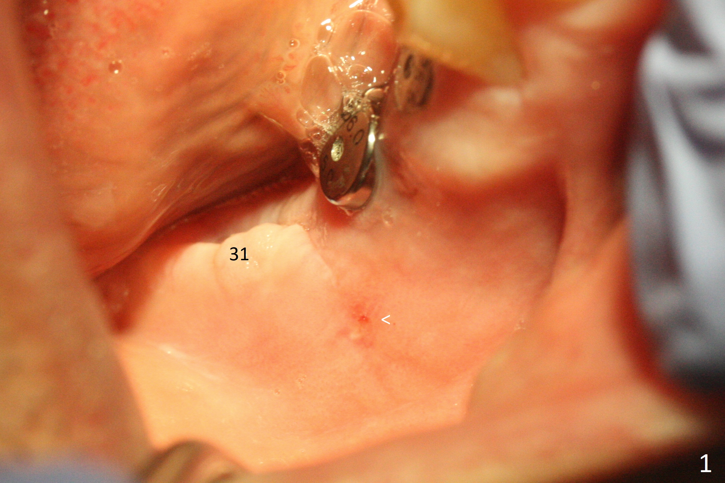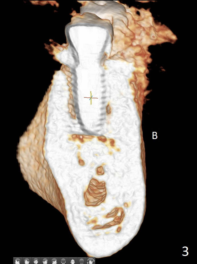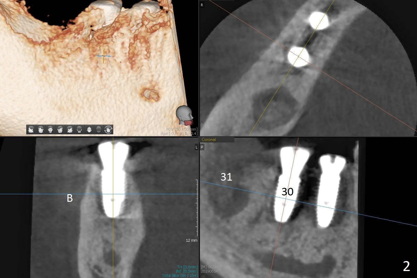 The 62-year-old man has had severe pain immediately post #30 and 31 implant placement for nearly 10 months. The implant at #31 was removed approximately a month earlier. The pain seems to transfer to the buccal of #30 (Fig.1). Bone loss persists around the implant at #30 (Fig.2,3 (3-D cross section, distal view)). To reduce postop pain, the implant will be removed flapless. Osteotomy site will be curetted thoroughly, especially mesially and treated with Metronidazole. Allograft will be mixed with PRF liquid, but do not form sticky one. The graft will be covered by 1 or 2 pieces of PRF membrane and possibly collagen plug. In fact the pain at #30 gradually reduces. Abutments are placed at #29 and 30 for splinted temporary crowns.