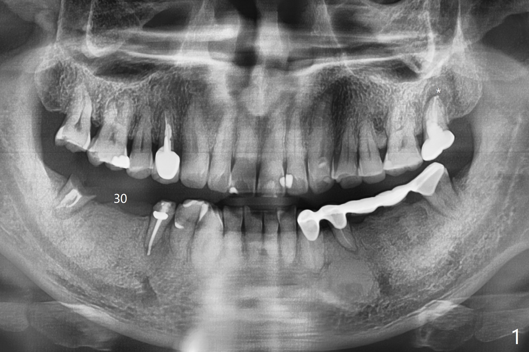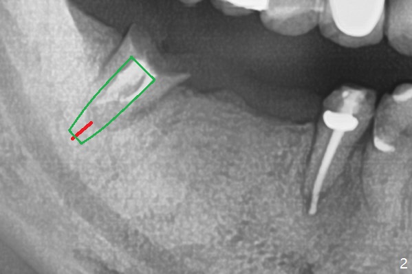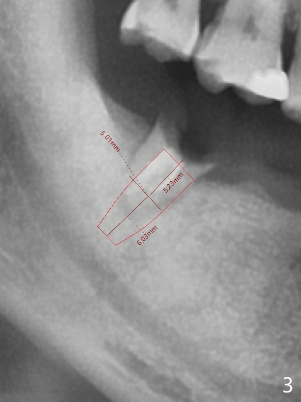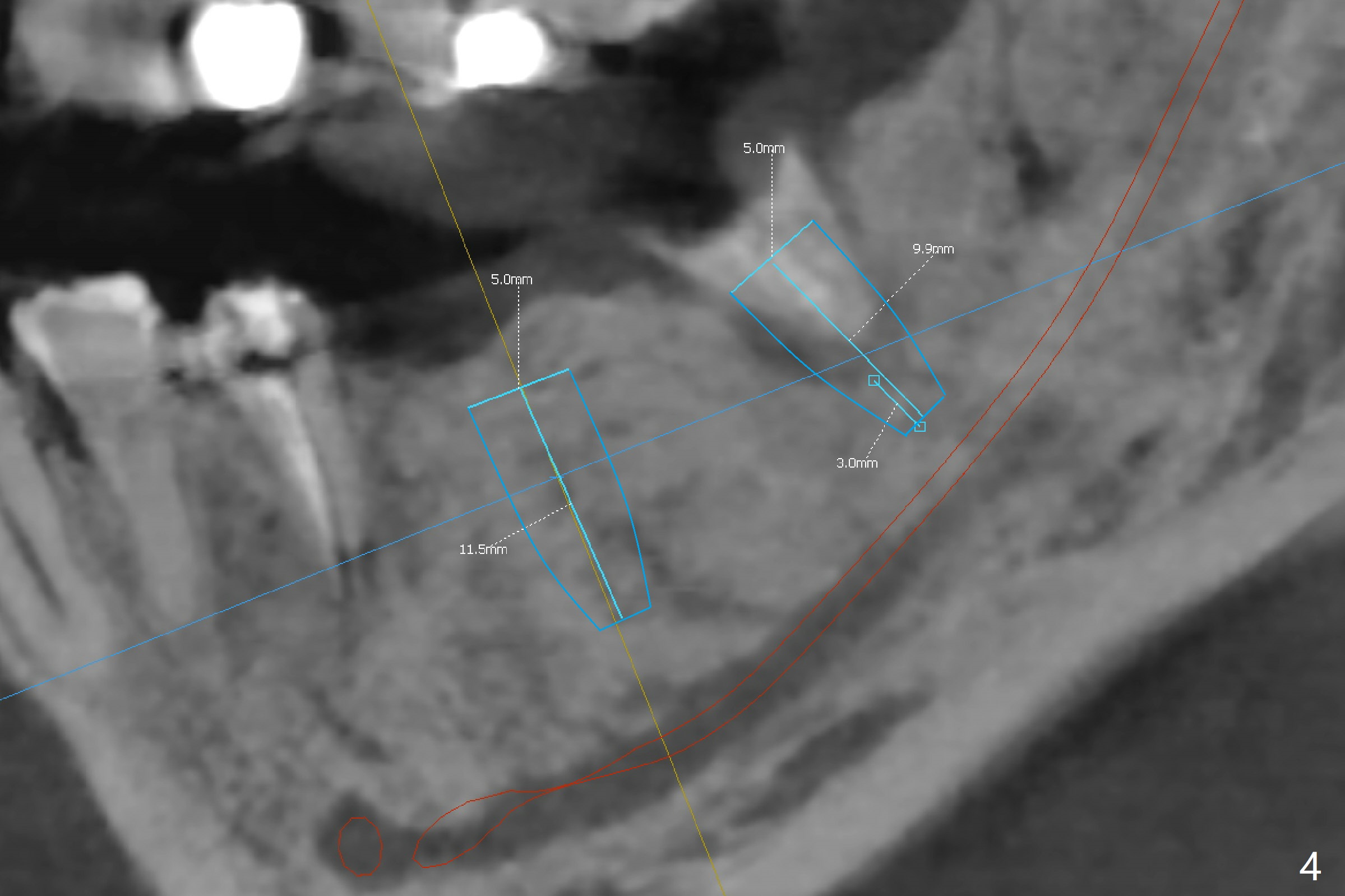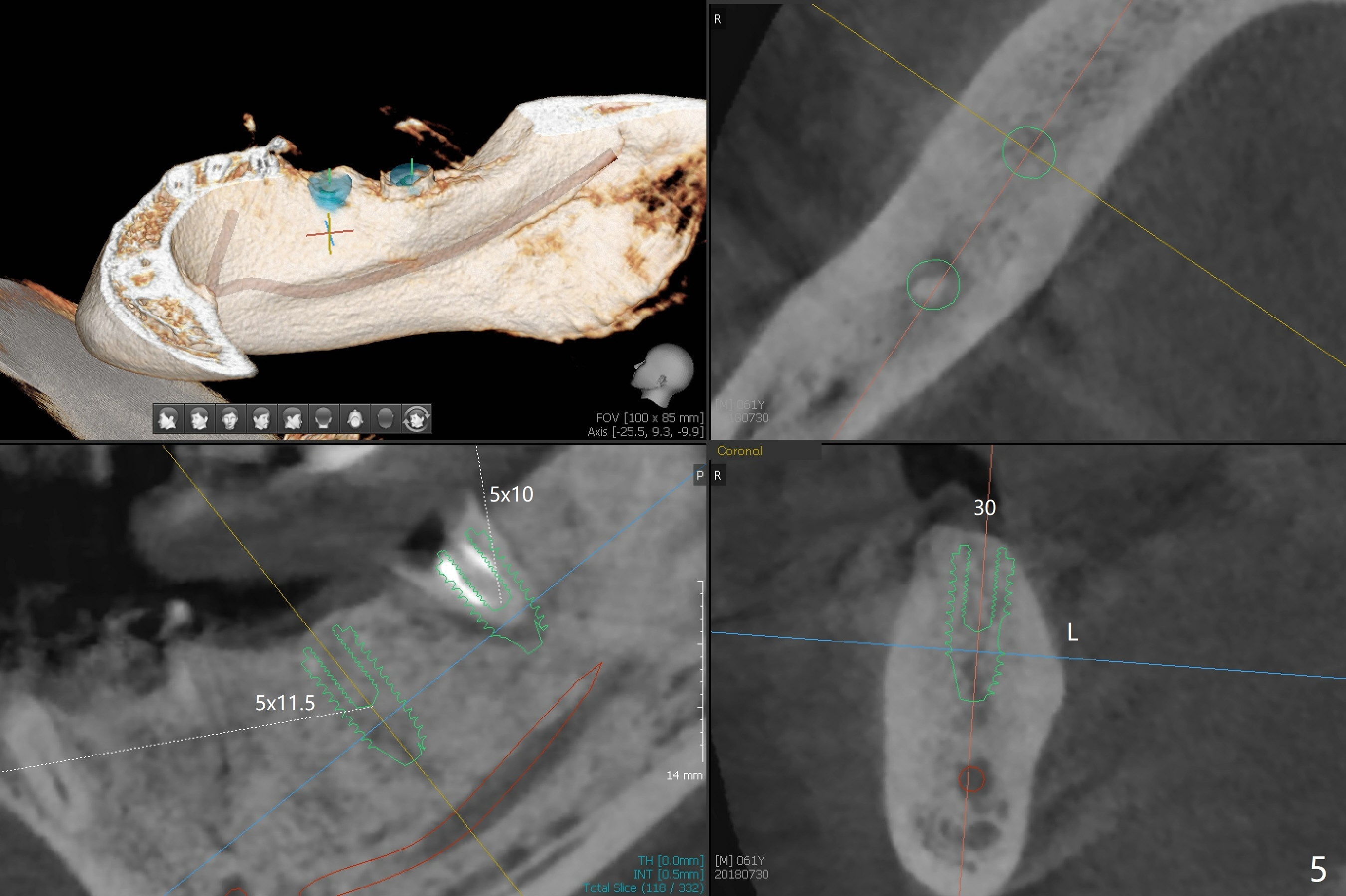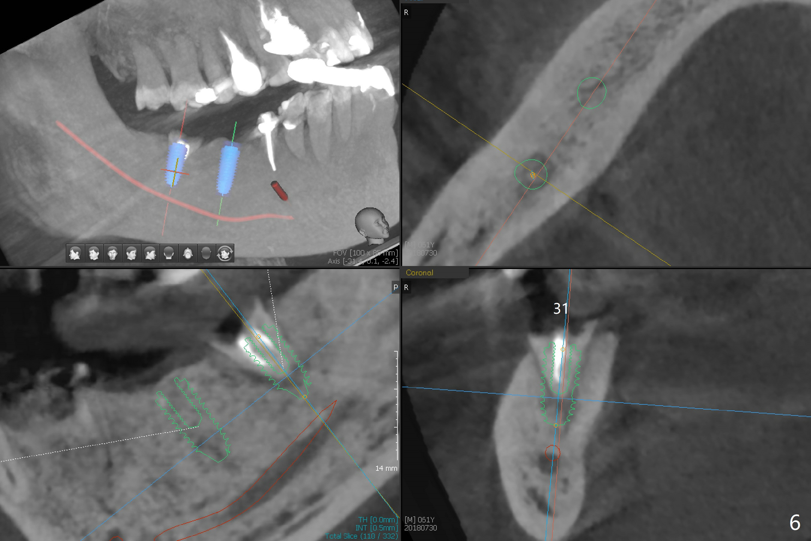 My question is have you measured the how much remaining bones are left at the extraction socket. How much bone depth is left after the root extraction? Do you think the implant could get enough fixation after the extraction? Jennifer It is a good question. As today's CT indicates (07/30/2018), there is ~ 3 mm bone for primary stability with ~ 1 mm clearance (Fig.3-6). Because of the tapered implant, ~5 mm of the implant will be able to contact the native bone if the implant is lingually placed (Fig.6). If you feel it too much a risk, still make a guide for #31 so that an anchor pin can be placed at #31 residual roots for fixation (a new idea?). Make sure that the distal portion of the guide contacts the #31 residual root stump for stability, which is superior to a guide resting on the soft tissue. I have had experience placing implants free hand in this situation. The guide will be great help. I will use judgment in surgery. The worst scenario is socket preservation. Thanks for consideration and design.