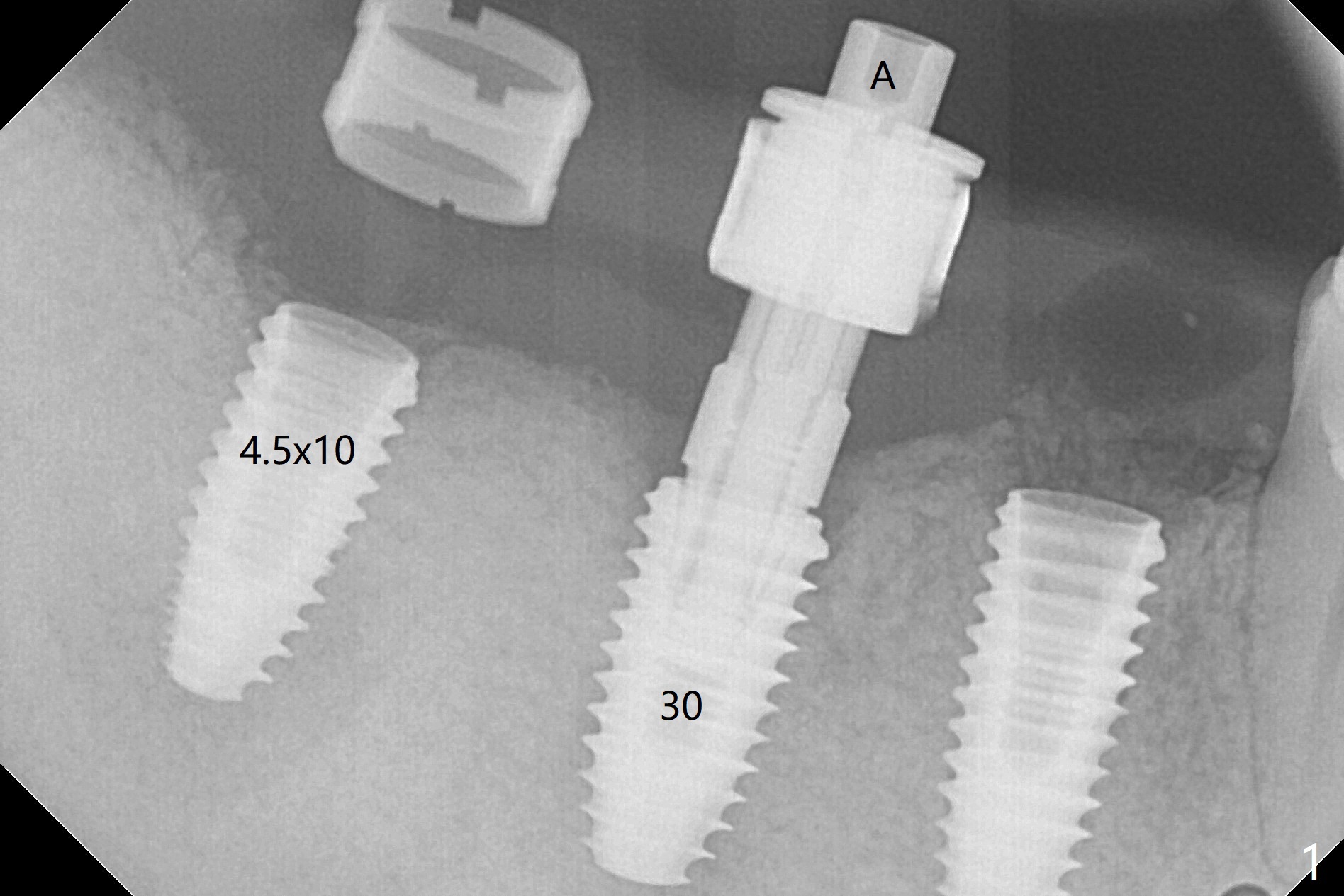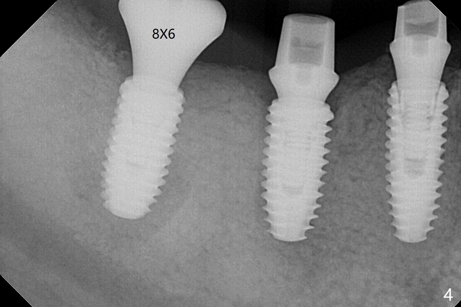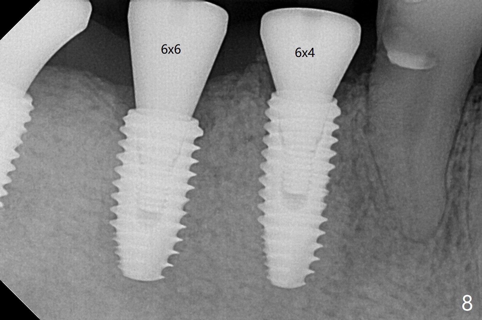 Five months post #31 implant removal with bone graft, osteotomy is initiated for a 5x10 mm implant using an existing guide. A question arises suddenly whether the bone height is reduced. Therefore a 4.5x10 mm dummy implant is placed with a fixture anchor placed at #30 (Fig.1 A). After using 4.5x8.5 mm drill with regular offset, a 5x10 mm definitive implant is placed with ~ 35 Ncm (Fig.2,3). After placement of the implant .5 mm deeper, a 8x6 mm healing abutment is placed, while the abutments return to #29 and 30 for splinted provisional (Fig.4). Two months later, the cemented abutment at #29 is loose (Fig.5) and retightened, but it remains incompletely seated for another 3 months (Fig.6). So is the one at #31 (Fig.6). After use of 4.6 and 5.6 mm bone profile drills, healing abutments are placed with apparently complete seating (Fig.7,8).