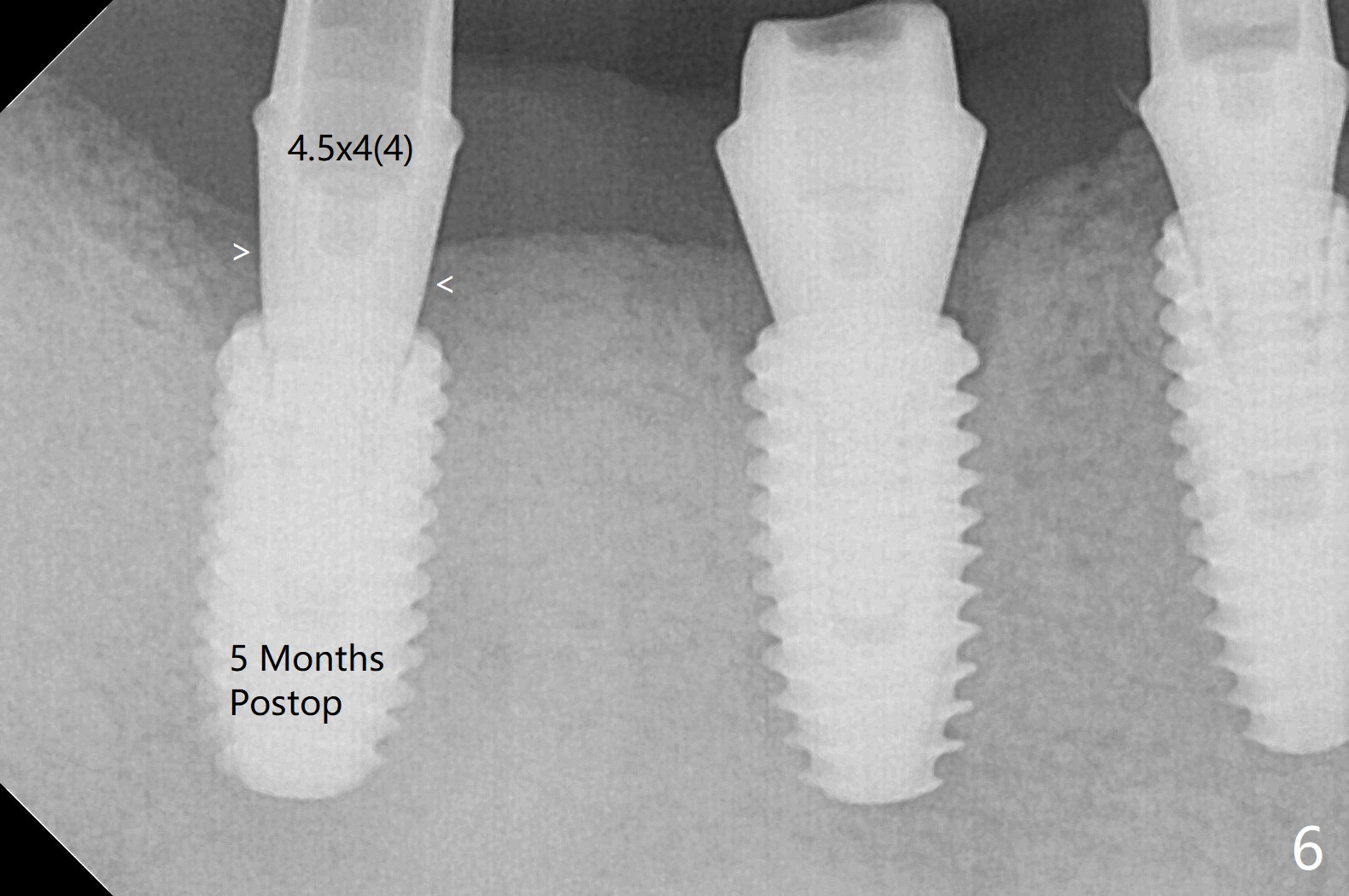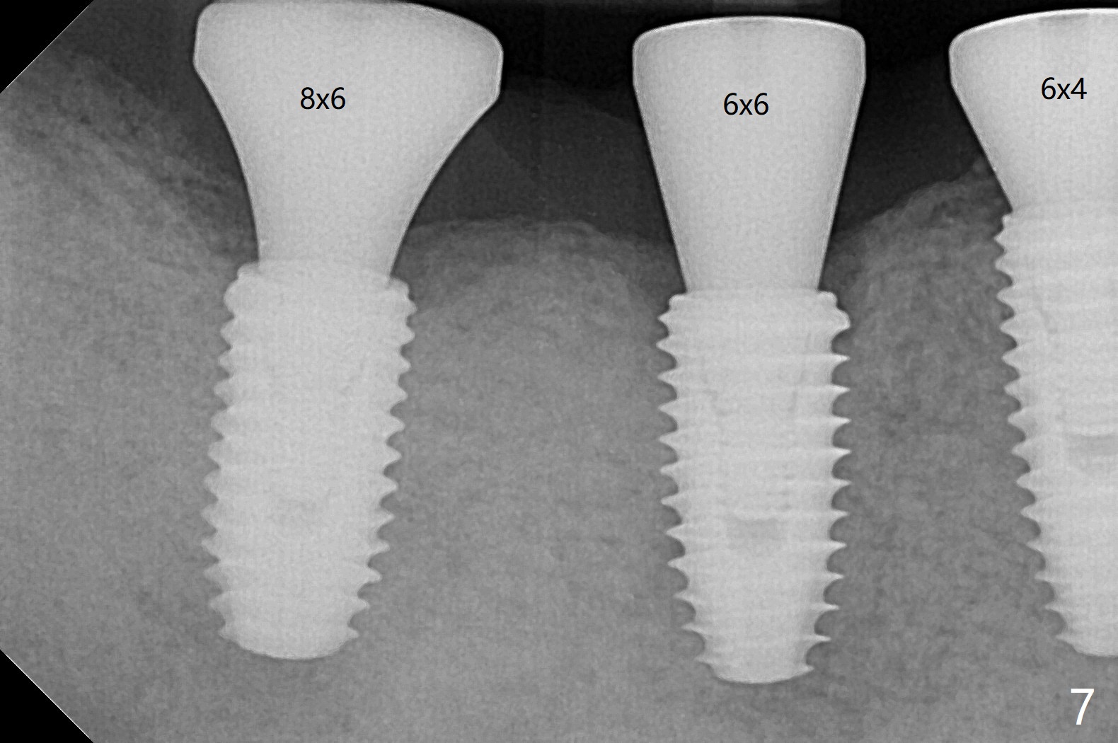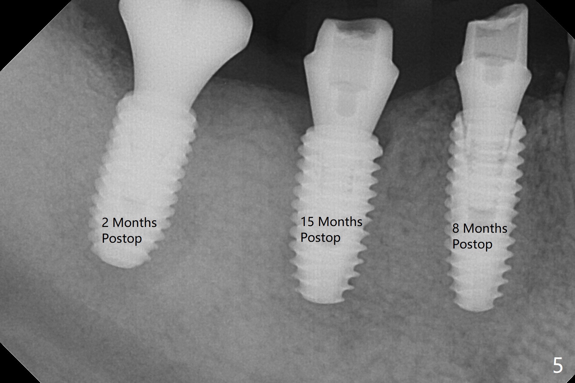 Five months post #31 implant removal with bone graft, osteotomy is initiated for a 5x10 mm implant using an existing guide. A question arises suddenly whether the bone height is reduced. Therefore a 4.5x10 mm dummy implant is placed with a fixture anchor placed at #30 (Fig.1 A). After using 4.5x8.5 mm drill with regular offset, a 5x10 mm definitive implant is placed with ~ 35 Ncm (Fig.2,3). After placement of the implant .5 mm deeper, a 8x6 mm healing abutment is placed, while the abutments return to #29 and 30 for splinted provisional (Fig.4). Two months later, the cemented abutment at #29 is loose (Fig.5) and retightened, but it remains incompletely seated for another 3 months (Fig.6). So is the one at #31 (Fig.6). After use of 4.6 and 5.6 mm bone profile drills, healing abutments are placed with apparently complete seating (Fig.7,8).