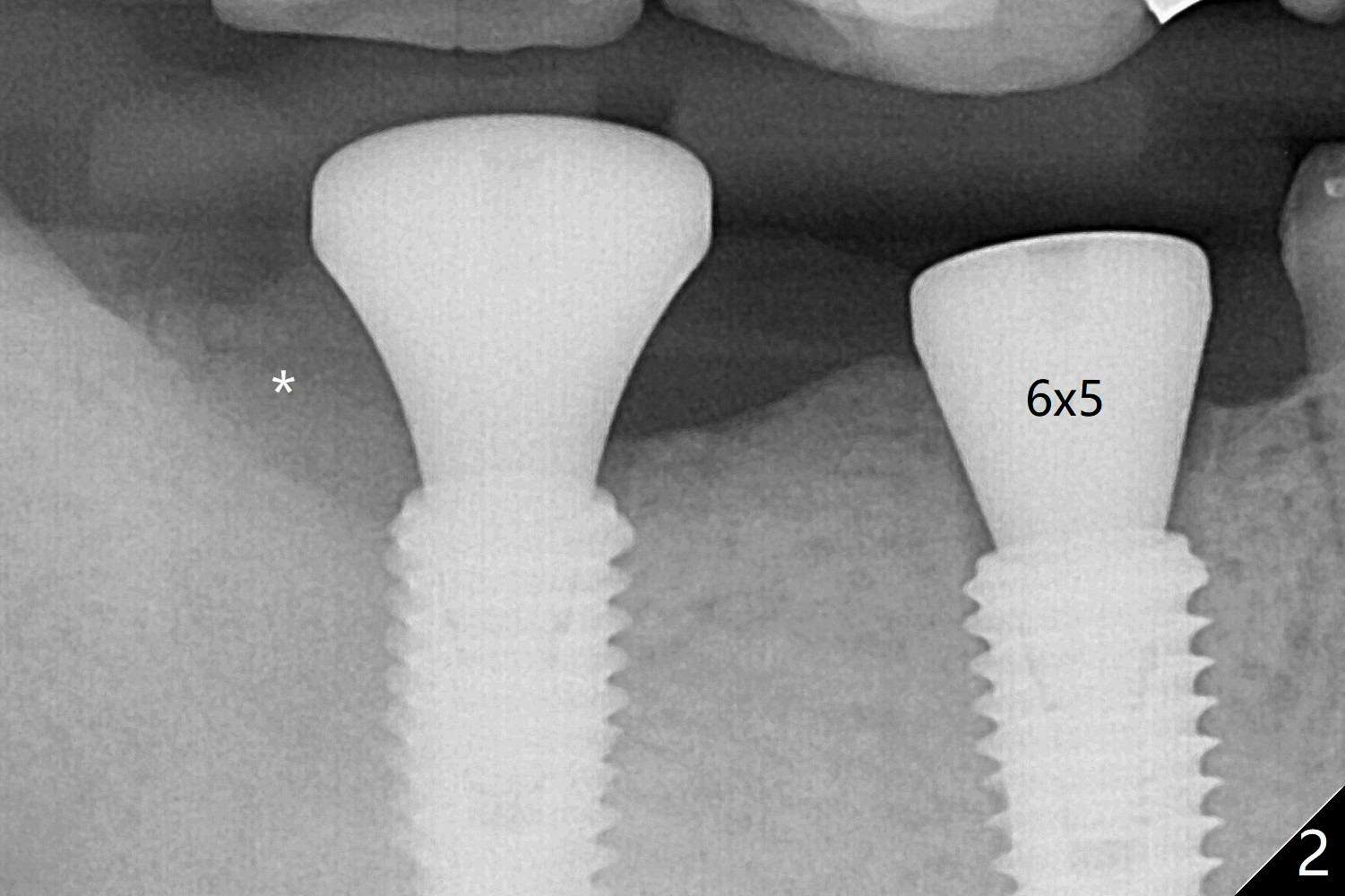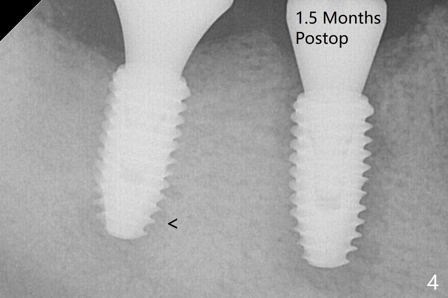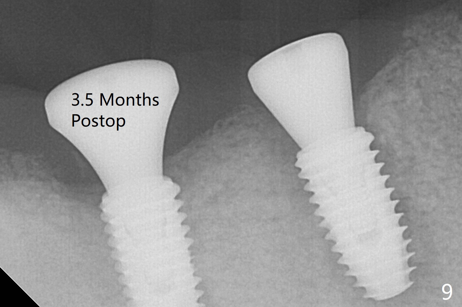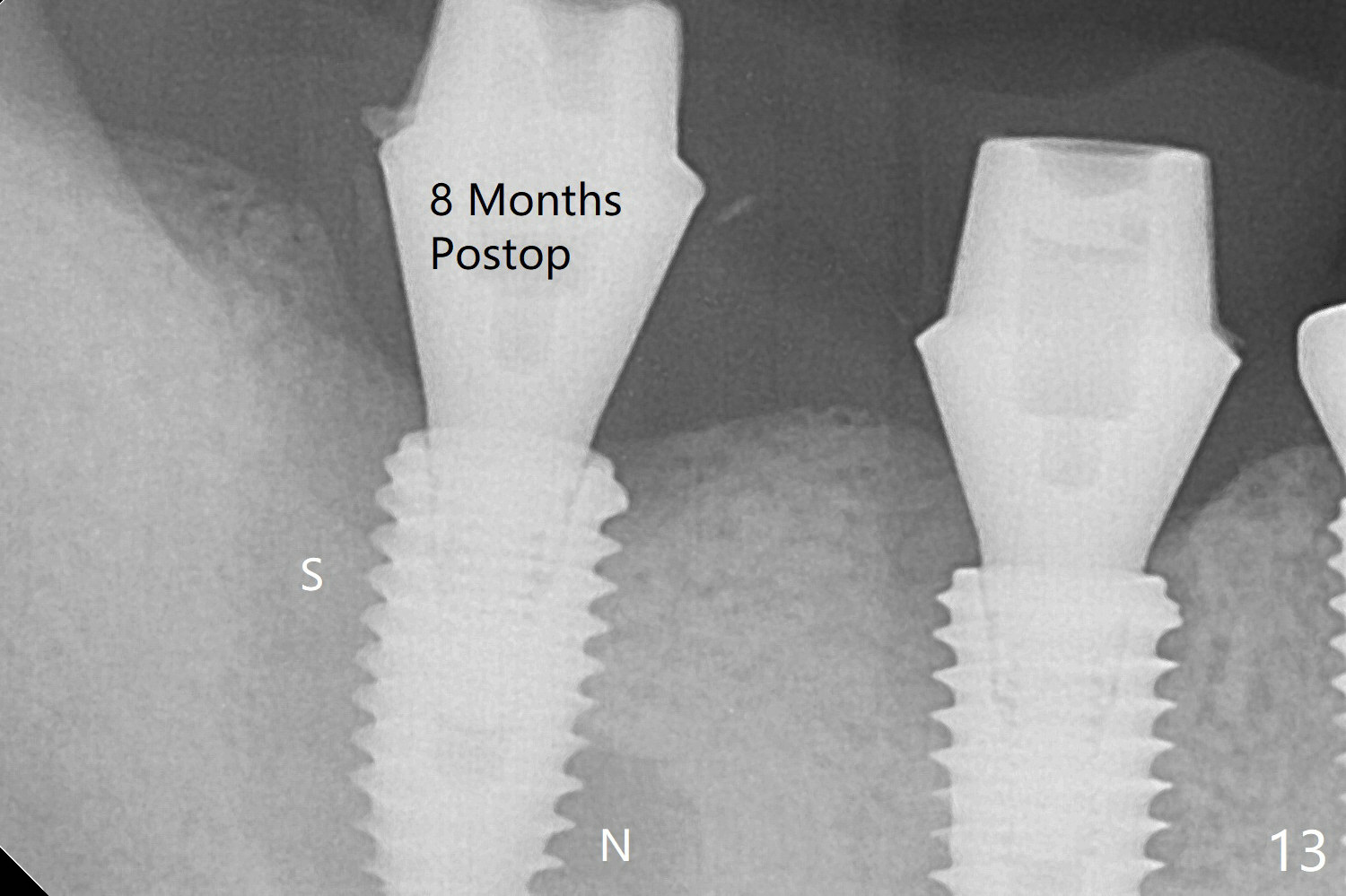 The bone at #30 and 31 is so hard that plenty of bone shaving is saved as bone graft to be placed in the socket of #31 (Fig.2 *). More graft is placed after placement of a healing abutment. No provisional is fabricated because of limited vertical space. The patient is hesitant about apicoectomy. After discussion of advantages and disadvantages of the latter vs. extraction and implant, the patient chooses the extraction. The latter turns out to be smooth with socket preservation (Fig.5, 6 *). Immediately postop PA shows bone loss at #30 and minor degree around the apex of #31 implant (Fig.4 <), which is related with hard bone and bone necrosis due to heat. The bone loss around the implants at #30 and 31 persists 3.5 month postop, while the socket heals at #29 two months post socket preservation (Fig.9). When the healing abutments with heavy plaque (similar to that in Fig.7) are removed, there is granulation tissue around the gingival cuffs with tenderness. The abutments are reloaded after cleaning with OHI. Gingiva becomes inflamed at #31 when a splinted provisional is being worn to intrude the opposing supraerupted teeth; bone resorption remains severe in the previous distal socket and the mesial necrotic area (Fig.13 S, N). Oral hygiene is bad.