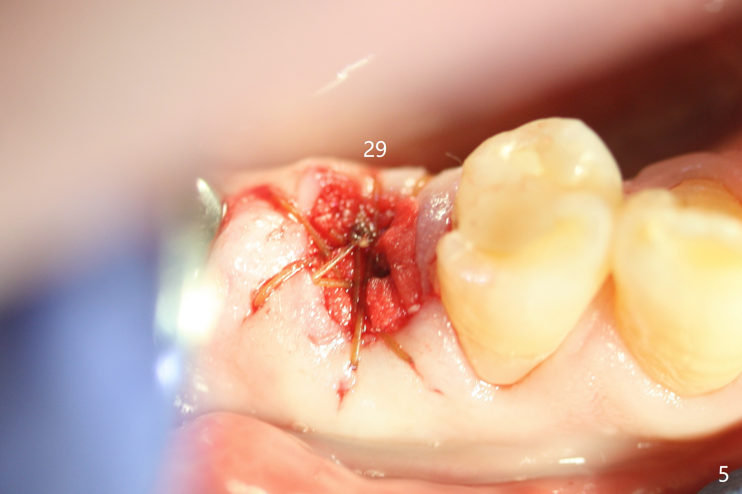 The patient is hesitant about apicoectomy. After discussion of advantages and disadvantages of the latter vs. extraction and implant, the patient chooses the extraction. The latter turns out to be smooth with socket preservation (Fig.4, 5 *). Immediately postop PA shows bone loss at #30 and minor degree around the apex of #31 implant (Fig.4 <), which is probably related with hard bone and bone necrosis due to heat.