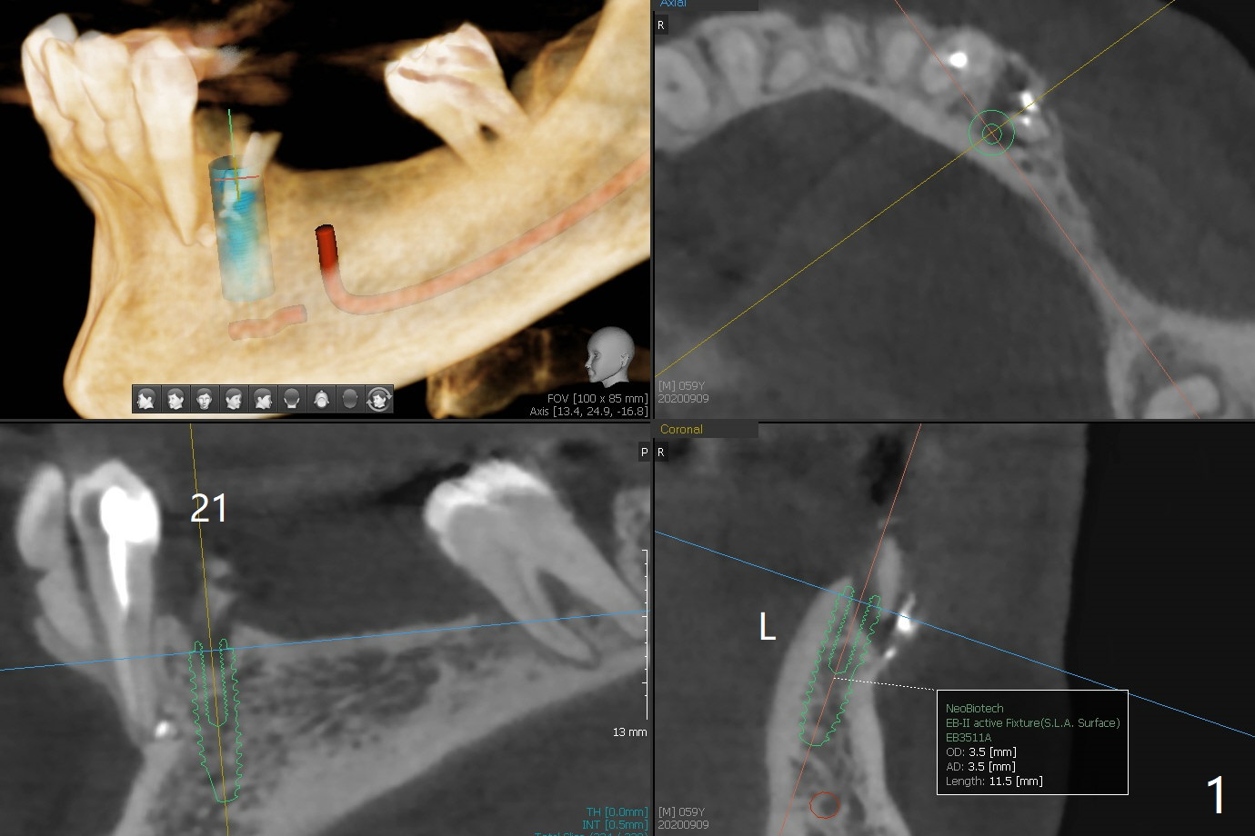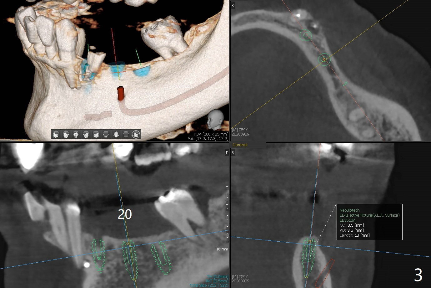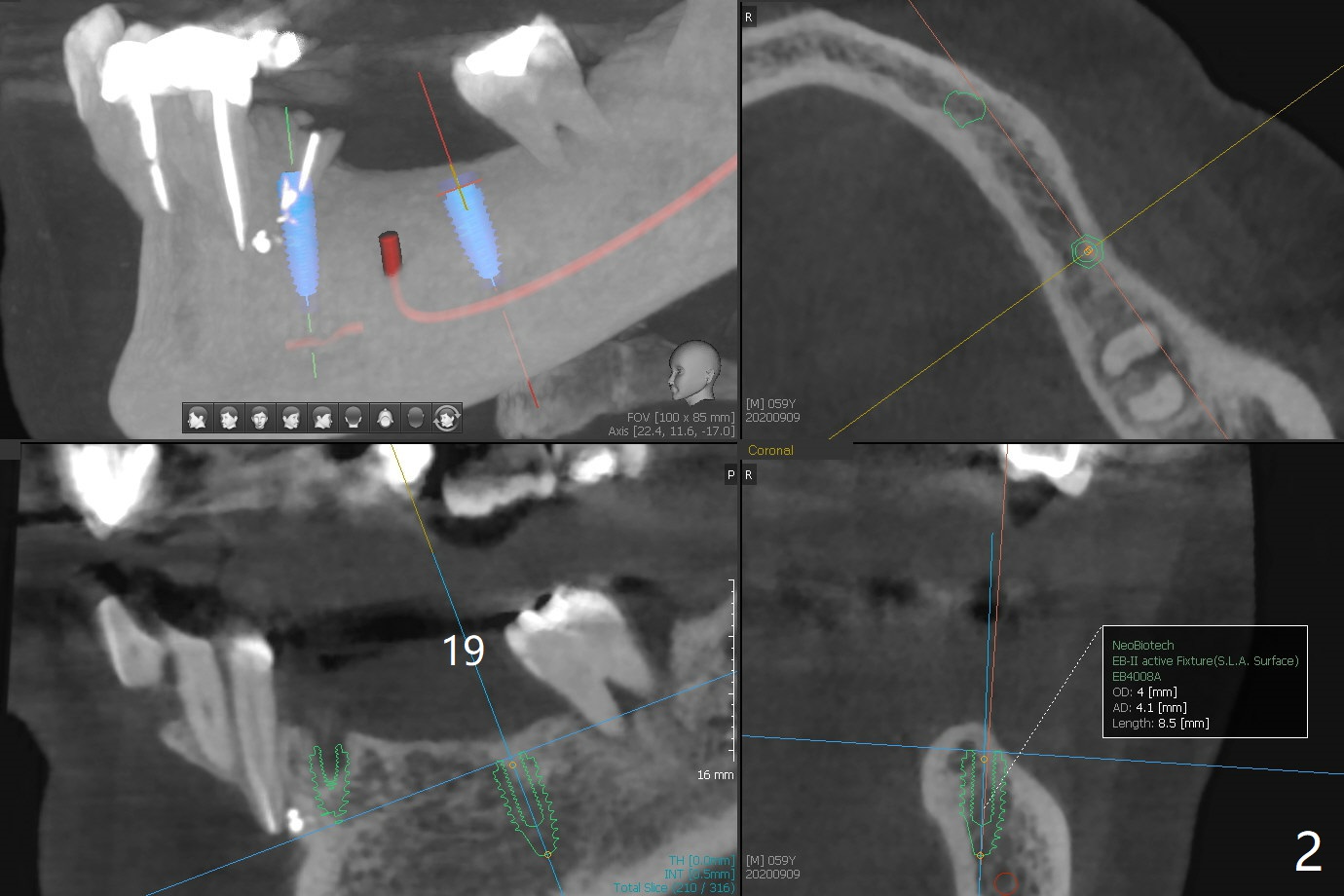 A 59-year-old woman has an abscess buccal to #21 (residual root), immediate placement being imminent, while the teeth #19 and 20 have been missing for a while. Since the ridge is narrow even at #21, three narrow implants will be placed at these sites (Fig.1-3). Please place an implant as close to the lingual (L) plate (but not to touch it to avoid deviation during placement) at #21 (Fig.1).