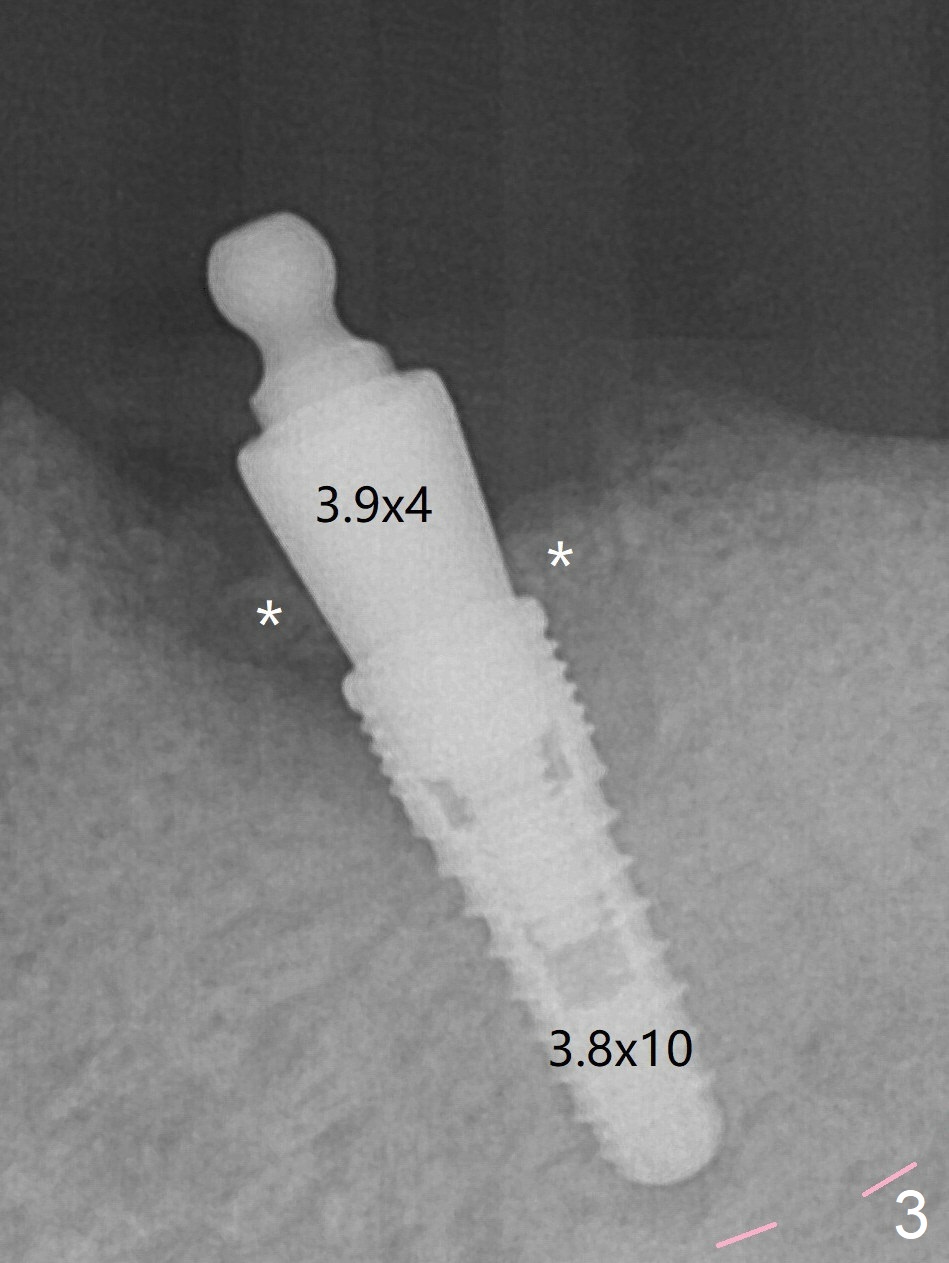 Therefore the trajectory of the implant is tightly controlled (Fig.3-5). After placement of a ball abutment (3.9x4 mm), Vera graft is packed buccally (Fig.3 *), followed by collagen dressing. Pink dashed line: the superior border of the Incisal Canal. The bone density apparently increase in the mesial and distal sockets 2 months 20 days postop (Fig.6).