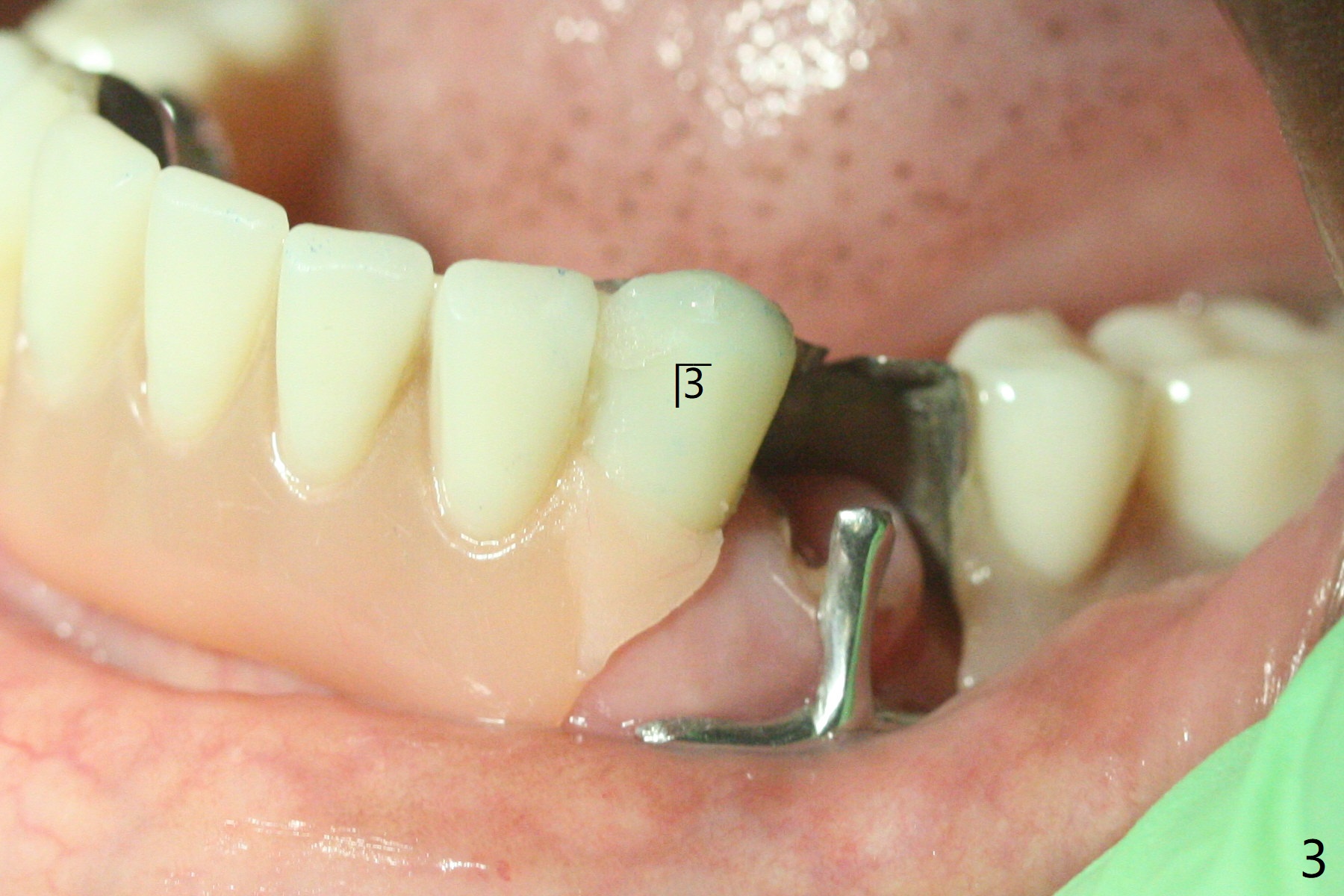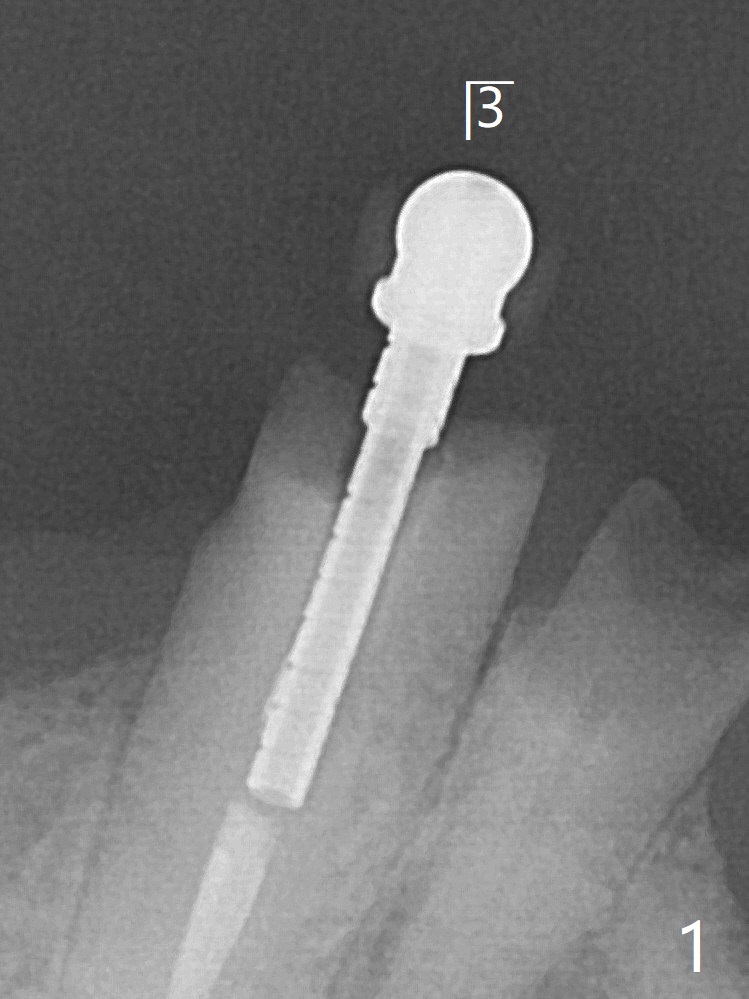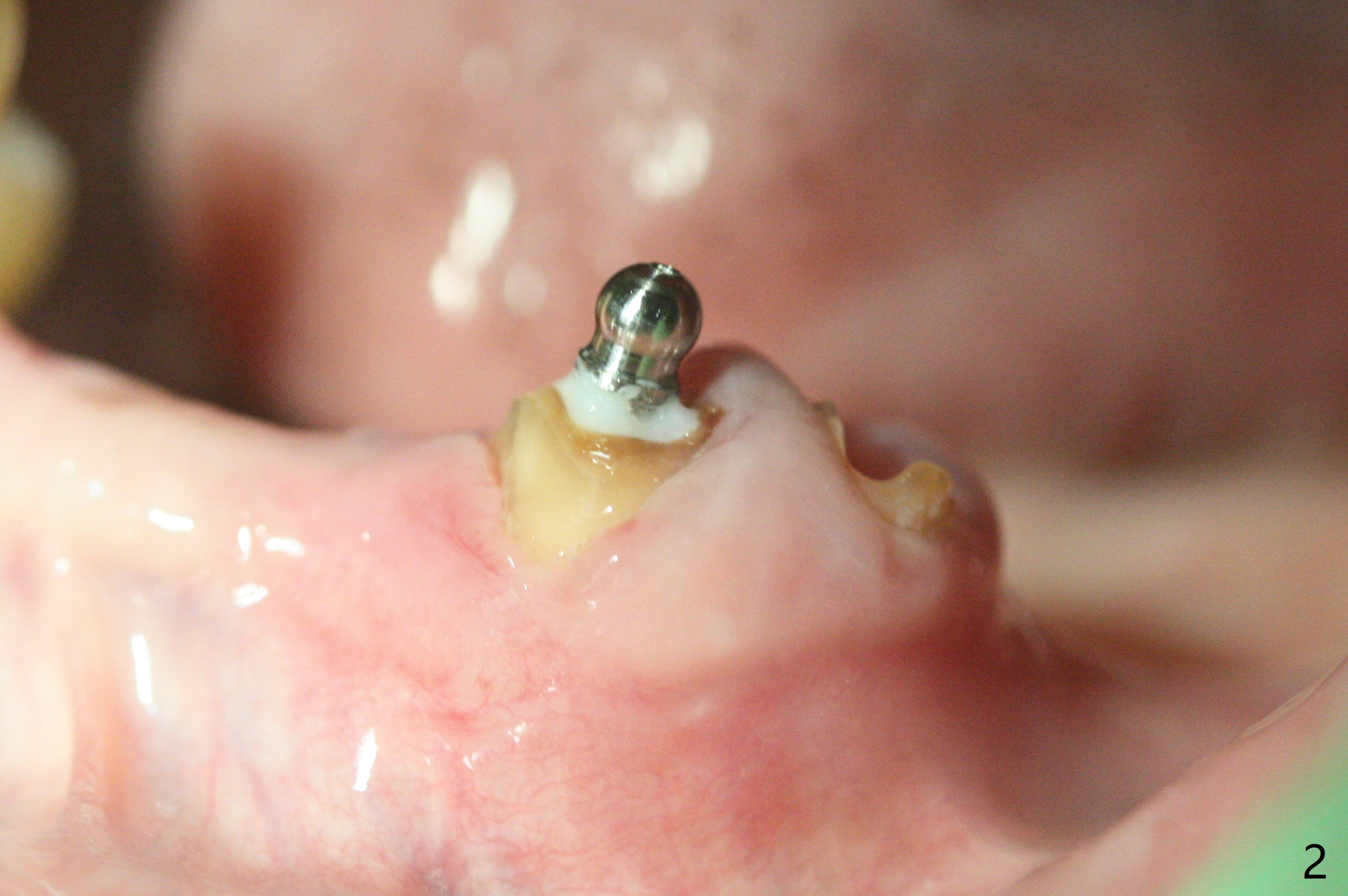 病人回来在左下3制备带球帽桩(图一),后来钻深些,欠缺的是没有使用countersink钻头,桩好像没有完全就位(图二),安置托牙牙时有垂直距离困难(图三)。下次预约拔除疼痛4,即刻植牙(SM),如果稳定性好,即刻放置球状基台,软衬里。