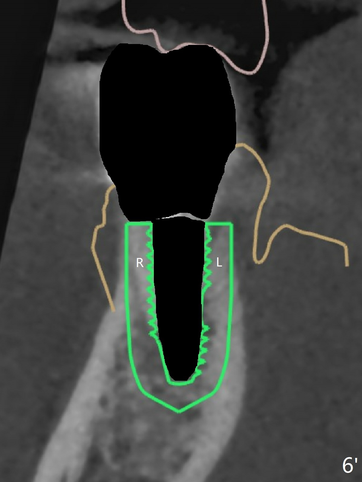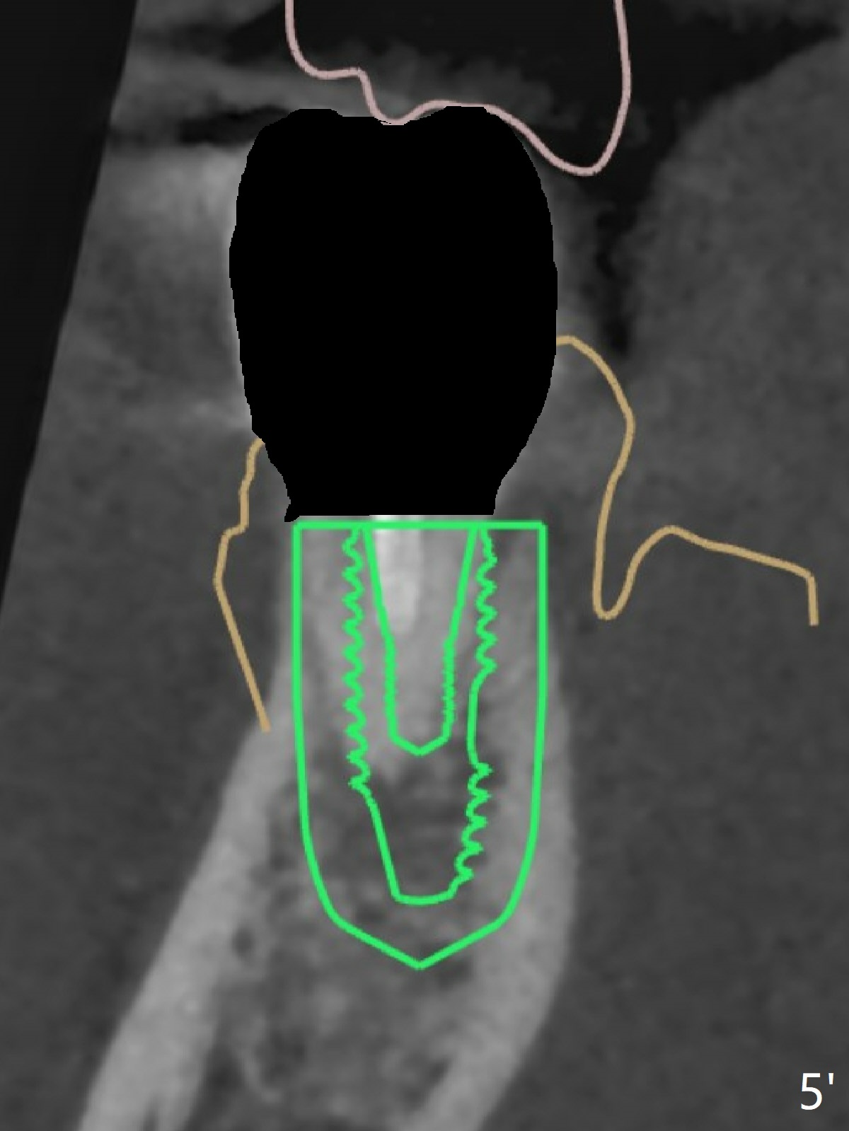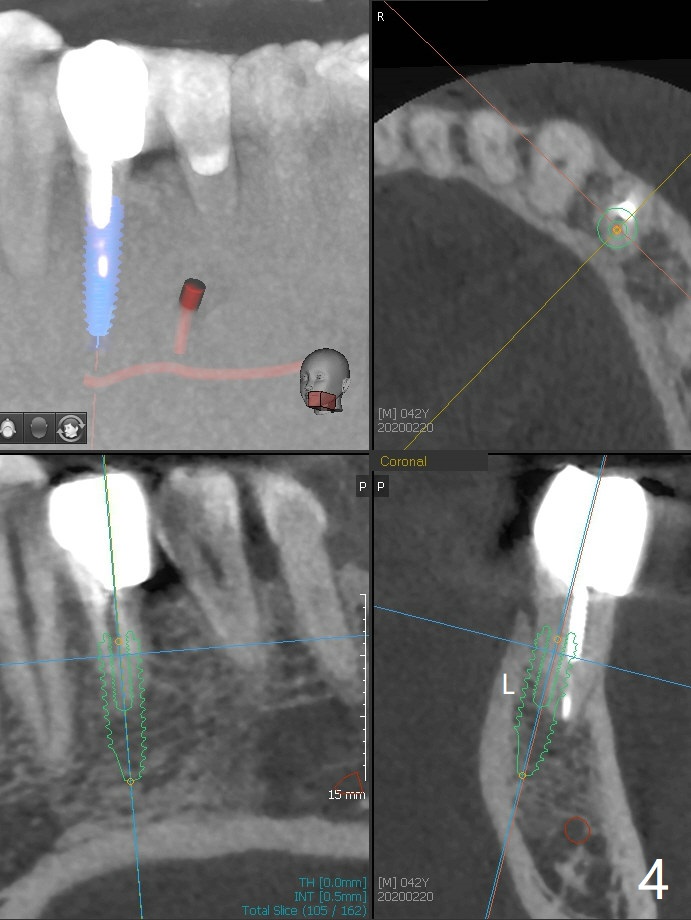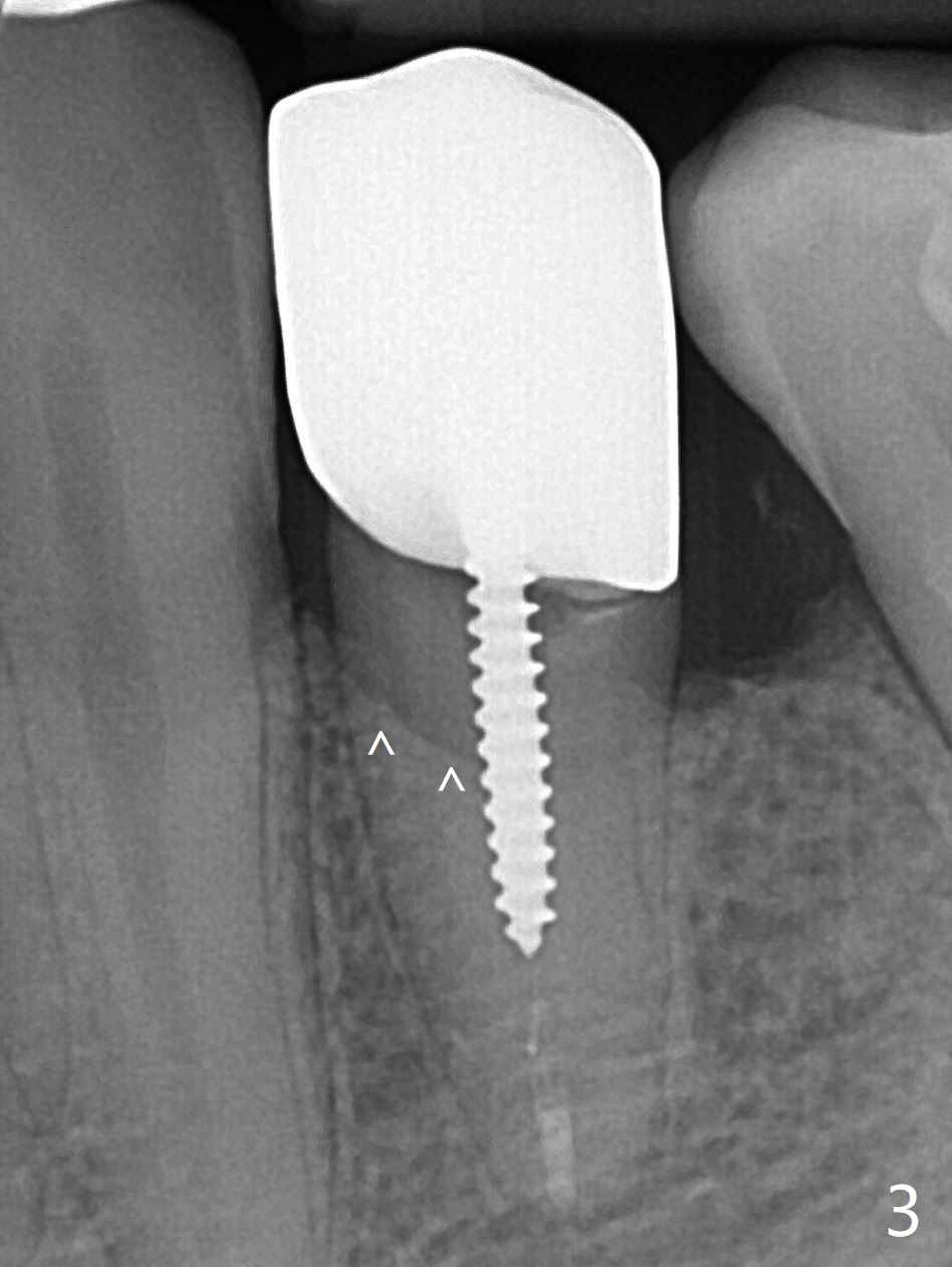 A 42-year-old man has been our patient for 3-4 years (Fig.1). An asymptomatic fistula develops lingual to the tooth #21 (Fig.2). An oblique fracture line appears to be next to a post (Fig.3 ^). A 3.5x11.5 mm implant seems to be able to be placed immediately lingual to the thick lingual plate with guide (Fig.4 L). No buccal deviation will occur with sufficient buccal gap. Design of an immediate implant at #21 (coronal section, Fig.5). In fact the root remains in place first (i.e., extract the crown first, Fig.5'). When osteotomy is done with the last drill 4x11.5 mm, there will be no deviation because of even counteraction between the buccal root and the lingual plate (Fig.6'). Then the root will be removed. But the 4.5x11.5 mm implant may be deviated buccal because of implant engagement into the lingual plate without buccal counteraction. Therefore, a 4x13 mm implant will be placed following 3.5x13 mm (last) drill. The implant is placed between the mesial and distal walls (Fig.7 sagittal section).